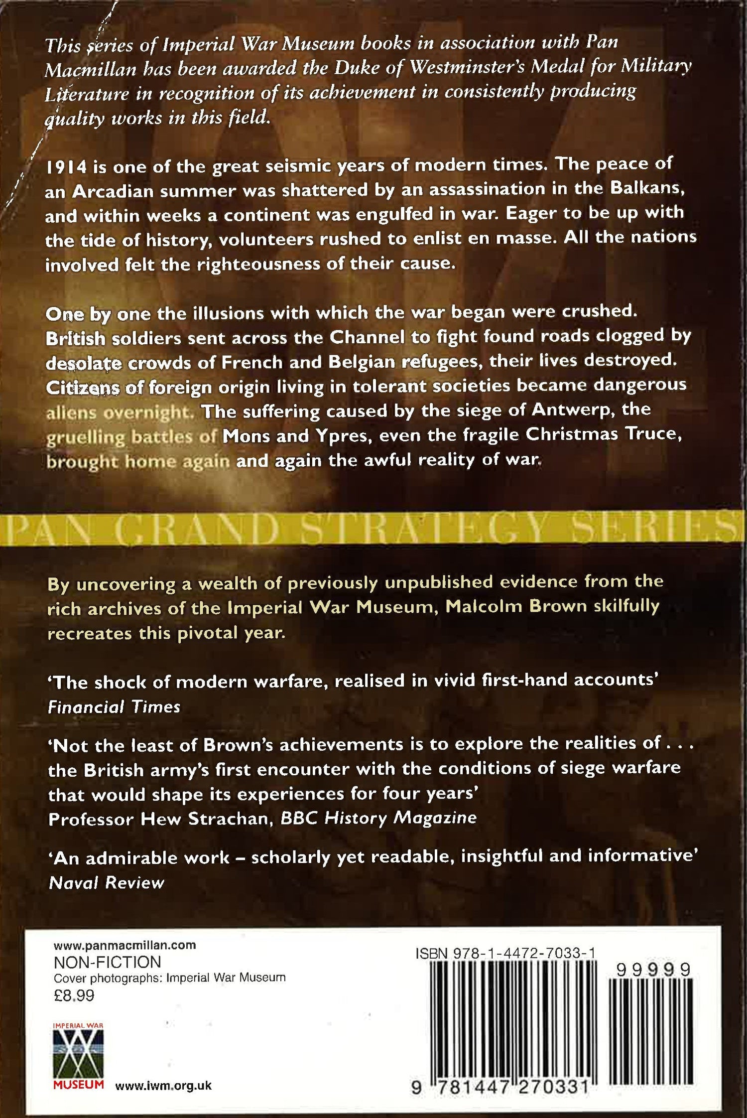 In 1914 the summer peace was shattered by an assassination in the Balkans and, within weeks, a continent was engulfed in war. Eager volunteers rushed to enlist. All the nations involved felt the righteousness of their cause, and everybody believed the fighting would be over in weeks. The reality was very different. War that seemed glorious in August had become hellish by September. British soldiers sent across the Channel found the roads clogged by desolate crowds of French and Belgian refugees, their lives destroyed. The suffering caused by the siege of Antwerp, the gruelling battles of Mons and Ypres, even the fragile Christmas Truce, brought home the awful reality of war. Using new letters and diaries from the archives of the Imperial War Museum, Malcolm Brown skilfully recreates this pivotal year through the moving experiences of men and women who felt the war first-hand, vividly capturing the brutal reality of war as well as moments of great humanity.