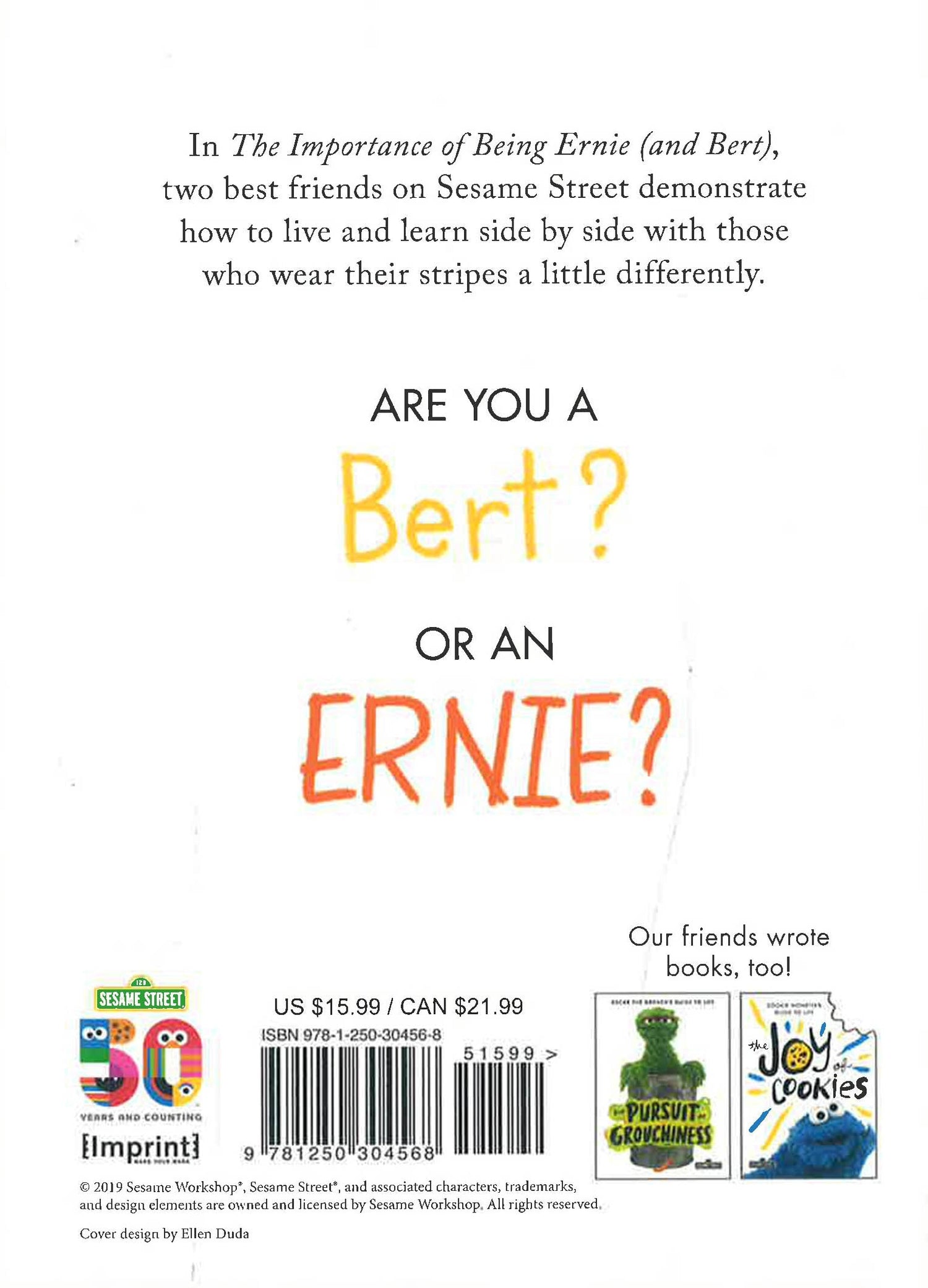 Bert and Ernie have been friends and roommates on Sesame Street for decades, despite very different approaches to life? challenges and joys. One collects jokes, the other collects paperclips. One loves pigeons, the other his Rubber Duckie. One sees the bathtub half-full, the other needs to empty it so he can give it a good scrub. But they both agree that having a best buddy is worth all the daily ups and downs.