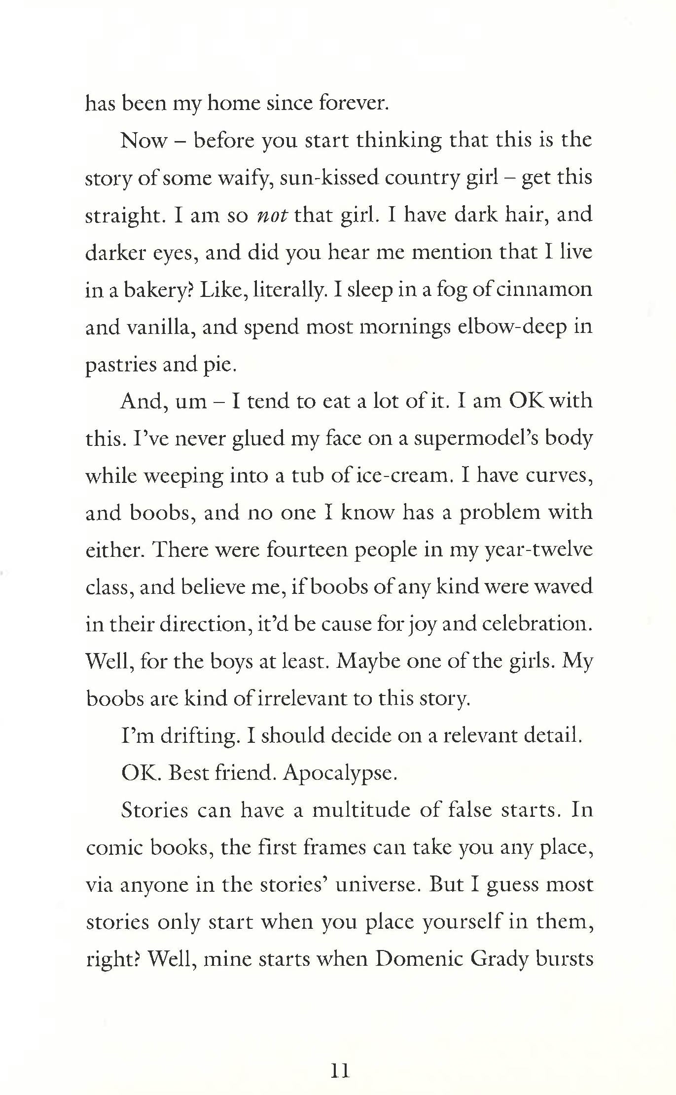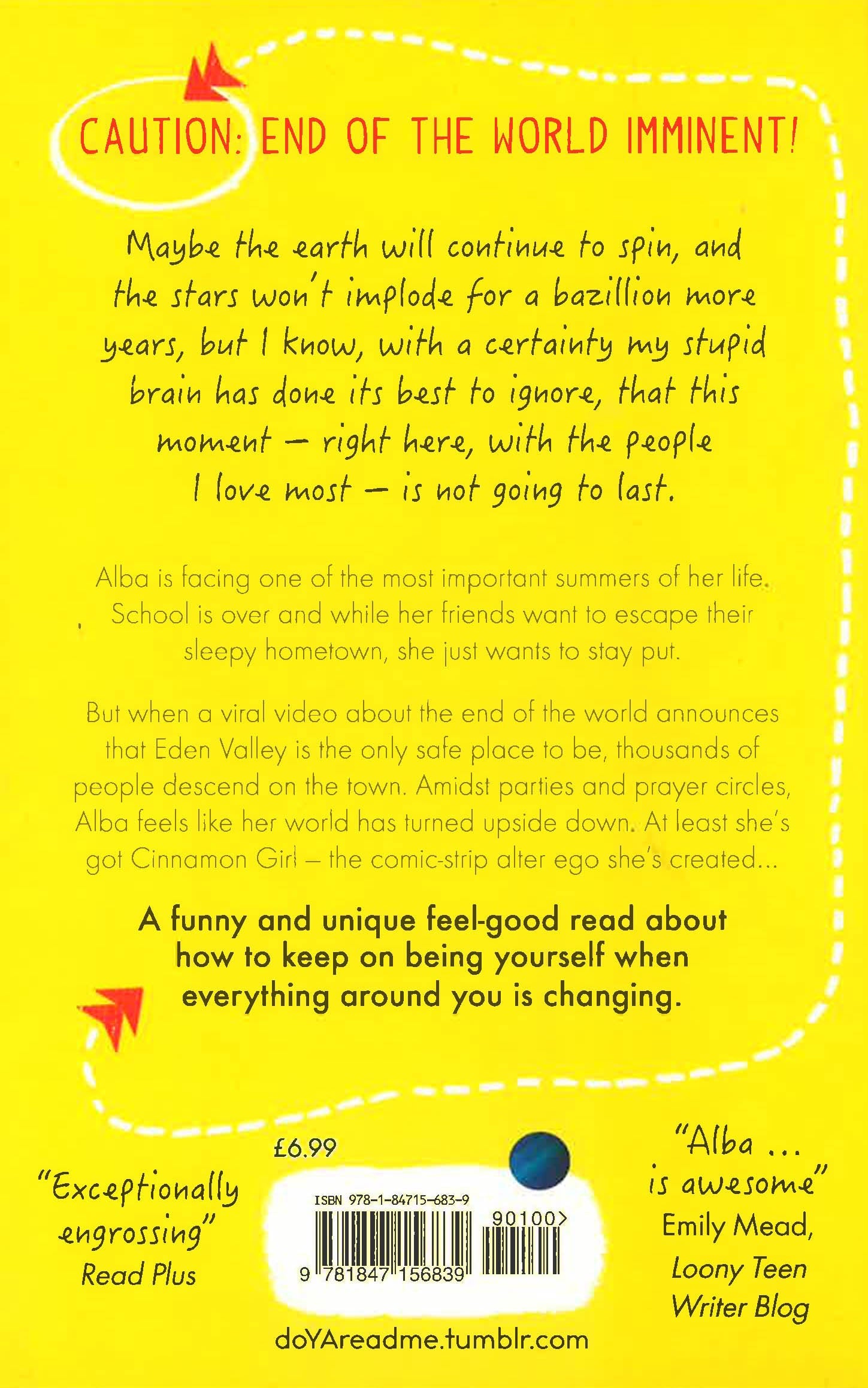 Maybe the earth will continue to spin, and the stars won't implode for a bazillion more years, but I know, with a certainty my stupid brain has done its best to ignore, that this moment - right here, with the people I love most - is not going to last." Alba is facing one of the most important summers of her life. School is over and while her friends want to escape their sleepy hometown, she just wants to stay put. But when a viral video about the end of the world announces that Eden Valley is the only safe place to be, thousands of people descend on the town. Amidst parties and prayer circles, Alba feels like her world has turned upside down. At least she's got Cinnamon Girl - the comic-strip alter ego she's created... A funny and unique feel-good read about how to keep on being yourself when everything around you is changing, perfect for fans of Rainbow Rowell, Non Pratt and John Green.