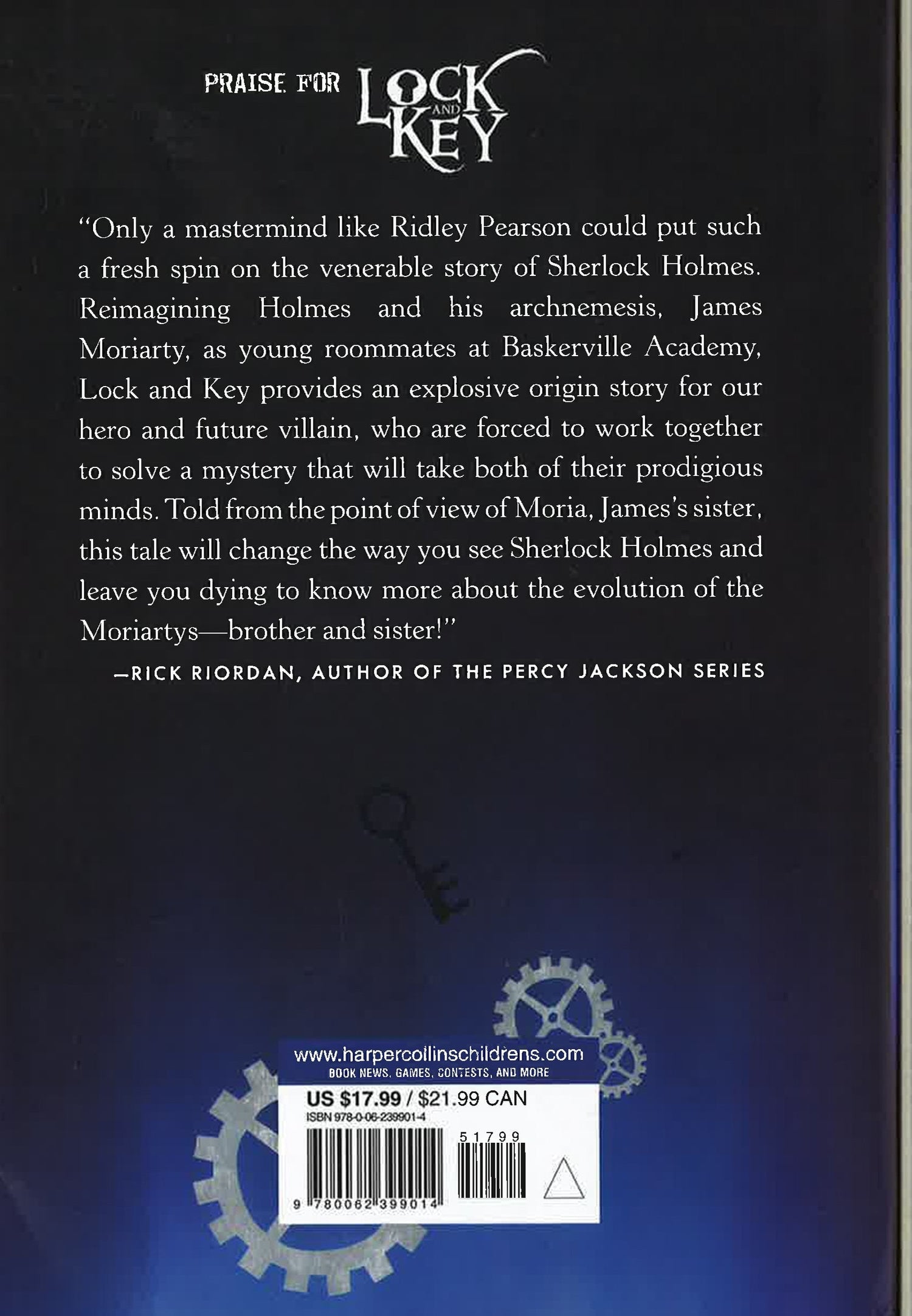 The New York Times bestselling author of the Peter and the Starcatchers and Kingdom Keepers series, Ridley Pearson, brings us the riveting first tale of the Lock and Key trilogy about the origins of the rivalry between literature’s most famous enemies - Sherlock Holmes and James Moriarty, told from the perspective of James’s observant little sister, Moria.Before James grew up to be a ruthless, remorseless villain, he was a curious boy from Boston, with a penchant for trouble and an acid tongue. Thrown into a boarding school against his wishes, James winds up rooming with a most unlikely companion: a lanky British know-it-all named Sherlock Holmes (“Lock” to his friends). An heirloom Bible, donated by the Moriarty family more than a hundred years ago, has gone missing, and it doesn’t take long for the two to find themselves embroiled in the school-wide scandal.The school is on lockdown until it’s found, strange clues keep finding their way to James, and a secret society lurks behind it all. It’s a brave new reimagining of the Sherlock Holmes series as only master of suspense Ridley Pearson could envision. As Rick Riordan, author of the Percy Jackson series, says, “This tale will change the way you see Sherlock Holmes and leave you dying to know more.”