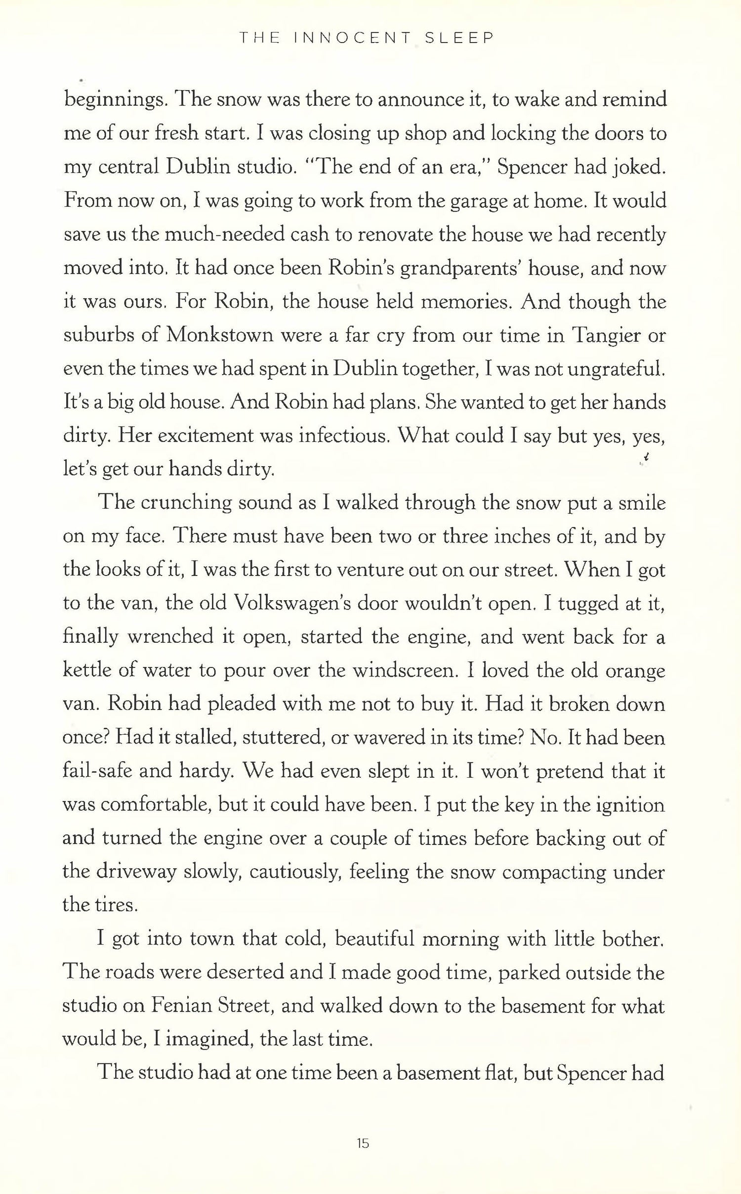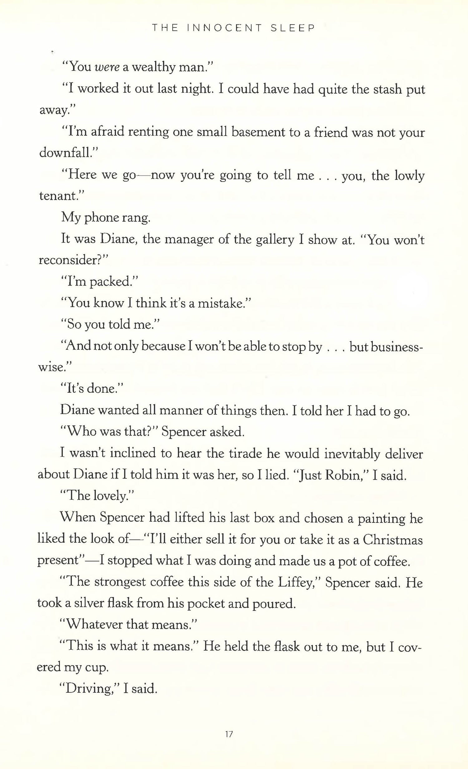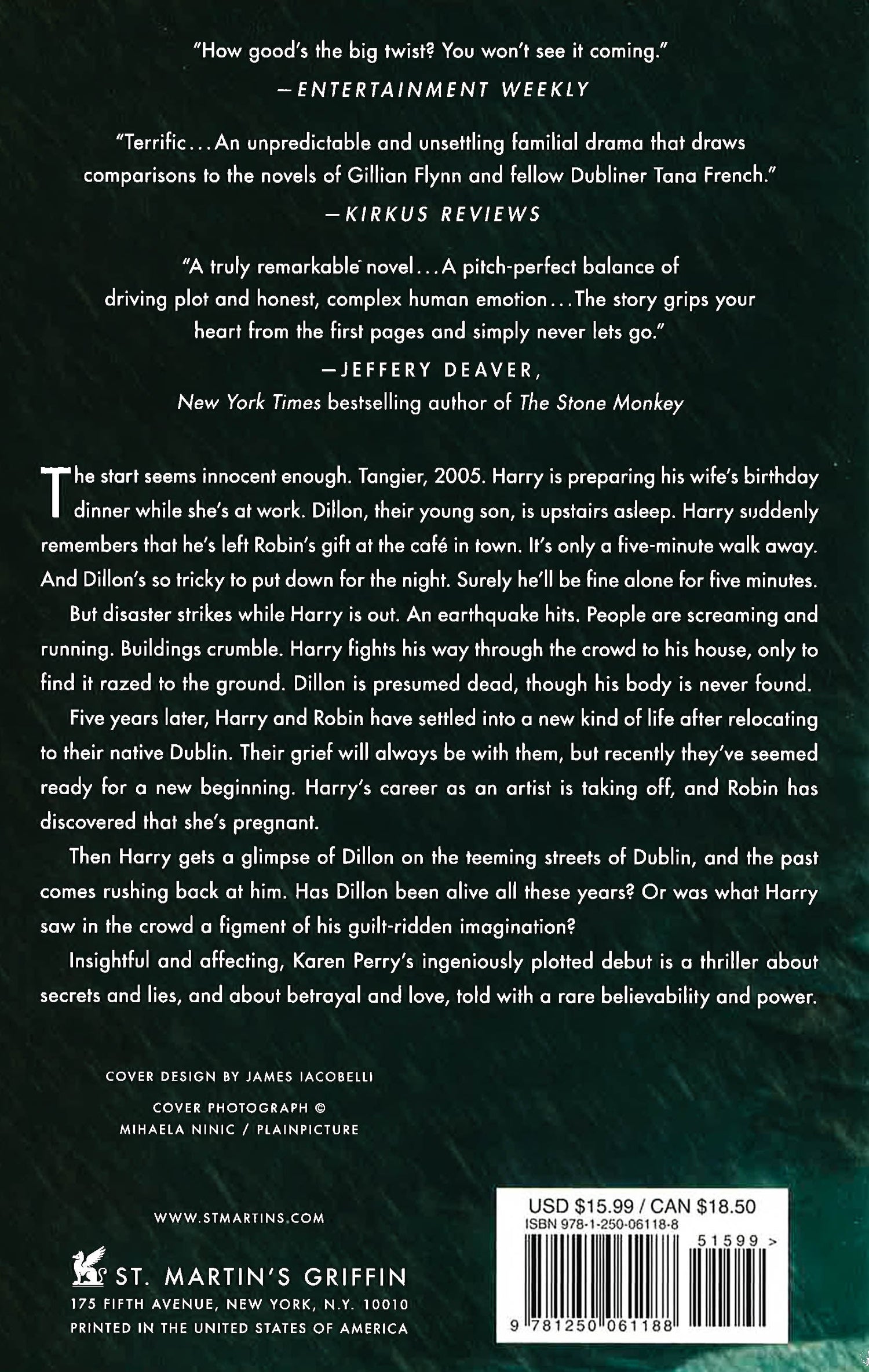 Tangiers. Harry is preparing his wife's birthday dinner while she is still at work and their son, Dillon, is upstairs asleep in bed. Harry suddenly remembers that he's left Robin's gift at the café in town. It's only a five minute walk away and Dillon's so tricky to put down for the night, so Harry decides to run out on his own and fetch the present.Disaster strikes. An earthquake hits, buildings crumble, people scream and run. Harry fights his way through the crowd to his house, only to find it razed to the ground. Dillon is presumed dead, though his body is never found.Five years later, Harry and Robin have settled into a new kind of life after relocating to their native Dublin. Their grief will always be with them, but lately it feels as if they're ready for a new beginning. Harry's career as an artist is taking off and Robin has just realized that she's pregnant.But when Harry gets a glimpse of Dillon on the crowded streets of Dublin, the past comes rushing back at both of them. Has Dillon been alive all these years? Or was what Harry saw just a figment of his guilt-ridden imagination? With razor-sharp writing, Karen Perry's The Innocent Sleep delivers a fast-paced, ingeniously plotted thriller brimming with deception, doubt, and betrayal.
