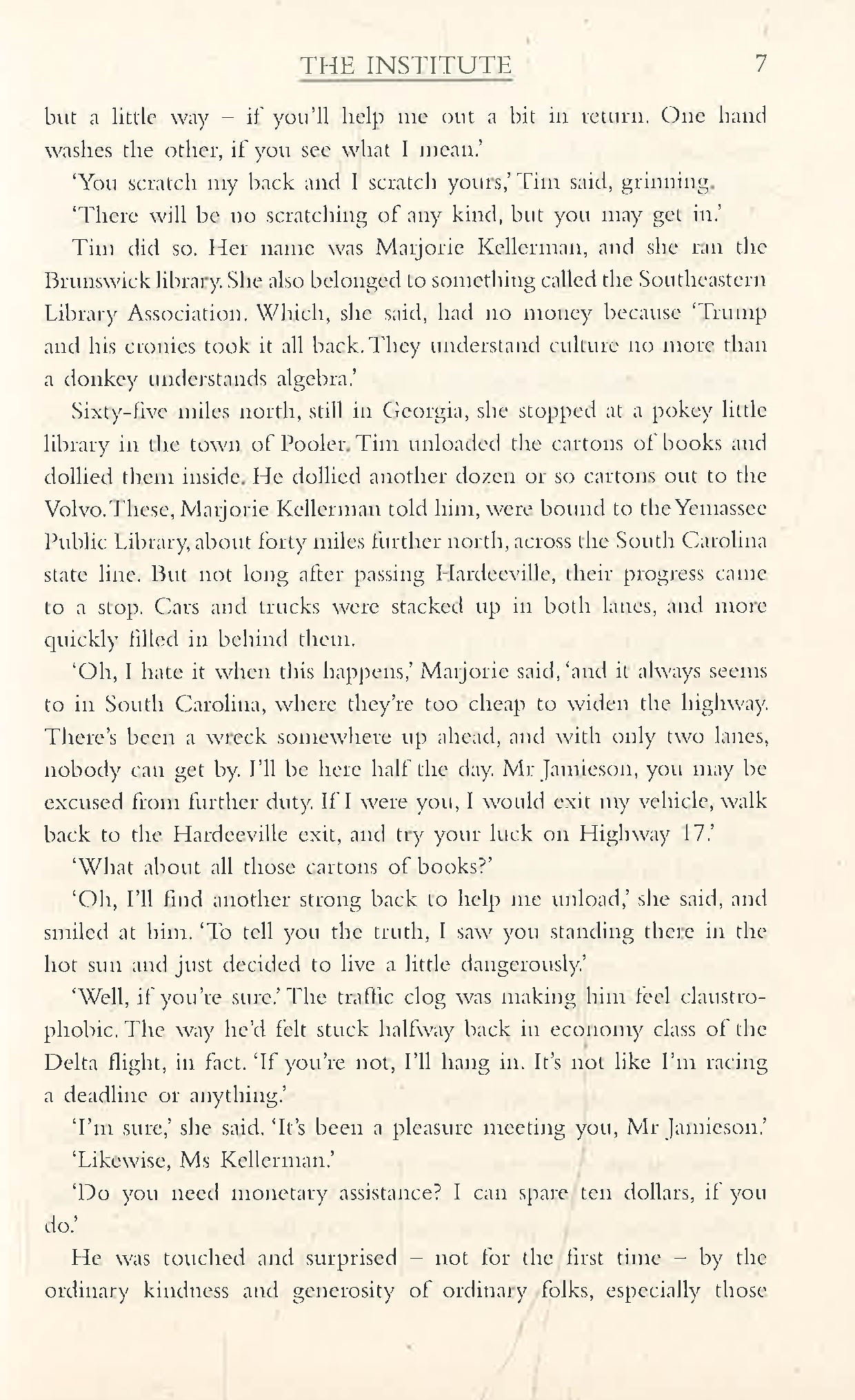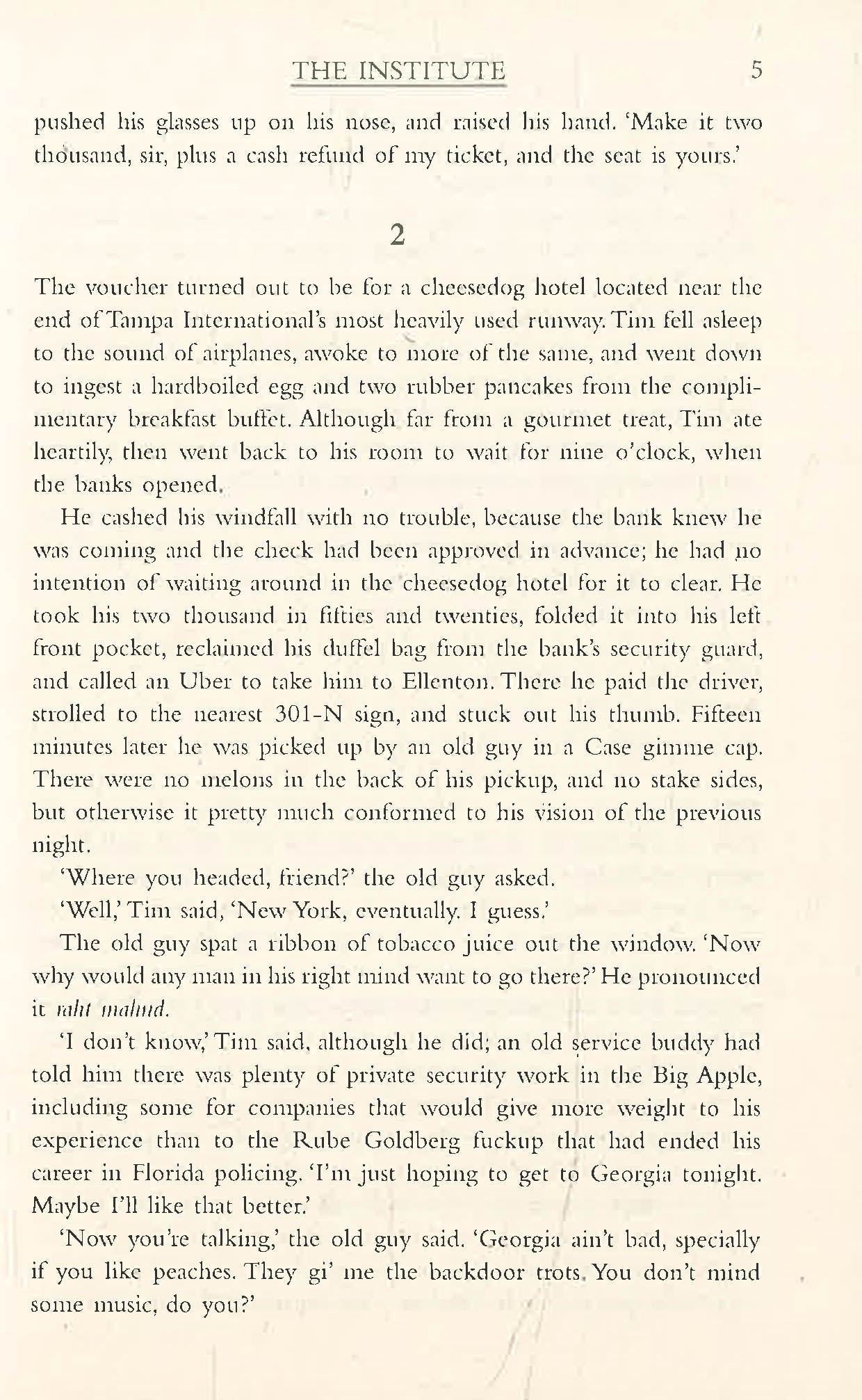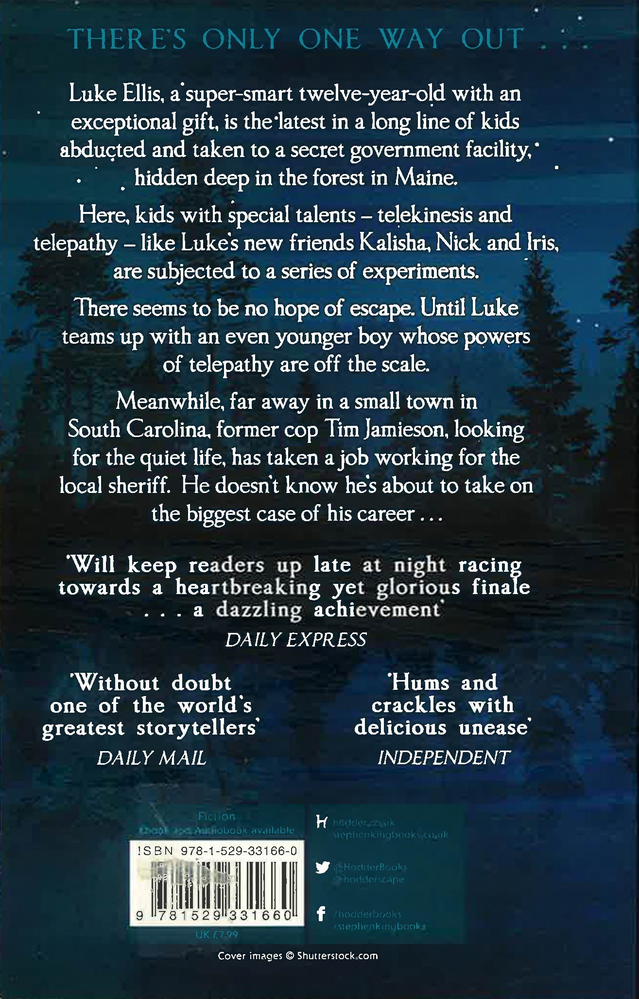 Deep in the woods of Maine, there is a dark state facility where kids, abducted from across the United States, are incarcerated. In the Institute they are subjected to a series of tests and procedures meant to combine their exceptional gifts - telepathy, telekinesis - for concentrated effect. Luke Ellis is the latest recruit. He's just a regular 12-year-old, except he's not just smart, he's super-smart. And he has another gift which the Institute wants to use... Far away in a small town in South Carolina, former cop Tim Jamieson has taken a job working for the local sheriff. He's basically just walking the beat. But he's about to take on the biggest case of his career. Back in the Institute's downtrodden playground and corridors where posters advertise 'just another day in paradise', Luke, his friend Kalisha and the other kids are in no doubt that they are prisoners, not guests. And there is no hope of escape. But great events can turn on small hinges and Luke is about to team up with a new, even younger recruit, Avery Dixon, whose ability to read minds is off the scale. While the Institute may want to harness their powers for covert ends, the combined intelligence of Luke and Avery is beyond anything that even those who run the experiments - even the infamous Mrs Sigsby - suspect. Thrilling, suspenseful, heartbreaking, THE INSTITUTE is a stunning novel of childhood betrayed and hope regained.