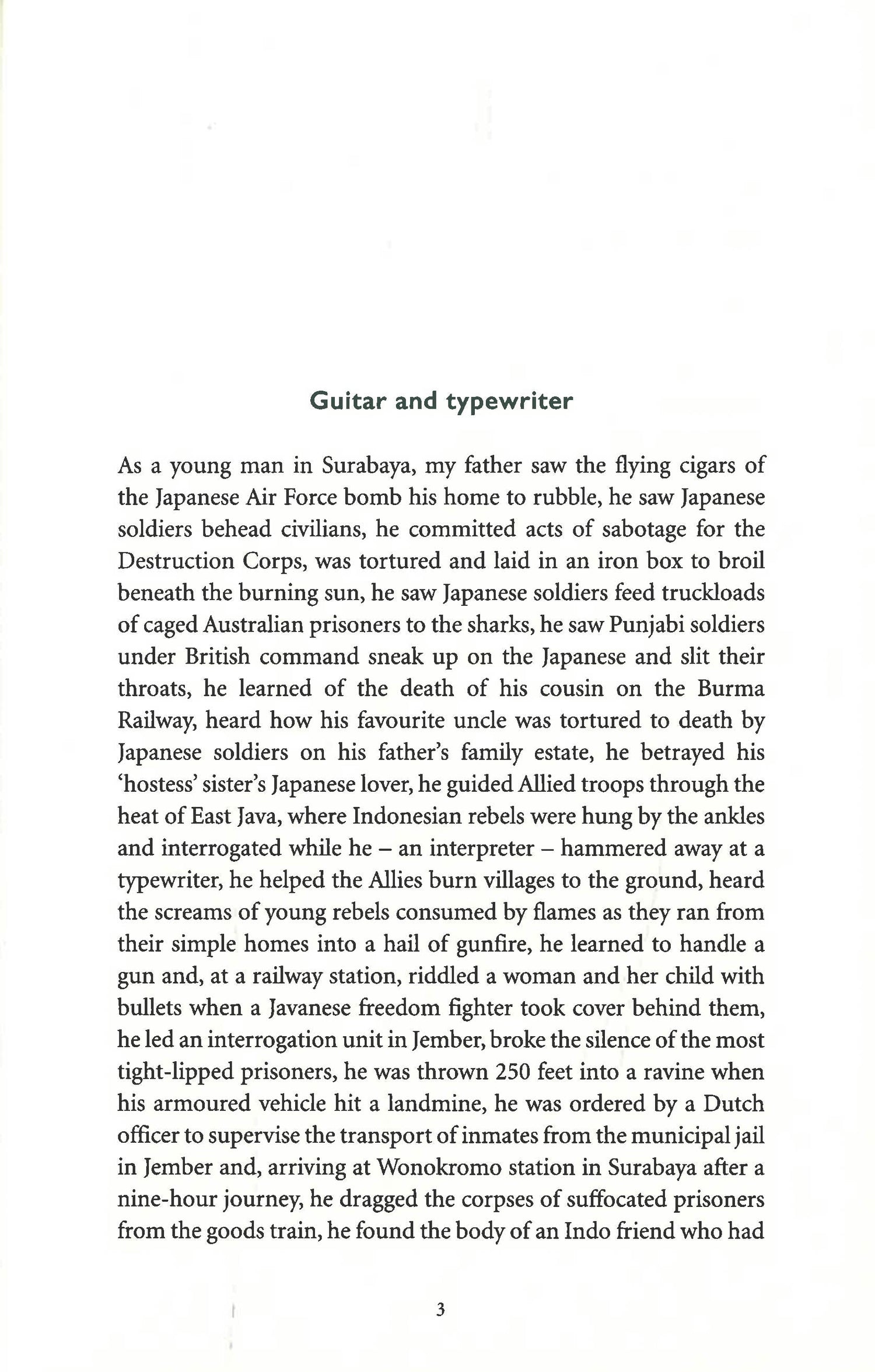 In this unsparing family history, Alan distils his father's life in the Dutch East Indies into one furious utterance. He reads about his work as an interpreter during the war with Japan, his life as an assassin, and his decision to murder Indonesians in the service of the Dutch without any conscience. How he fled to the Netherlands to escape being executed as a traitor and met Alan's mother soon after. As he reads his father's story Alan begins to understand how war transformed his father into the monster he knew.