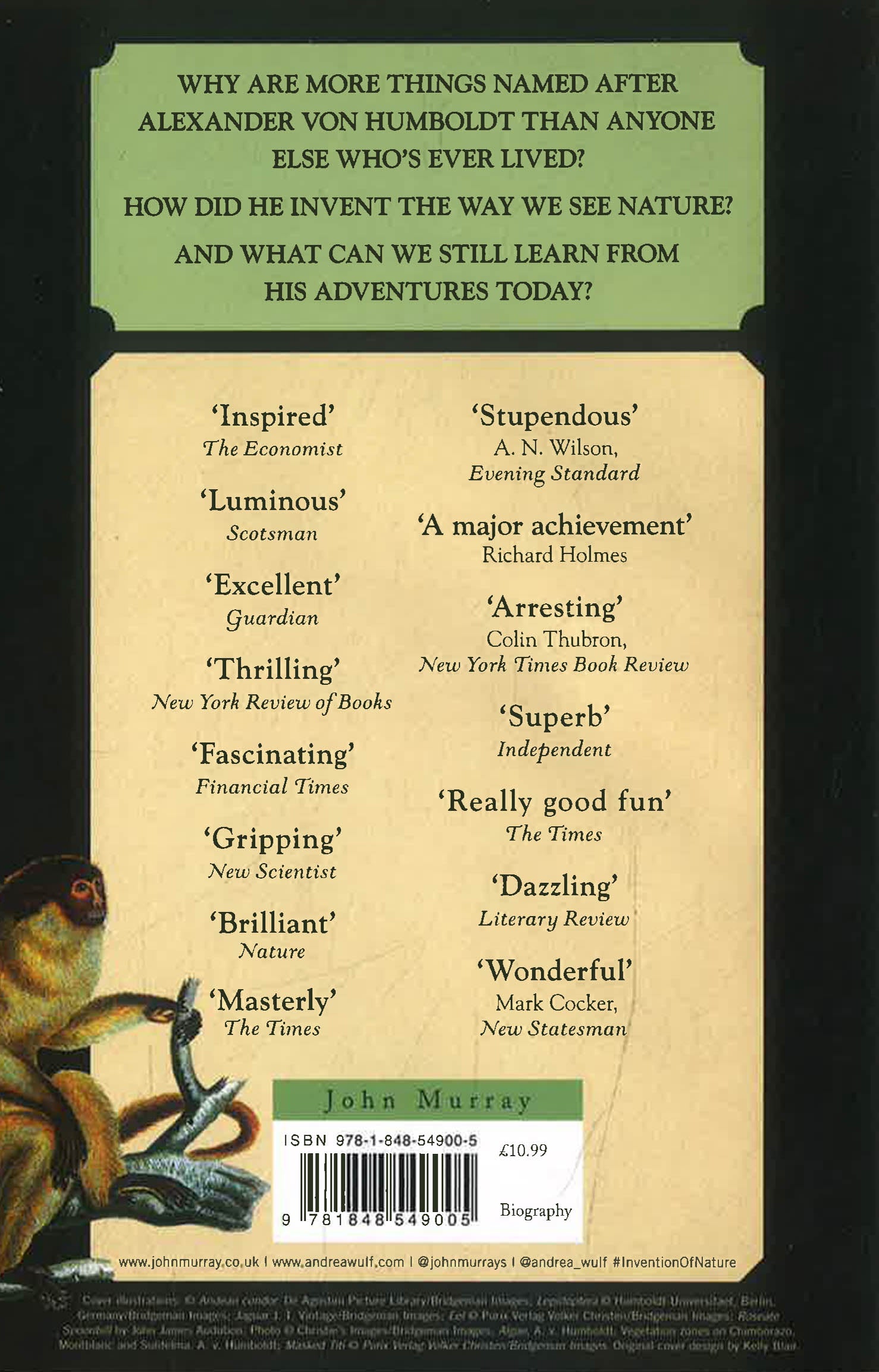 Alexander von Humboldt (1769-1859) is the great lost scientist - more things are named after him than anyone else. There are towns, rivers, mountain ranges, the ocean current that runs along the South American coast, there's a penguin, a giant squid - even the Mare Humboldtianum on the moon. His colourful adventures read like something out of a Boy's Own story: Humboldt explored deep into the rainforest, climbed the world's highest volcanoes and inspired princes and presidents, scientists and poets alike. Napoleon was jealous of him; Simon Bolivar's revolution was fuelled by his ideas; Darwin set sail on the Beagle because of Humboldt; and Jules Verne's Captain Nemo owned all his many books. He simply was, as one contemporary put it, 'the greatest man since the Deluge'. Taking us on a fantastic voyage in his footsteps - racing across anthrax-infected Russia or mapping tropical rivers alive with crocodiles - Andrea Wulf shows why his life and ideas remain so important today. Humboldt predicted human-induced climate change as early as 1800, and The Invention of Nature traces his ideas as they go on to revolutionize and shape science, conservation, nature writing, politics, art and the theory of evolution. He wanted to know and understand everything and his way of thinking was so far ahead of his time that it's only coming into its own now. Alexander von Humboldt really did invent the way we see nature.