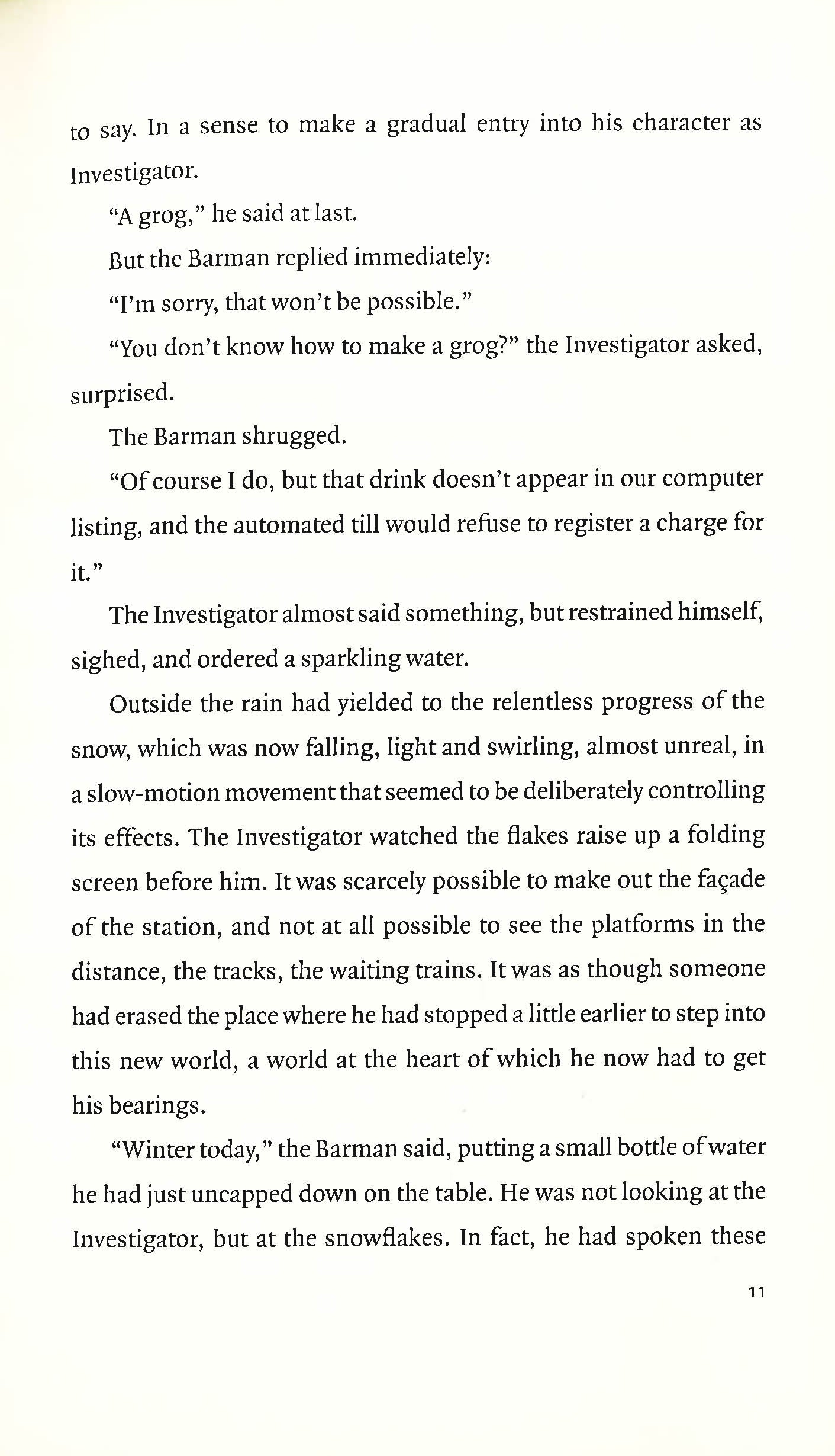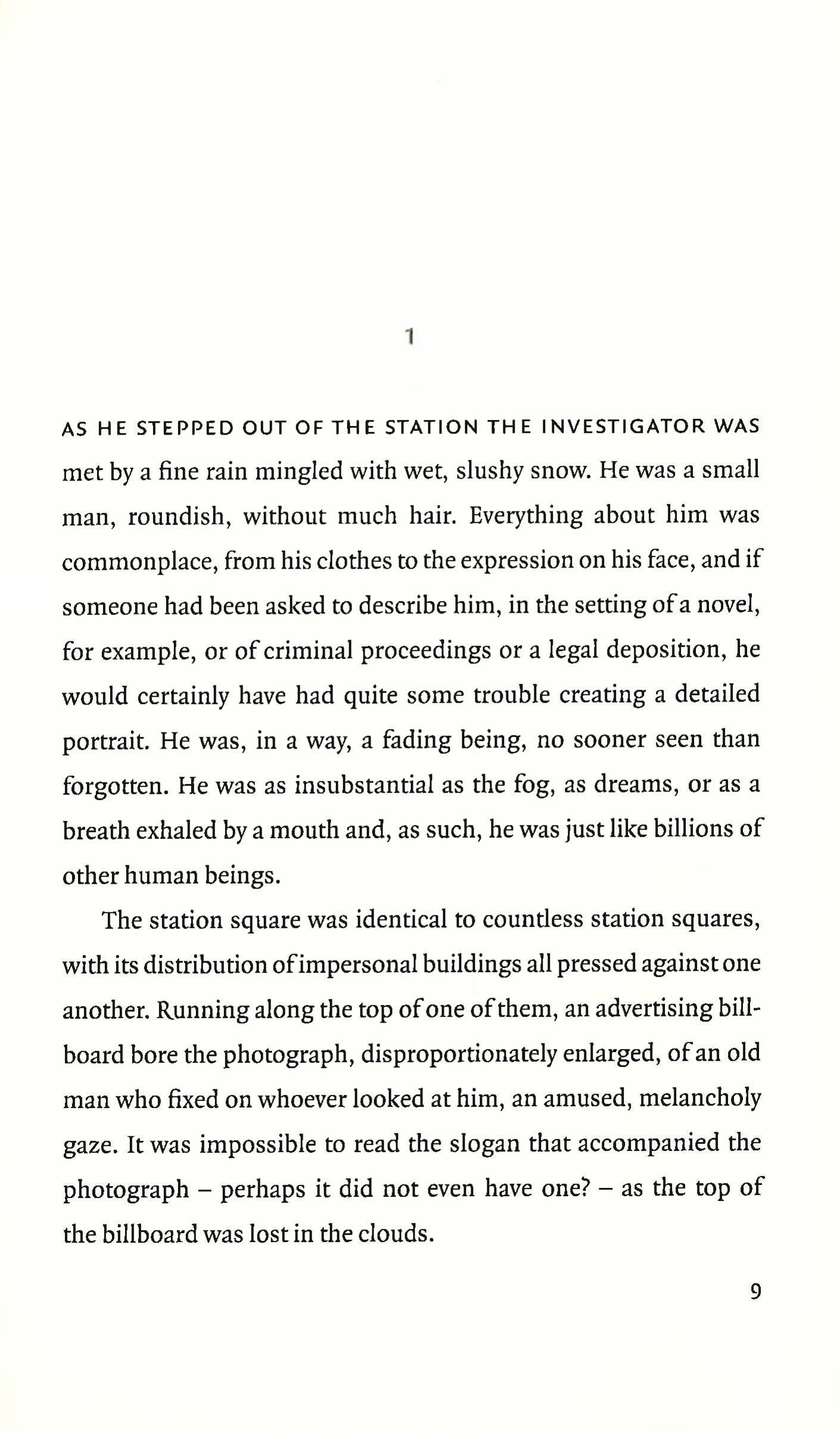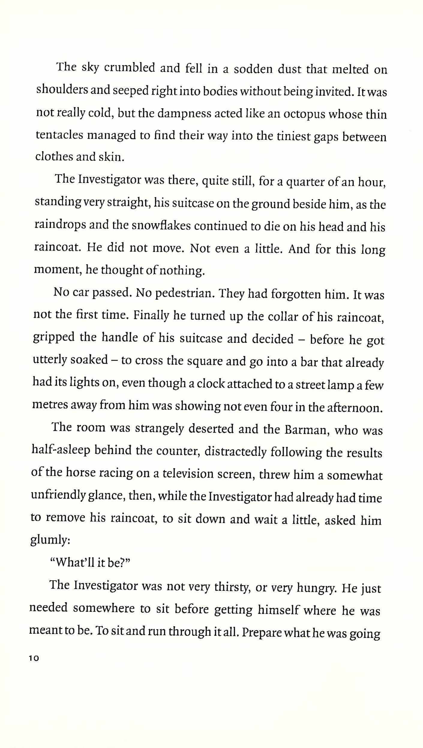 The Investigator is despatched to a provincial town to find out the truth behind a disturbing spate of suicides amongst employees of The Firm. But from the moment he steps off the train, he finds himself in a world that is alien, unrecognisable, and diabolically complex. From the hostile weather and the fickle hospitality at Hotel Hope to the town's bewildering inhabitants, everything seems to be against him to the point where he wonders whether he is trapped in a recurring nightmare, or has passed into the realm of death itself. Cold, hungry and humiliated, and always one step behind, he nevertheless remains determined to find the only man he can hold to account - The Firm's legendary but elusive founder. The Investigation is an enthralling fable in which our own world is turned on its head, and where the only answers are more questions. Philippe Claudel - author of Brodeck's Report and Monsieur Linh and His Child - is one of Europe's most daring and versatile novelists.