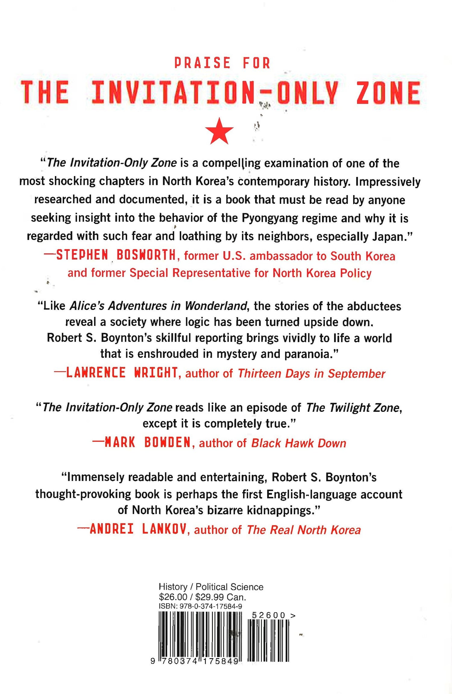Throughout the late 1970s and early '80s, dozens of Japanese citizens were abducted from coastal Japanese towns by North Korean commandos. In what proved to be part of a global project, North Korea attempted to reeducate the abductees and train them to spy on the state's behalf. When the project faltered, the abductees were hidden in guarded communities known as "Invitation-Only Zones"-the fiction being that these were exclusive enclaves, not prisons. In 2002, Kim Jong II admitted to kidnapping thirteen Japanese citizens and returned five of them (the other eight, he said, had died). From the moment that Robert S. Boynton first saw a photograph of these men and women, he became obsessed with the window their story provided into the vexed politics of Northeast Asia. In The lnvitation- Only Zone, he untangles the logic behind the kidnappings and shows why some Japanese citizens described them as "their 9/11." He tells the story of how dozens were abducted and reeducated; how they married and had children; and how they lived anonymously as North Korean citizens. He speaks with nationalists, diplomats, abductees, and even crab fishermen, unearthing bizarre North Korean propaganda tactics and the peculiar cultural interests of both counties. A deeply reported, thoroughly researched treatise on the power struggle of one of the most important areas in the global economy, Boynton's keen investigation is riveting and revelatory.