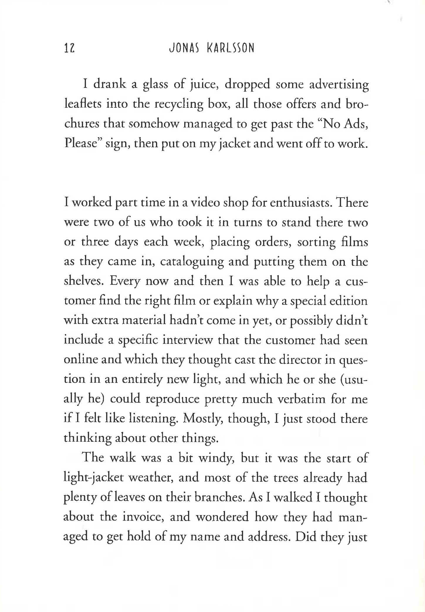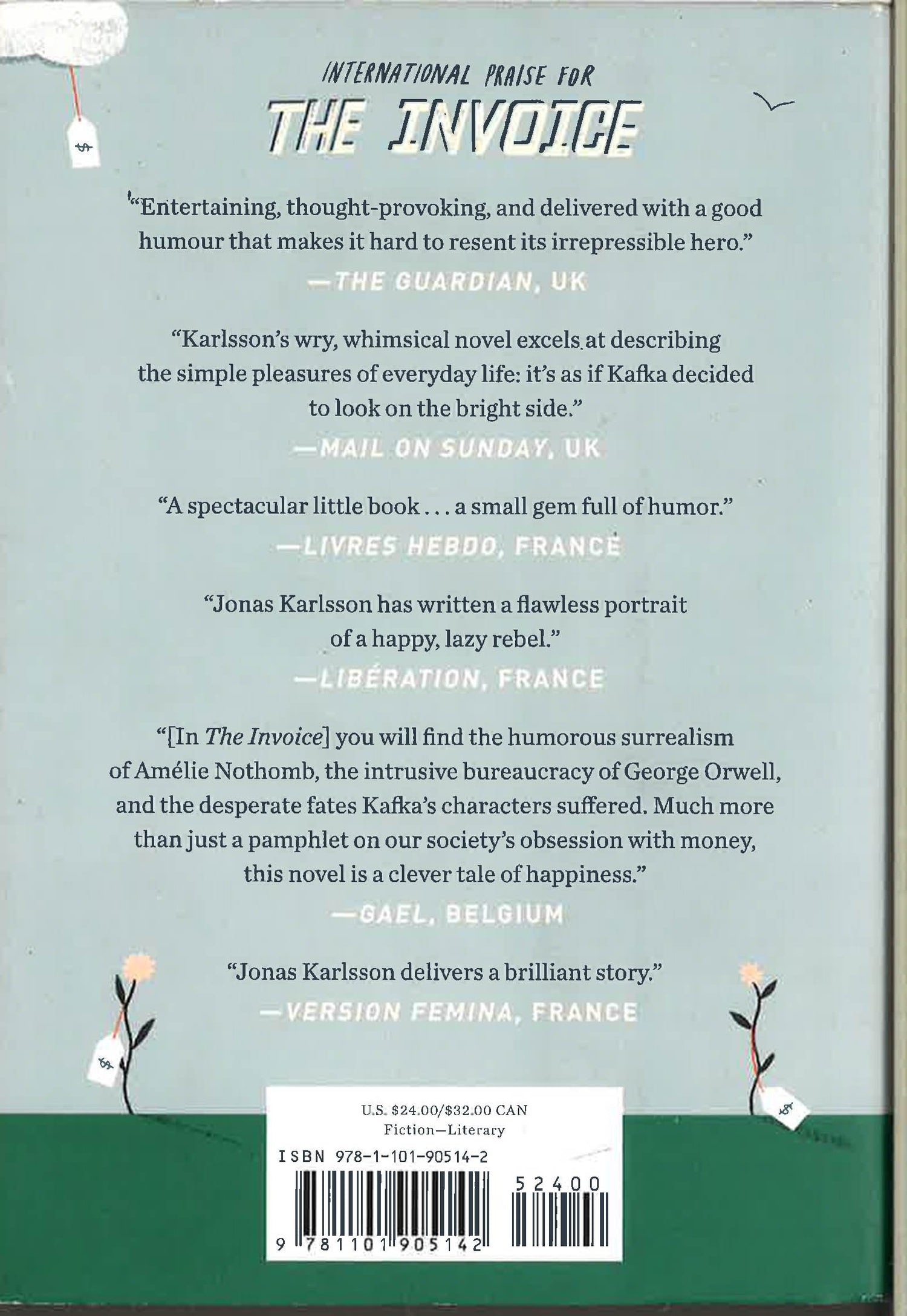 A heartfelt exploration of the cost of life and love--and the importance of the little things--from the author of the international bestseller, The Room Hilarious, profound, and achingly true-to-life, The Invoice explores the true nature of happiness through the eyes of hero you won't soon forget. A passionate film buff, our hero's life revolves around his part-time job at a video store, the company of a few precious friends, and a daily routine that more often than not concludes with pizza and movie in his treasured small space in Stockholm. When he receives an astronomical invoice from a random national bureaucratic agency, everything will tumble into madness as he calls the hotline night and day to find out why he is the recipient of the largest bill in the entire country. What is the price of a cherished memory? How much would you pay for a beautiful summer day? How will our carefree idealist, who is content with so little and has no chance of paying it back, find a way out of this mess? All these questions pull you through The Invoice and prove once again that Jonas Karlsson is simply a master of entertaining, intelligent, and life-affirming work.