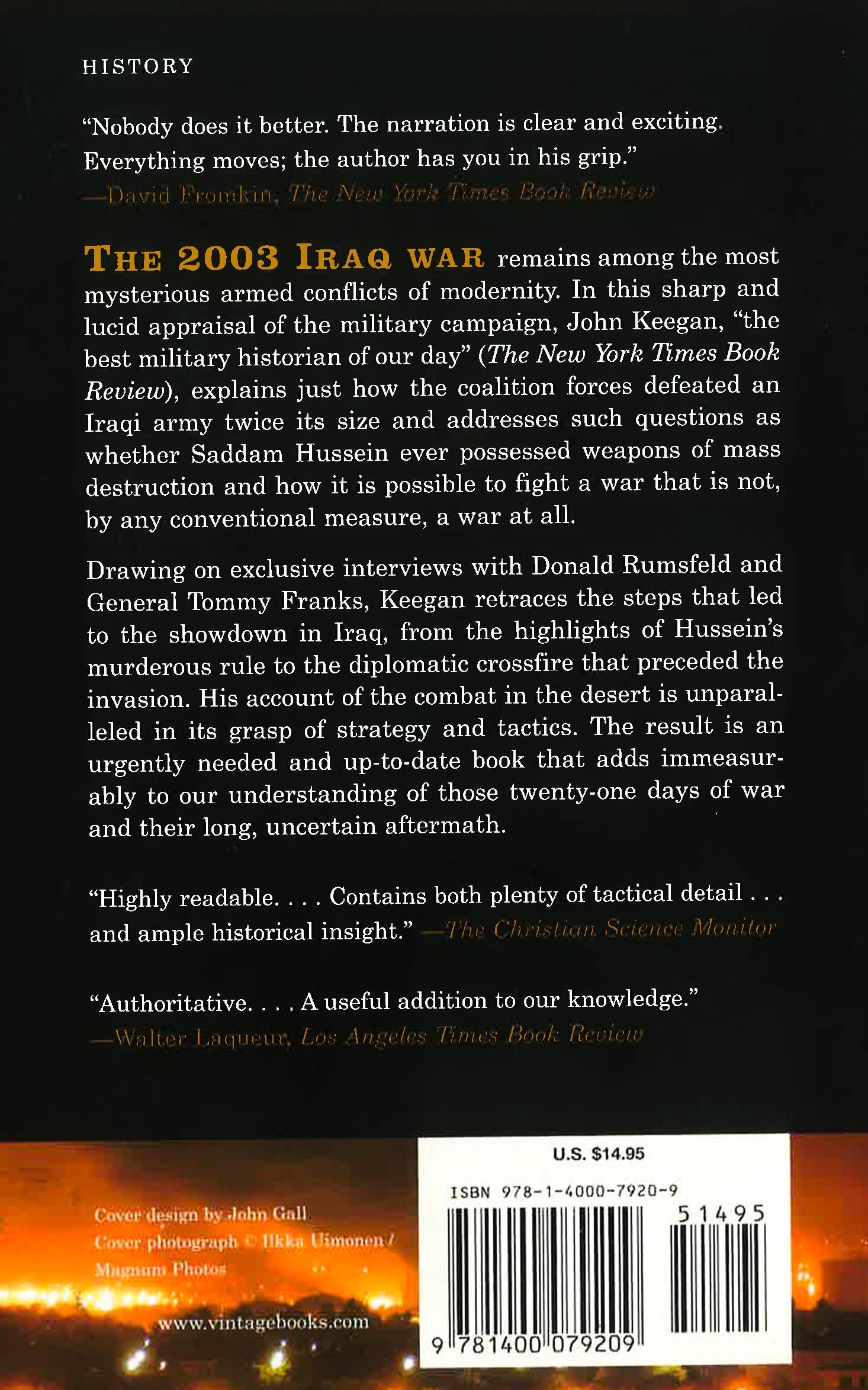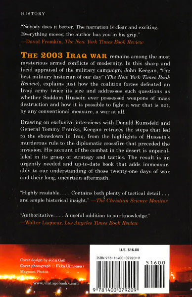 The 2003 Iraq war remains among the most mysterious armed conflicts of modernity. In The Iraq War, John Keegan offers a sharp and lucid appraisal of the military campaign, explaining just how the coalition forces defeated an Iraqi army twice its size and addressing such questions as whether Saddam Hussein ever possessed weapons of mass destruction and how it is possible to fight a war that is not, by any conventional measure, a war at all.Drawing on exclusive interviews with Donald Rumsfeld and General Tommy Franks, Keegan retraces the steps that led to the showdown in Iraq, from the highlights of Hussein's murderous rule to the diplomatic crossfire that preceded the invasion. His account of the combat in the desert is unparalleled in its grasp of strategy and tactics. The result is an urgently needed and up-to-date book that adds immeasurably to our understanding of those twenty-one days of war and their long, uncertain aftermath.