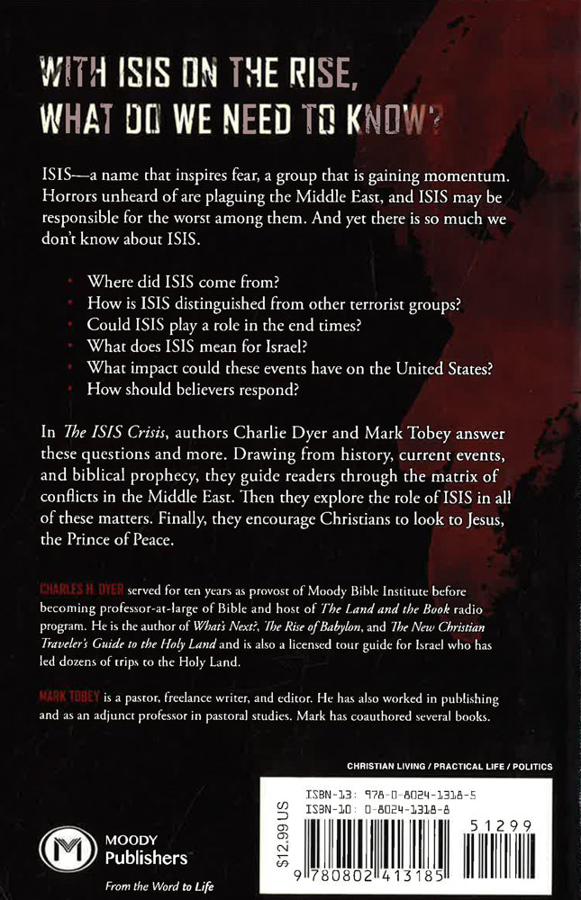In The ISIS Crisis, authors Charles Dyer and Mark Tobey answer these questions and more. Drawing from history, current events, and biblical prophecy, they guide readers through the matrix of conflicts in the Middle East. Then they explore the role of ISIS in all of these matters. Finally, they encourage Christians to look to Jesus, the Prince of Peace.