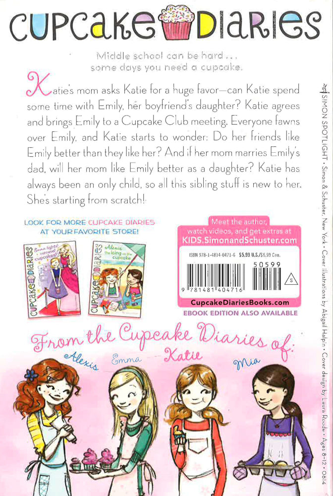 Katie’s mom asks Katie for a huge favor: will she spend some time with Emily, her boyfriend’s daughter? Katie agrees and brings Emily to a Cupcake Club meeting. Things go well—almost too well. Everyone likes Emily so much, Katie wonders if her friends like Emily more than they like her! And if her mom marries Emily’s dad, will Emily become her favorite daughter? Katie is an only child, so all this sibling stuff is new to her. She’s starting from scratch!