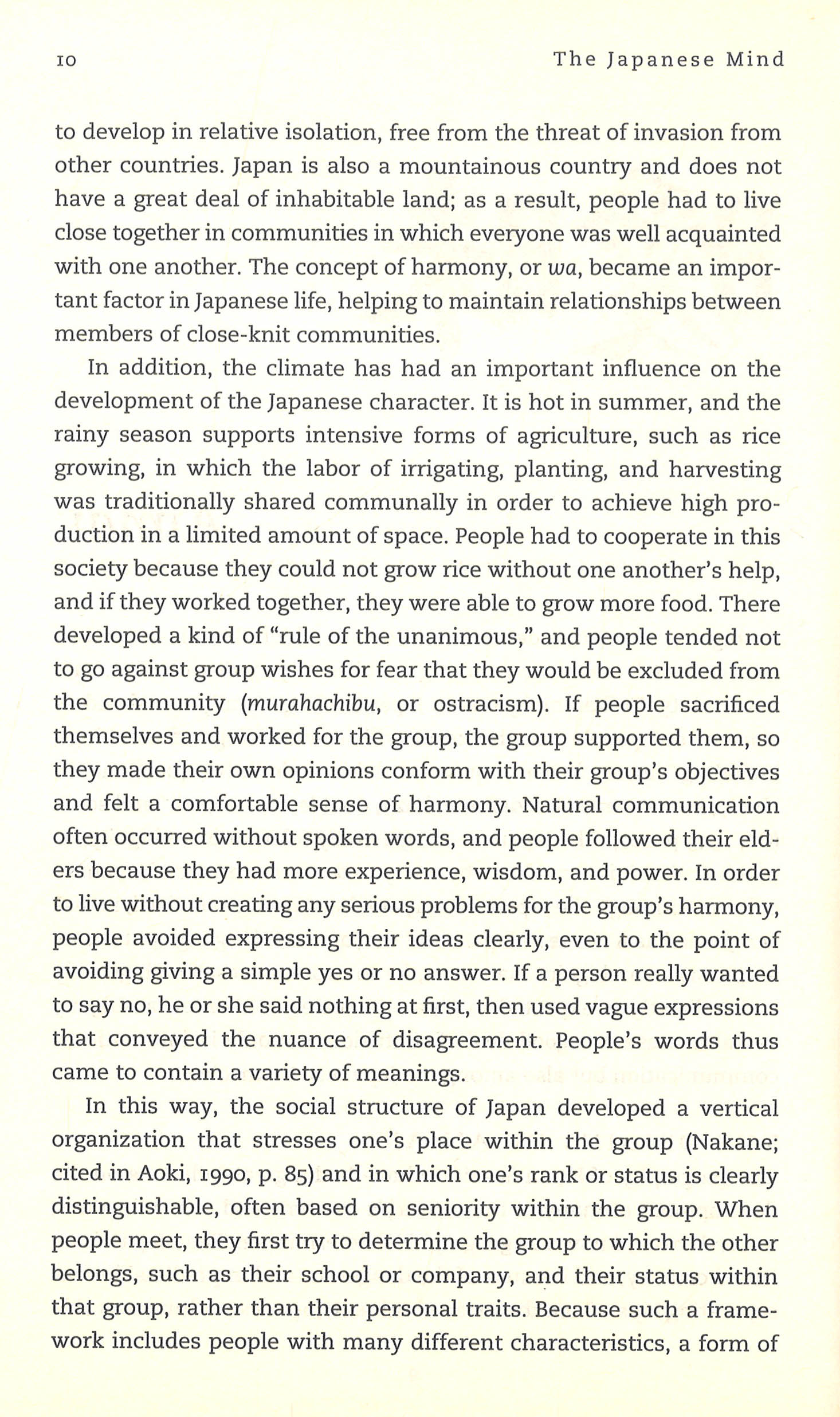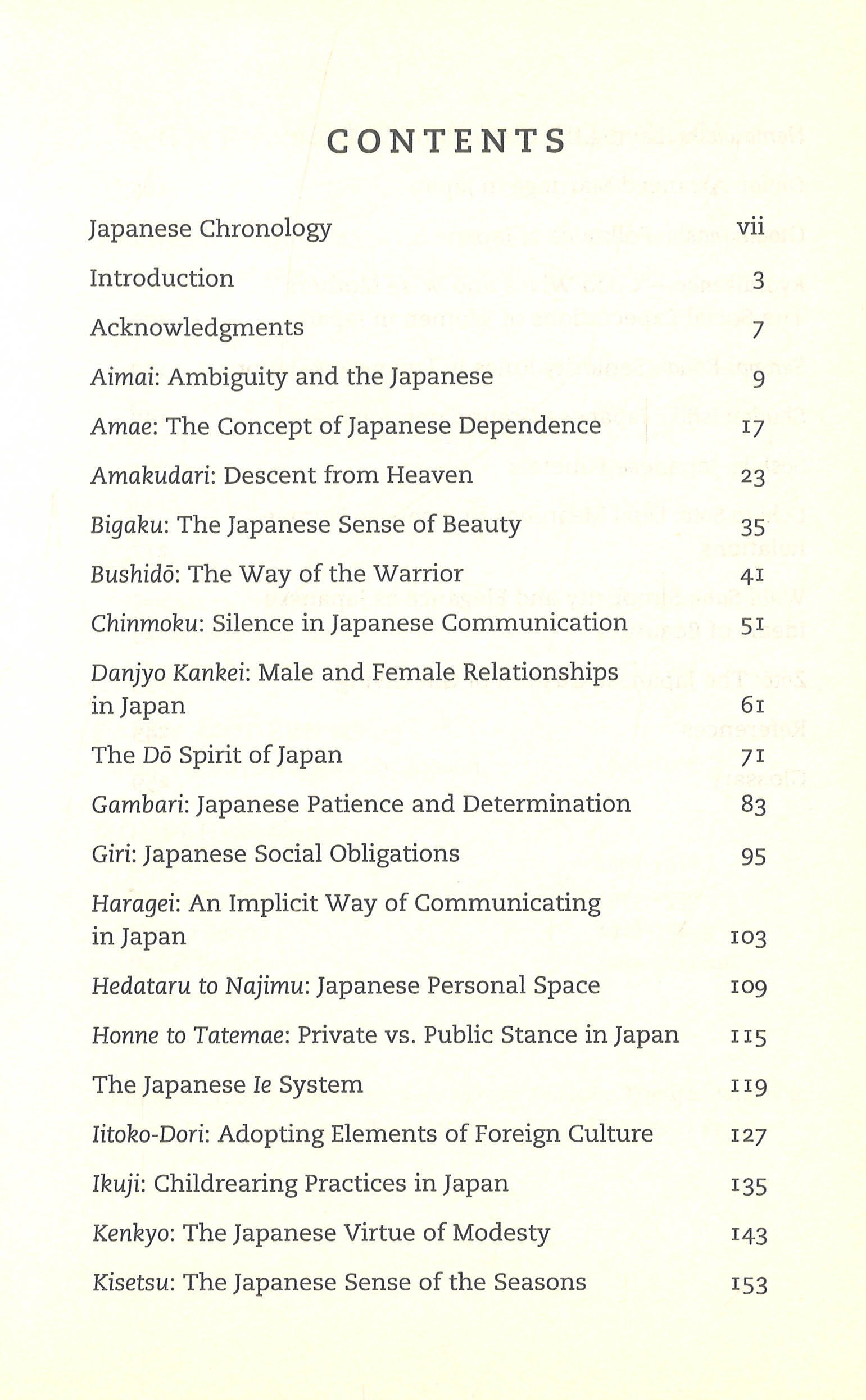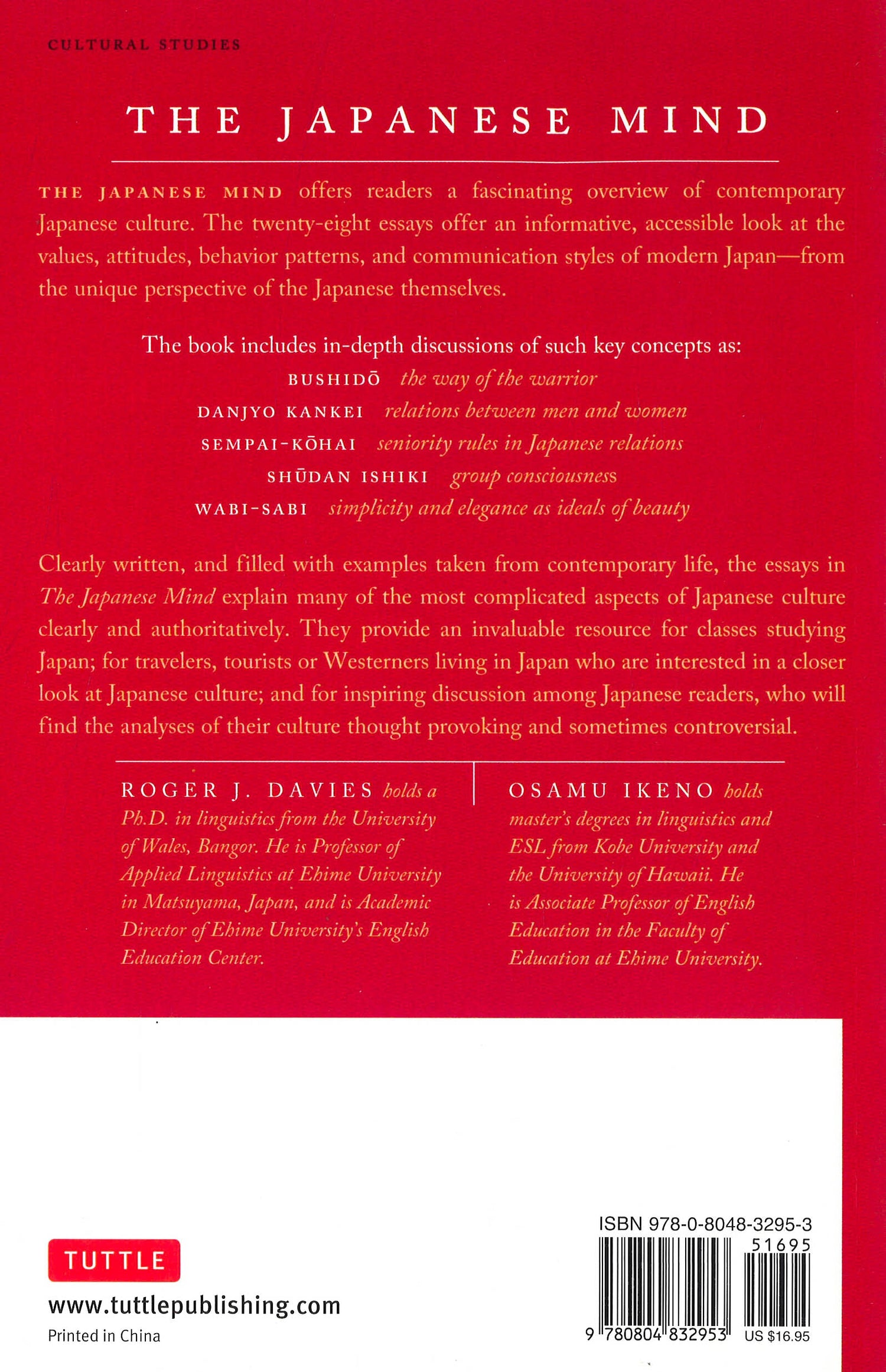 In The Japanese Mind, Roger Davies offers Westerners an invaluable key to the unique aspects of Japanese culture.Readers of this book will gain a clear understanding of what makes the Japanese, and their society, tick. Among the topics explored: aimai (ambiguity), amae (dependence upon others' benevolence), amakudari (the nation's descent from heaven), chinmoku (silence in communication), gambari (perseverance), giri (social obligation), haragei (literally, "belly art"; implicit, unspoken communication), kenkyo (the appearance of modesty), sempai-kohai (seniority), wabi-sabi (simplicity and elegance), and zoto (gift giving), as well as discussions of child-rearing, personal space, and the roles of women in Japanese society. It includes discussion topics and questions after each chapter.All in all, this book is an easy-to-use introduction to the distinguishing characteristics of Japanese society; an invaluable resource for anyone--business people, travelers, or students--perfect for course adoption, but also for anyone interested in Japanese culture. Next in this series:Now available separately, Japanese Culture: The Religious and Philosophical Foundations is a fascinating journey through Japan's rich cultural history.