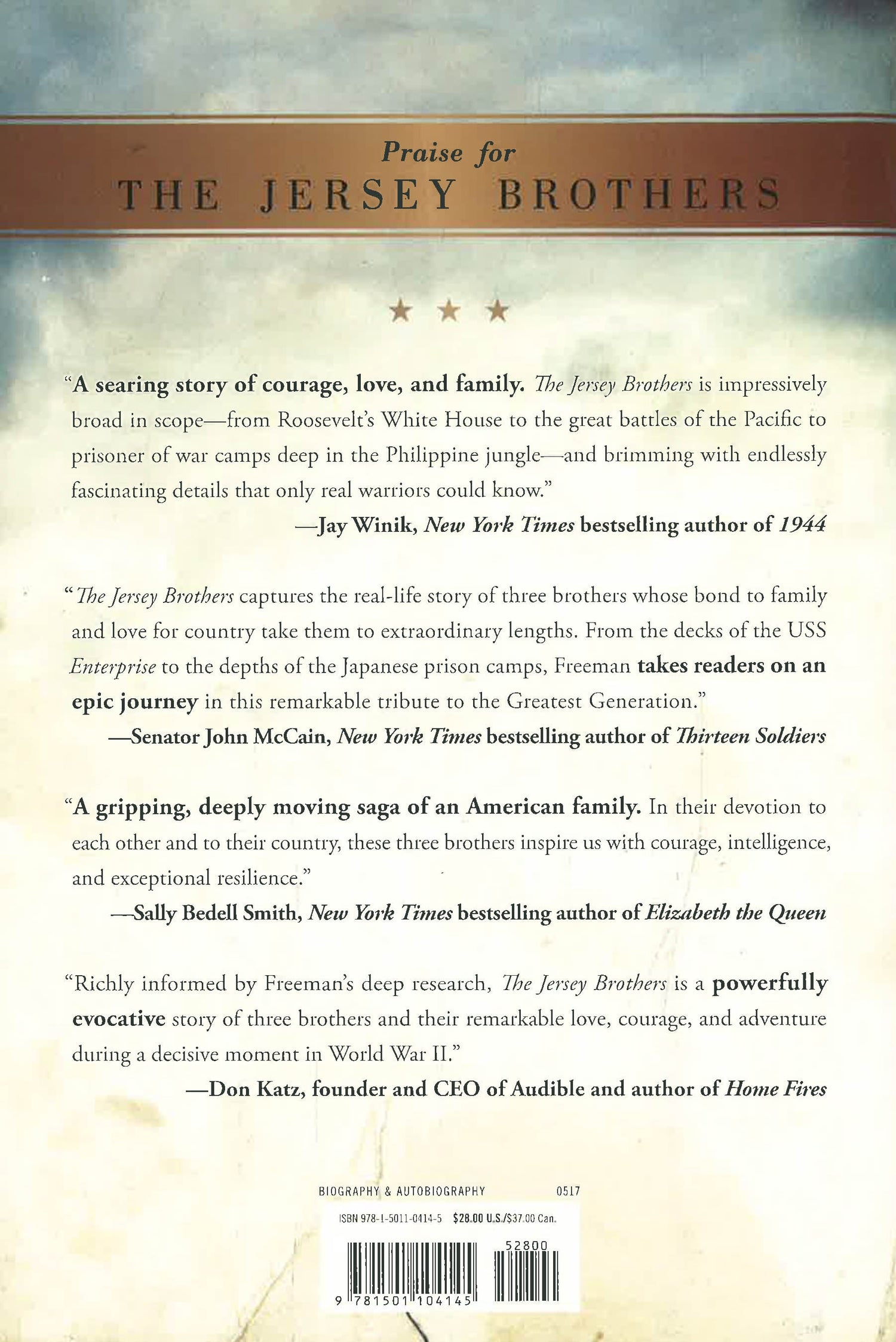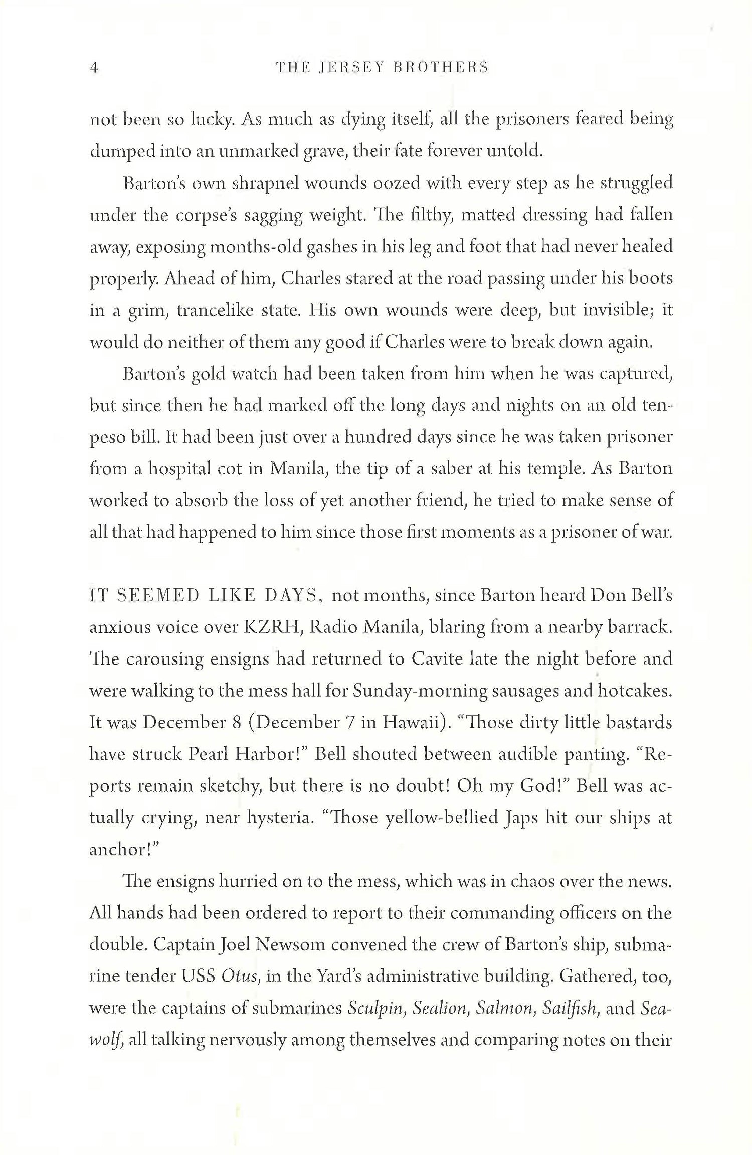 Based on ten years of research drawn from archives around the world, interviews with fellow shipmates and POWs, and primary sources including diaries, unpublished memoirs, and letters half-forgotten in basements, The Jersey Brothers is a remarkable story of agony and triumph—from the home front to Roosevelt’s White House, and Pearl Harbor to Midway and Bataan. It is the story, written with intimate, novelistic detail, of an ordinary young man who shows extraordinary courage as the Japanese do everything short of killing him. And it is, above all, a story of brotherly love: of three men finding their loyalty to each other tested under the tortures of war—and knowing that their success or failure to save their youngest brother will shape their family forever.
