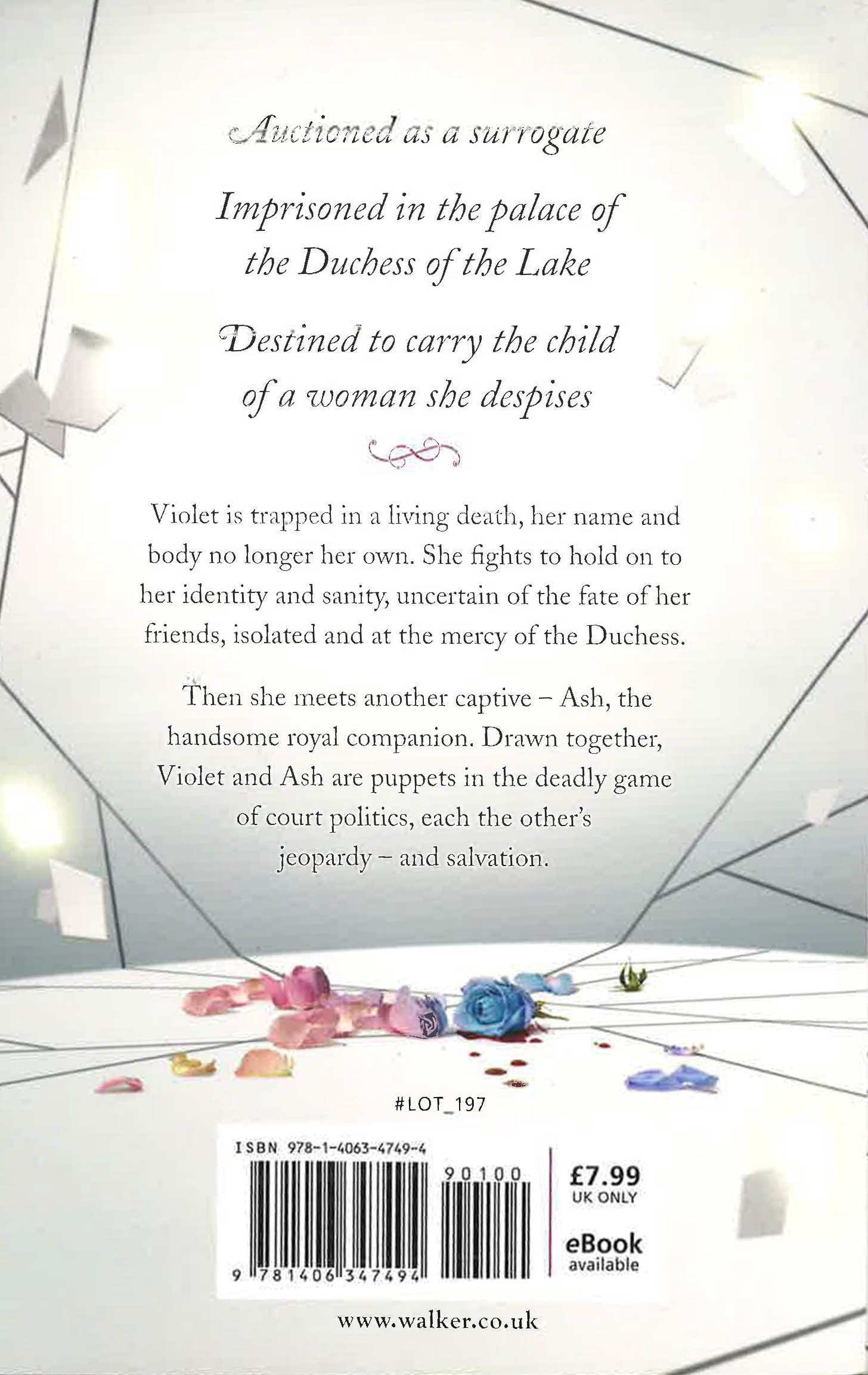 Violet Lasting is no longer a human being. Tomorrow she becomes Lot 197, auctioned to the highest royal bidder in the Jewel of the Lone City. Tomorrow she becomes the Surrogate of the House of the Lake, her sole purpose to produce a healthy heir for the Duchess. Imprisoned in the opulent cage of the palace, Violet learns the brutal ways of the Jewel, where the royal women compete to secure their bloodline and the surrogates are treated as disposable commodities. Destined to carry the child of a woman she despises, Violet enters a living death of captivity - until she sets eyes on Ash Lockwood, the royal Companion. Compelled towards each other by a reckless, clandestine passion, Violet and Ash dance like puppets in a deadly game of court politics, until they become each other's jeopardy - and salvation.