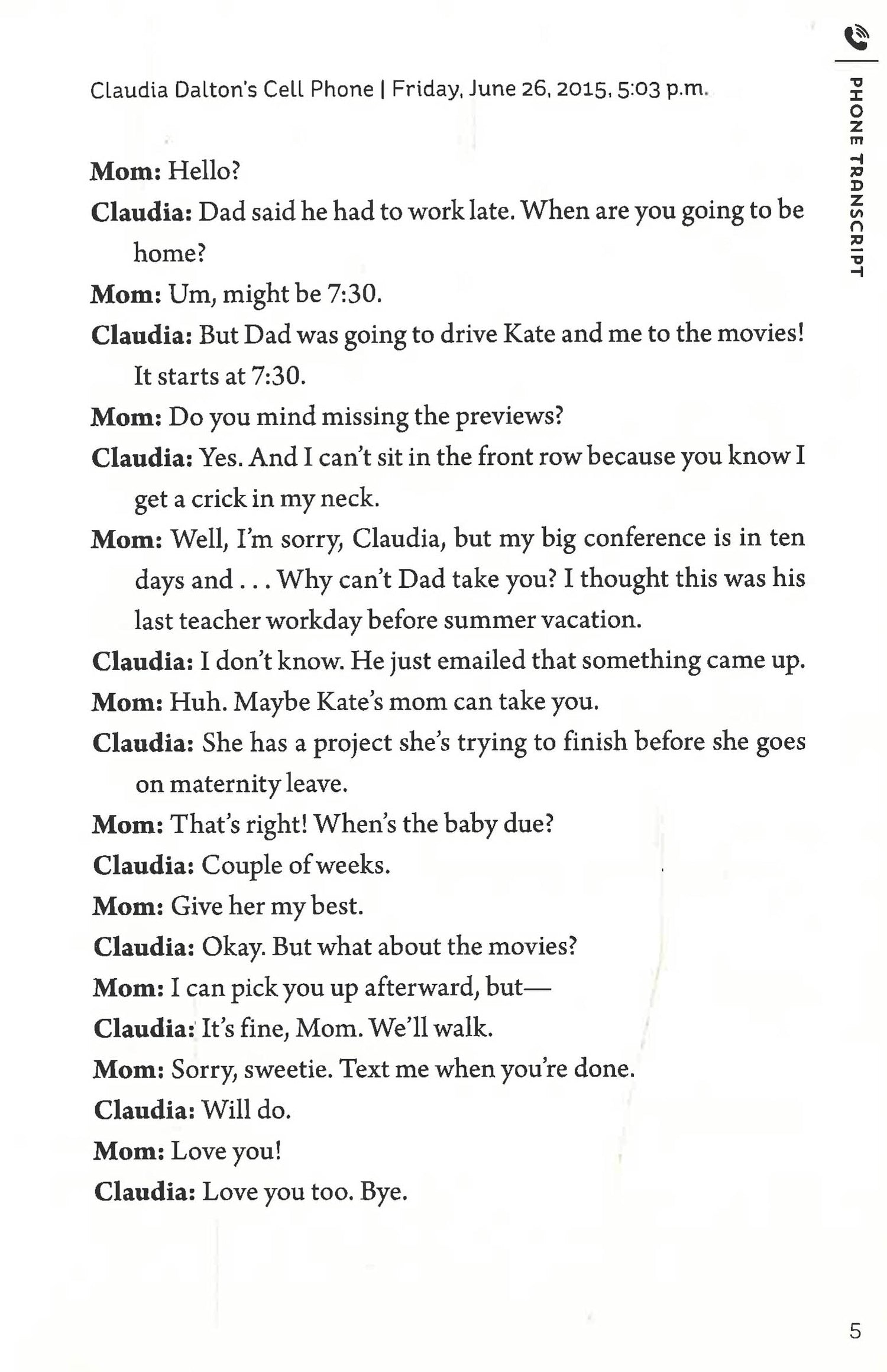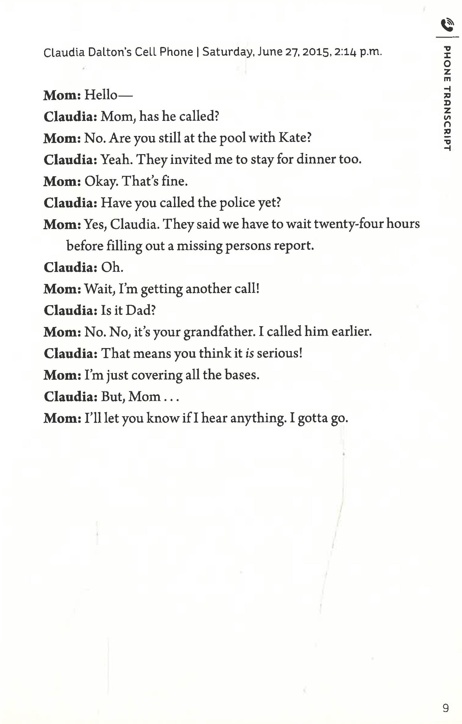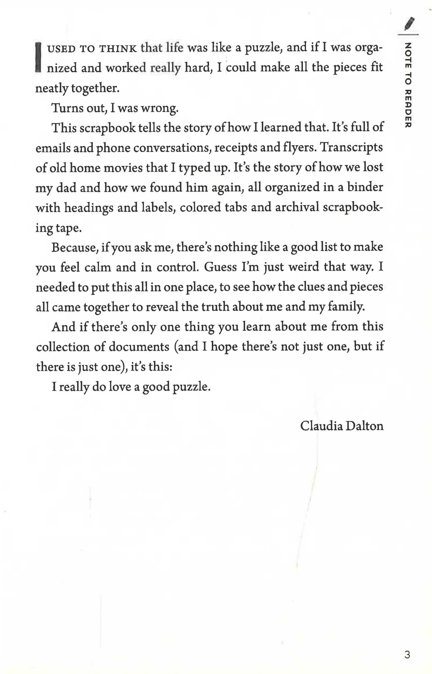 But when she finally gets word from her dad, it turns out he isn’t missing at all. He’s just gone to “think things over” and visit an old friend, whatever that means. Feeling confused and helpless, Claudia starts to assemble a scrapbook, gathering emails, receipts, phone transcripts and more, all in a desperate attempt to figure out what’s happening with her dad. Claudia’s investigation deepens at her grandfather’s house, where she receives an envelope containing a puzzle piece and a cryptic message.