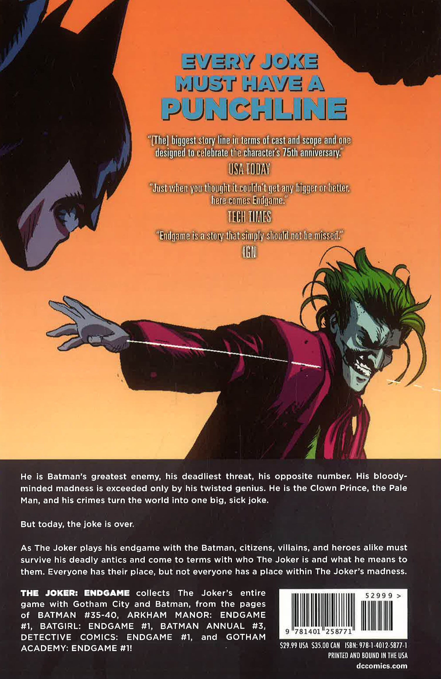 THE JOKER: ENDGAME collects the ancillary tales of Gotham City as it plays his endgame with it from the pages of BATMAN #35-39, ARKHAM MANOR: ENDGAME #1, BATGIRL: ENDGAME #1, BATMAN ANNUAL #3, DETECTIVE COMICS: ENDGAME #1, and GOTHAM ACADEMY: ENDGAME #1!