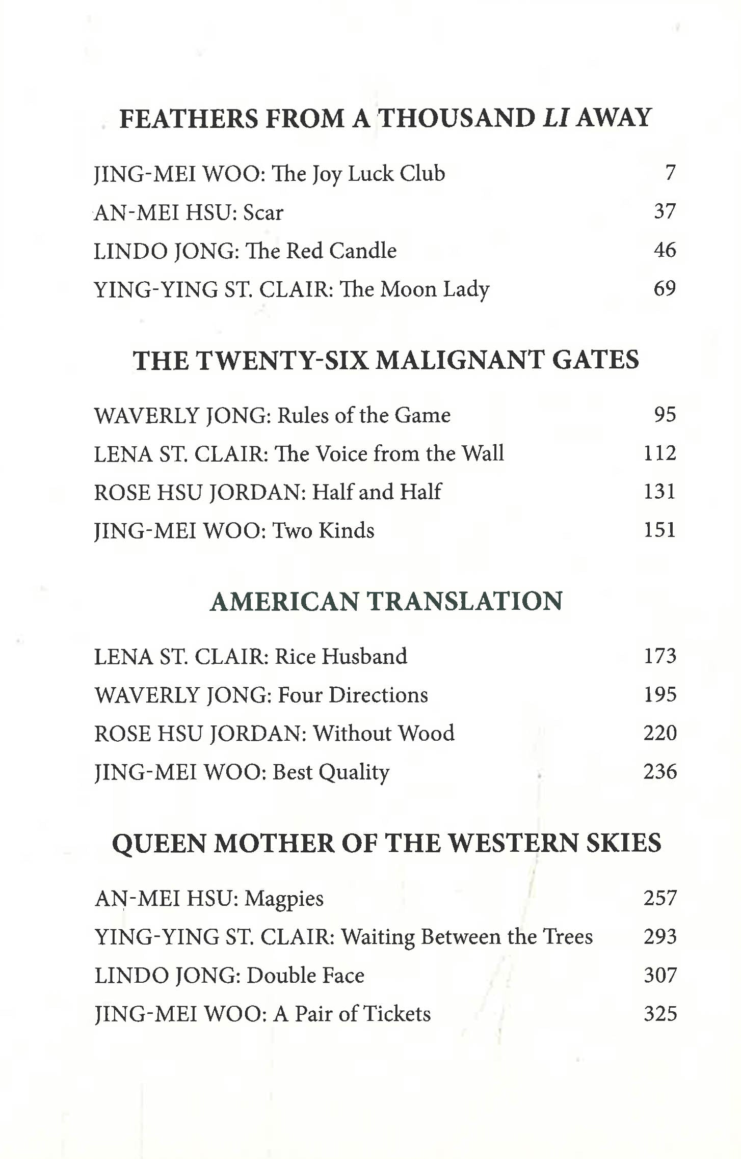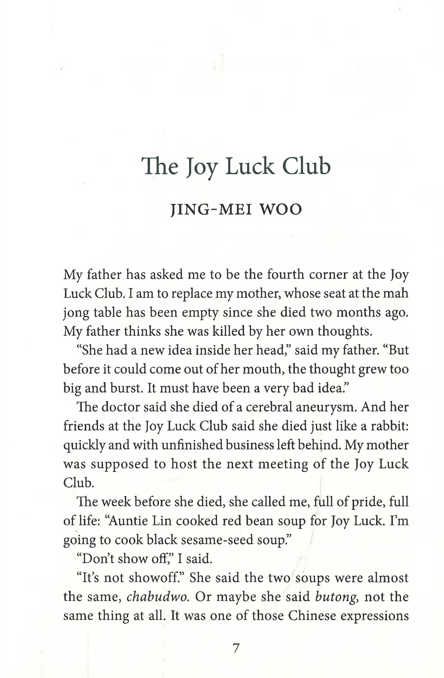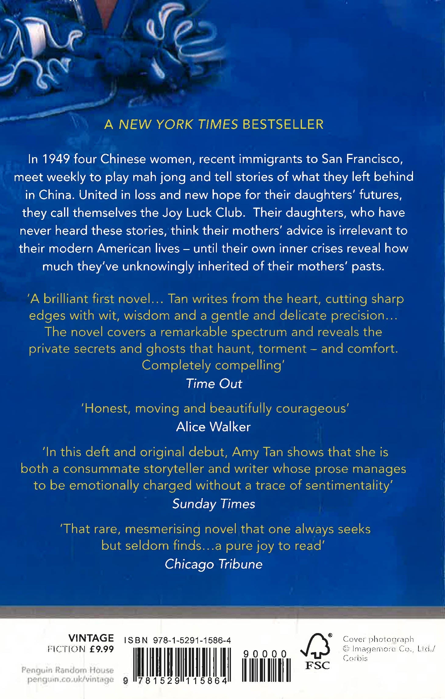 In 1949 four chinese women, recent immigrants to San Francisco, meet weekly to play mah jong and tell stories of what they left behind in China. United in loss and new hope for their daughters' futures, they call themselves the Joy Luck club. Their daughters, who have never heard these stories, think their mothers' advice is irrelevant to their modern American lives - until their own inner crises reveal how much they've unknoingly inherited of their mothers' pasts.