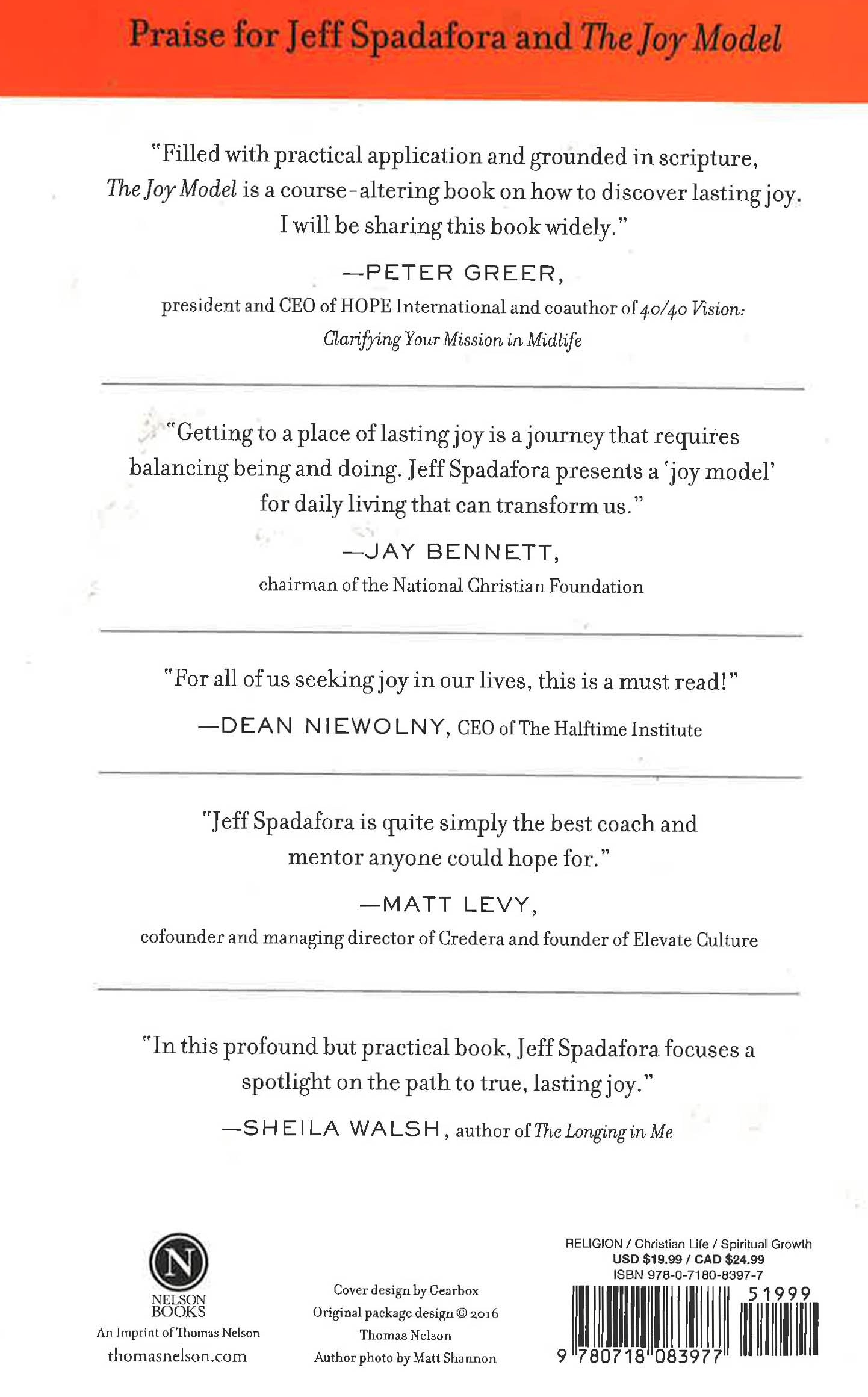 In The Joy Model, Jeff Spadafora offers a better way, showing readers that joy comes from balancing the practical and spiritual sides of our lives-from the "Doing" and the "Being" of the Christian life. On the spiritual side, he reveals tried and true disciplines that move readers from knowing about God to actually experiencing him. On the practical side, he shows how to let our new understanding of God transform relationships, attitudes, finances, service, and work in ways that result in significant increases in joy. Weaving together his own spiritual journey, stories from his experience coaching others, and down-to-earth principles and practices, Spadafora helps readers find the joy in a life that is more vibrant and real than any they have experienced before.