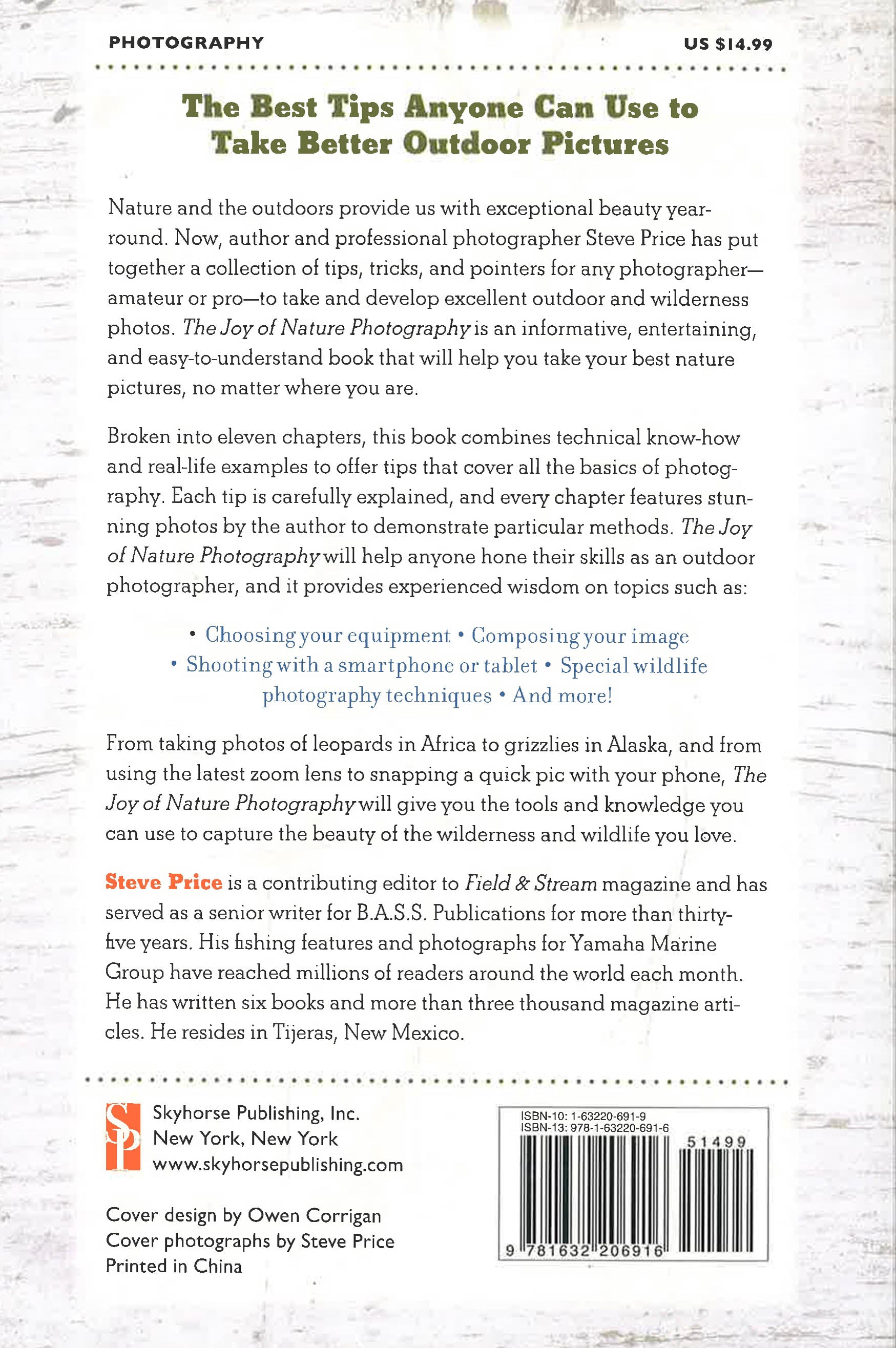 Nature and the outdoors provide us with exceptional beauty year-round. Now, author and professional photographer Steve Price has put together a collection of tips, tricks, and pointers for any photographer amateur or pro to take and develop excellent outdoor and wilderness photos. The Joy of Nature Photography is an informative, entertaining, and easy-to-understand book that will help you take your best nature pictures, no matter where you are.