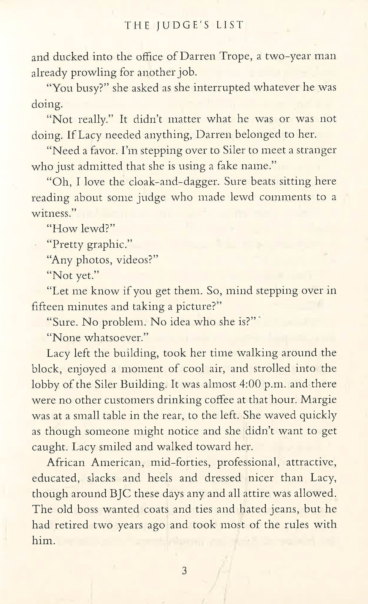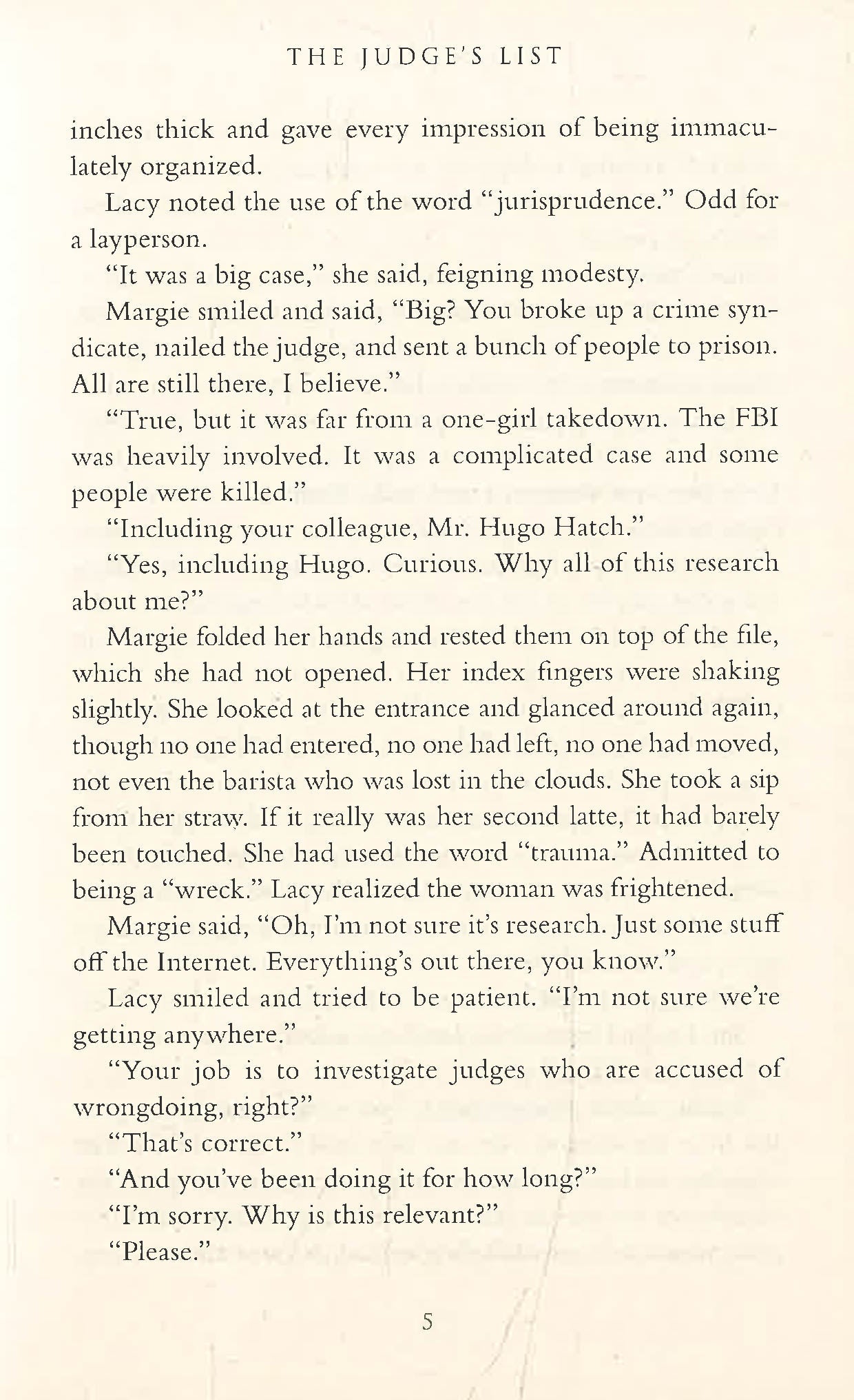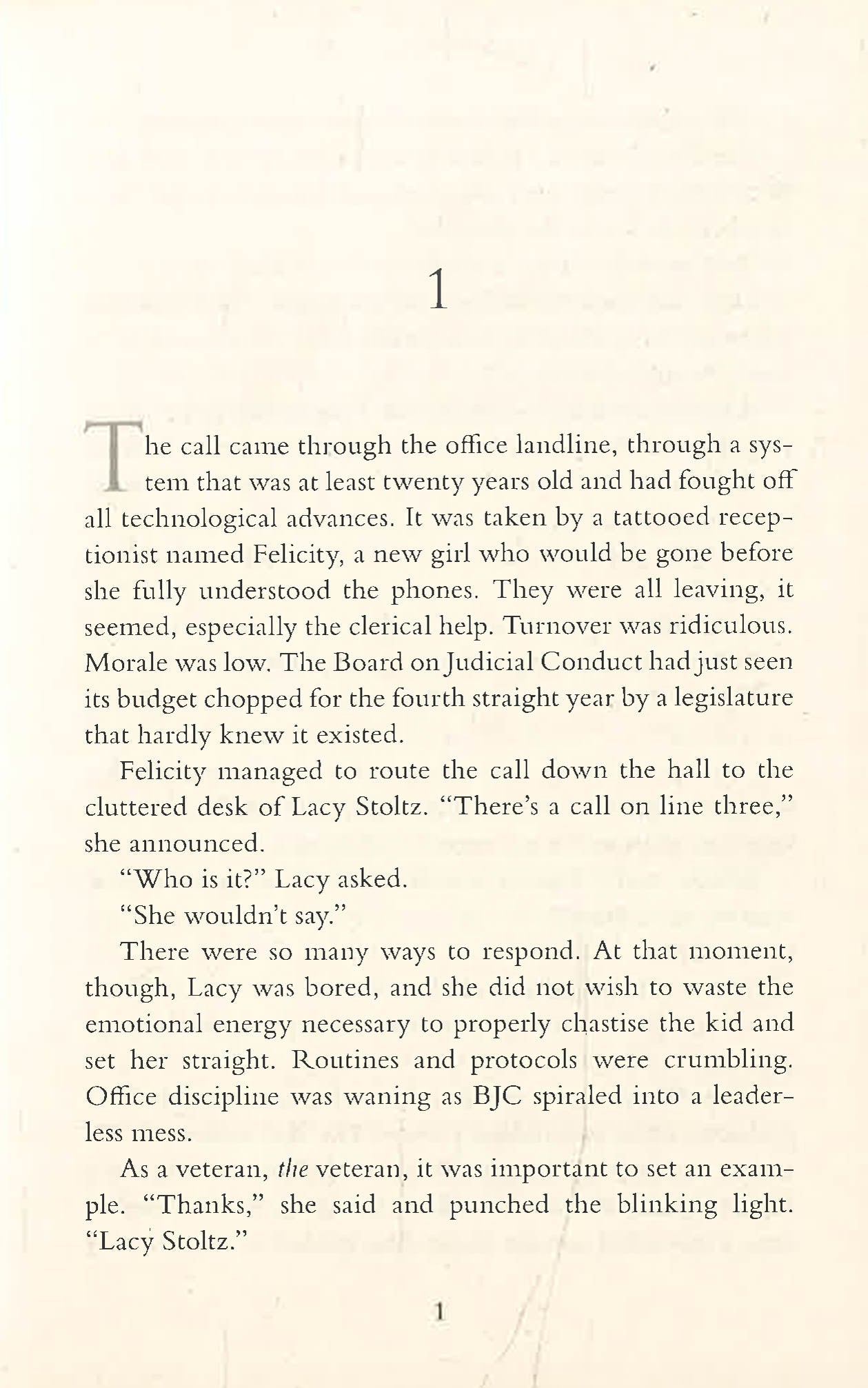 In The Whistler, Lacy Stoltz investigated a corrupt judge who was taking millions in bribes from a crime syndicate. She put the criminals away, but only after being attacked and nearly killed. Three years later, and approaching forty, she is tired of her work for the Florida Board on Judicial Conduct and ready for a change.