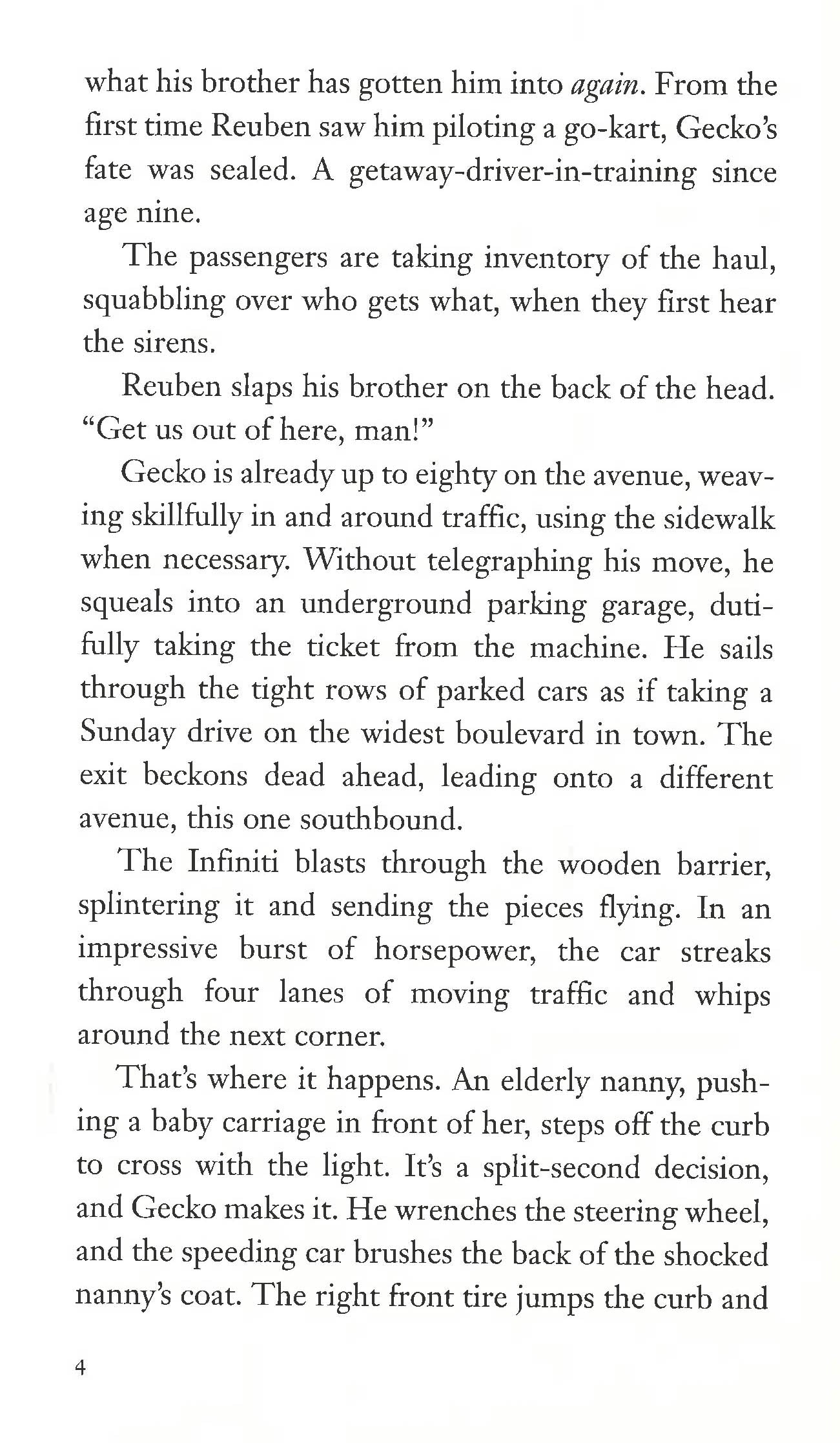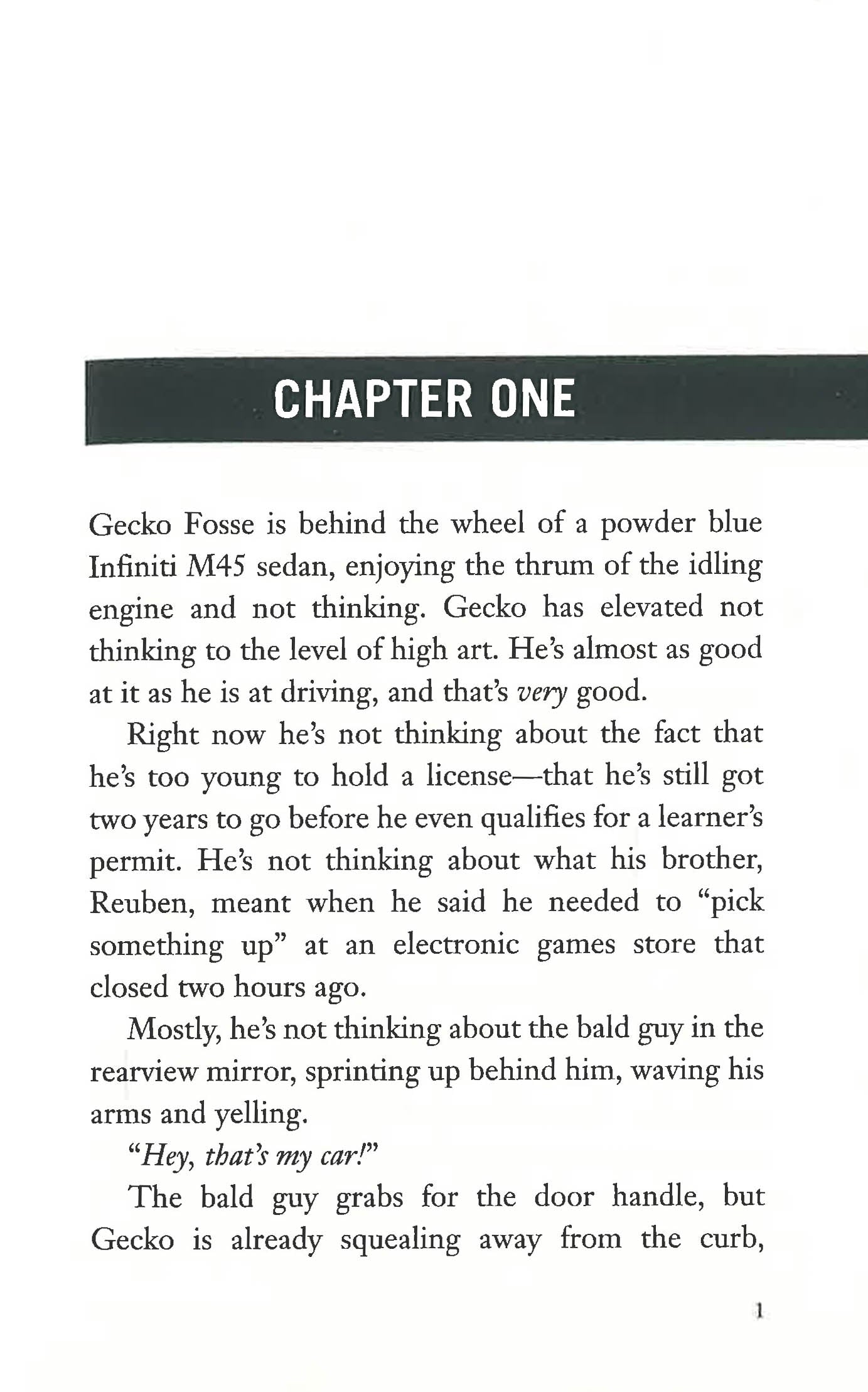 Gecko Fosse drove the getaway car. Terence Florian ran with the worst gang in Chicago. Arjay Moran killed someone. All three boys are serving time in juvenile detention centers until they get a second chance at life in the form of Douglas Healy. A former juvenile delinquent himself, Healy is running an experimental halfway house in New York City where he wants to make a difference in the lives of kids like Gecko, Terence, and Arjay. Things are going well, until one night Healy is accidentally knocked unconscious while trying to break up a scuffle among the boys. Terrified of the consequences, they drop him off at a hospital and run away. But when Healy awakes, he has no memory of them or the halfway house. Afraid of being sent back to Juvie, the guys hatch a crazy scheme to continue on as if the group leader never left. They will go to school, do their community service, attend therapy, and act like model citizens until Healy's memory returns and he can resume his place with them. But life keeps getting in the way...like when Gecko finds romance. Or Arjay gets famous. Or Terence starts reverting to his old ways. If the boys are discovered, their second chance will be their last.