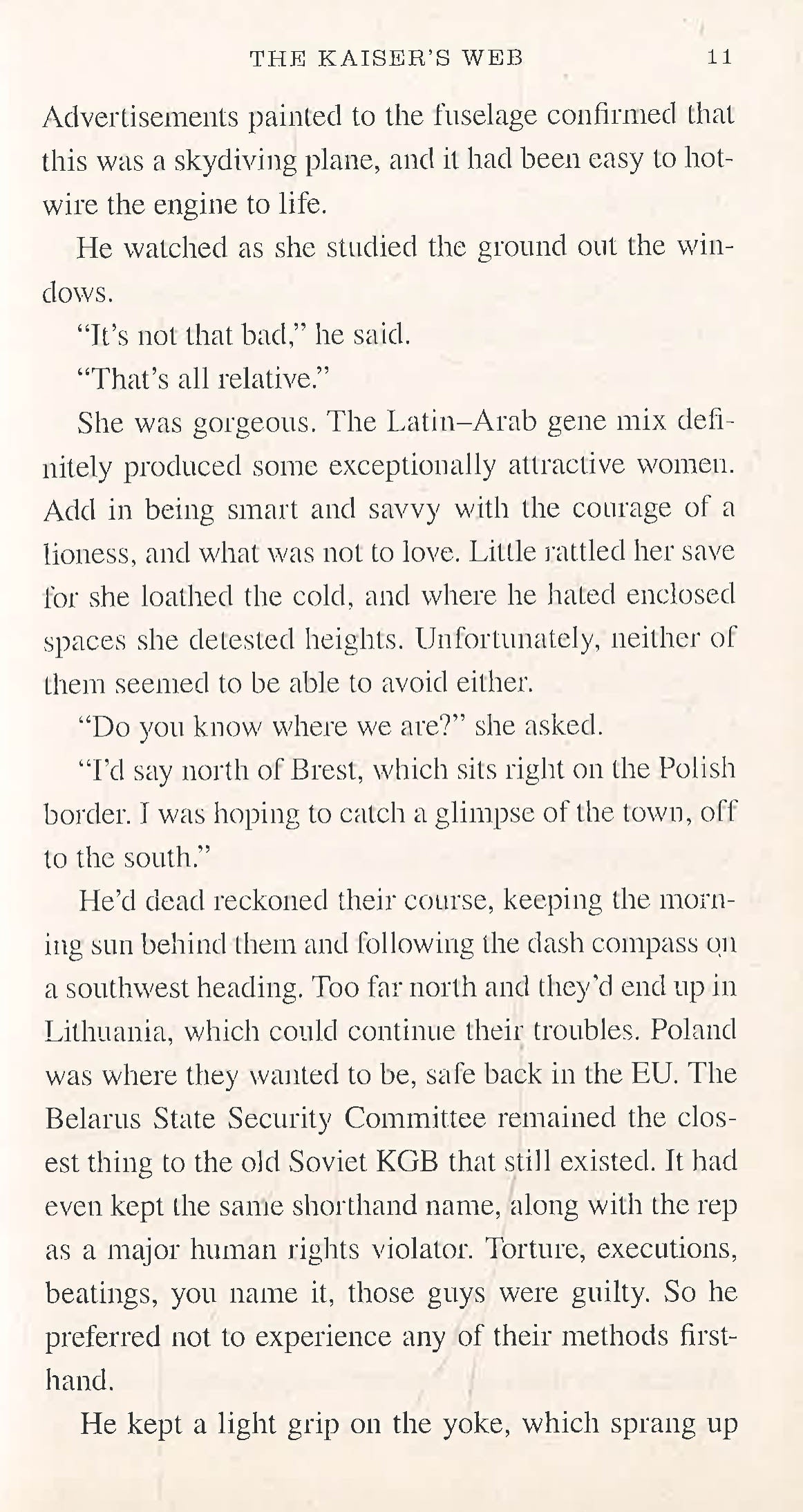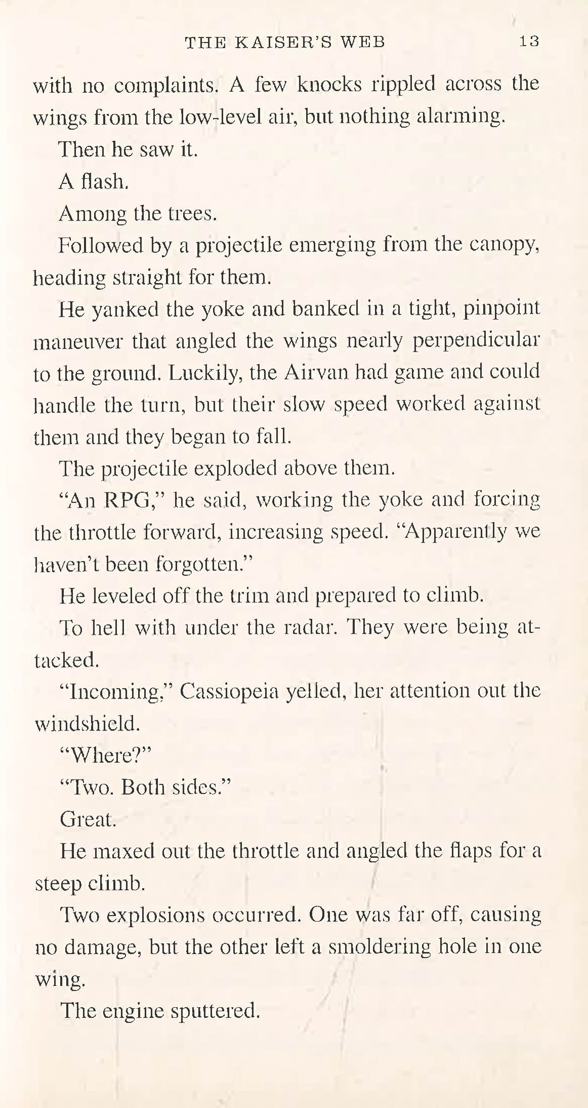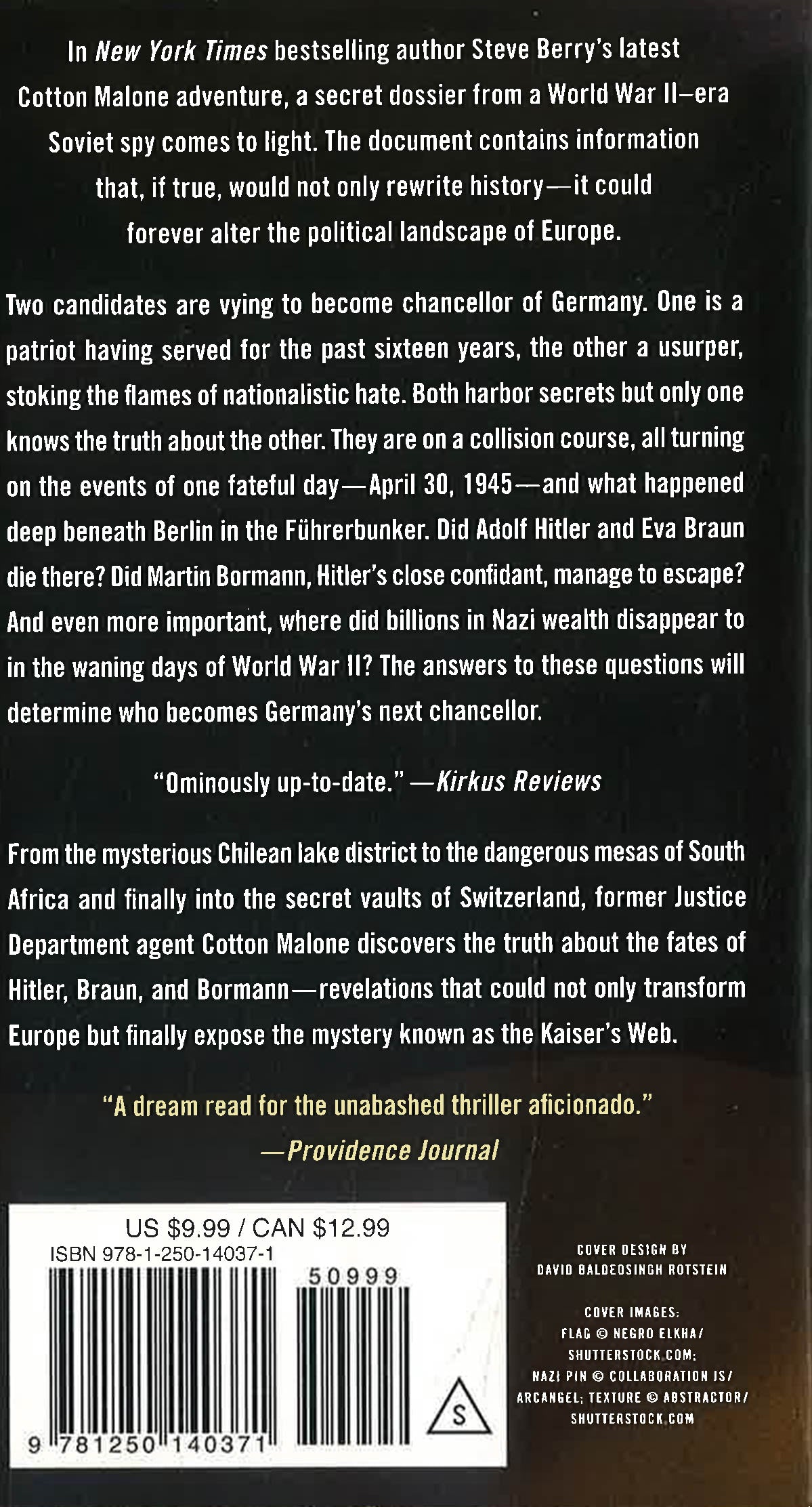 From the mysterious Chilean lake district, to the dangerous mesas of South Africa, and finally into the secret vaults of Switzerland, former-Justice Department agent Cotton Malone discovers the truth about the fates of Hitler, Braun, and Bormann. Revelations that could not only transform Europe, but finally expose a mystery known as the Kaiser's web.