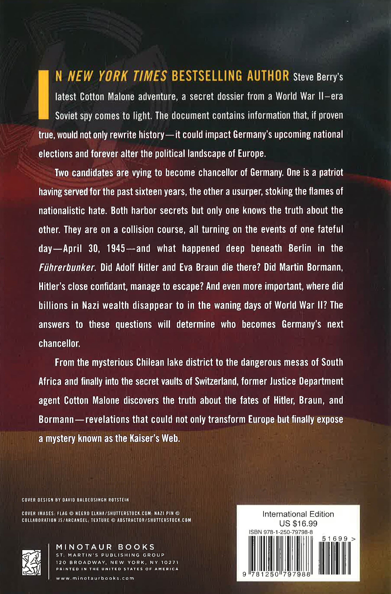 In New York Times bestseller Steve Berry's latest Cotton Malone adventure, a secret dossier from a World War II-era Soviet spy comes to light containing information that, if proven true, would not only rewrite history - it could impact Germany's upcoming national elections and forever alter the political landscape of Europe.Two candidates are vying to become Chancellor of Germany. One is a patriot having served for the past sixteen years, the other a usurper, stoking the flames of nationalistic hate. Both harbor secrets, but only one knows the truth about the other. They are on a collision course, all turning on the events of one fateful day - April 30, 1945 - and what happened deep beneath Berlin in the Frherbunker. Did Adolph Hitler and Eva Braun die there Did Martin Bormann, Hitler's close confidant, manage to escape And, even more important, where did billions in Nazi wealth disappear to in the waning days of World War II The answers to these questions will determine who becomes the next Chancellor of Germany. From the mysterious Chilean lake district, to the dangerous mesas of South Africa, and finally into the secret vaults of Switzerland, former-Justice Department agent Cotton Malone discovers the truth about the fates of Hitler, Braun, and Bormann. Revelations that could not only transform Europe, but finally expose a mystery known as the Kaiser's web.
