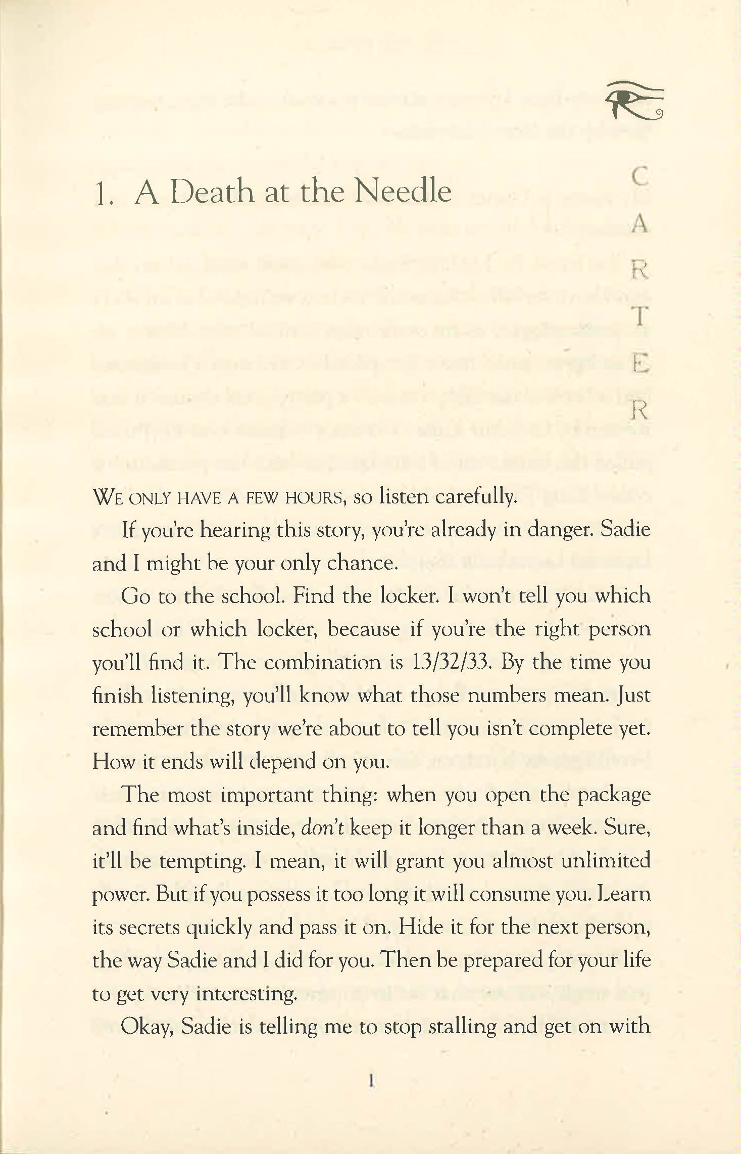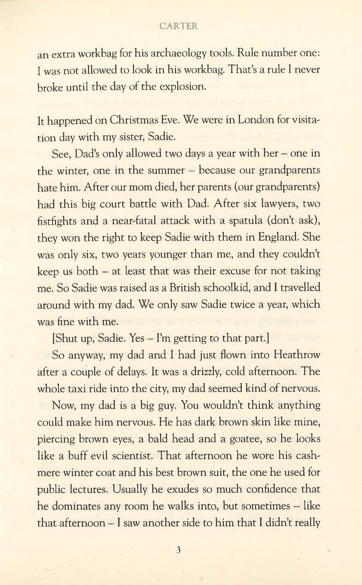 CARTER AND SADIE KANE'S dad is a brilliant Egyptologist with a secret plan that goes horribly wrong. An explosion shatters the ancient Rosetta stone and unleashes Set, the evil god of chaos . . .