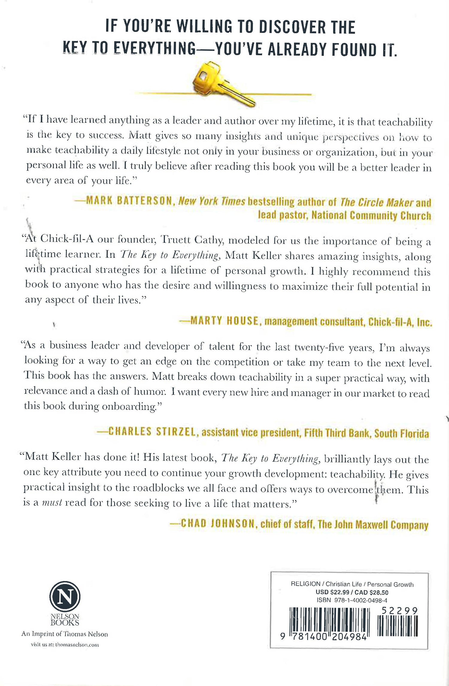 For two decades, pastor and leadership consultant Matt Keller has worked with hundreds of influencers, and he has learned that the greatest enhancer or greatest limiter to a person's success is whether someone is teachable. In The Key to Everything, Keller shows how teachability isn't something that some people are born with and others aren't. It is a characteristic that can be learned and grown. In fact, the only way to succeed in life is to possess teachability in an ever-increasing fashion, and The Key to Everything reveals how to do just that.