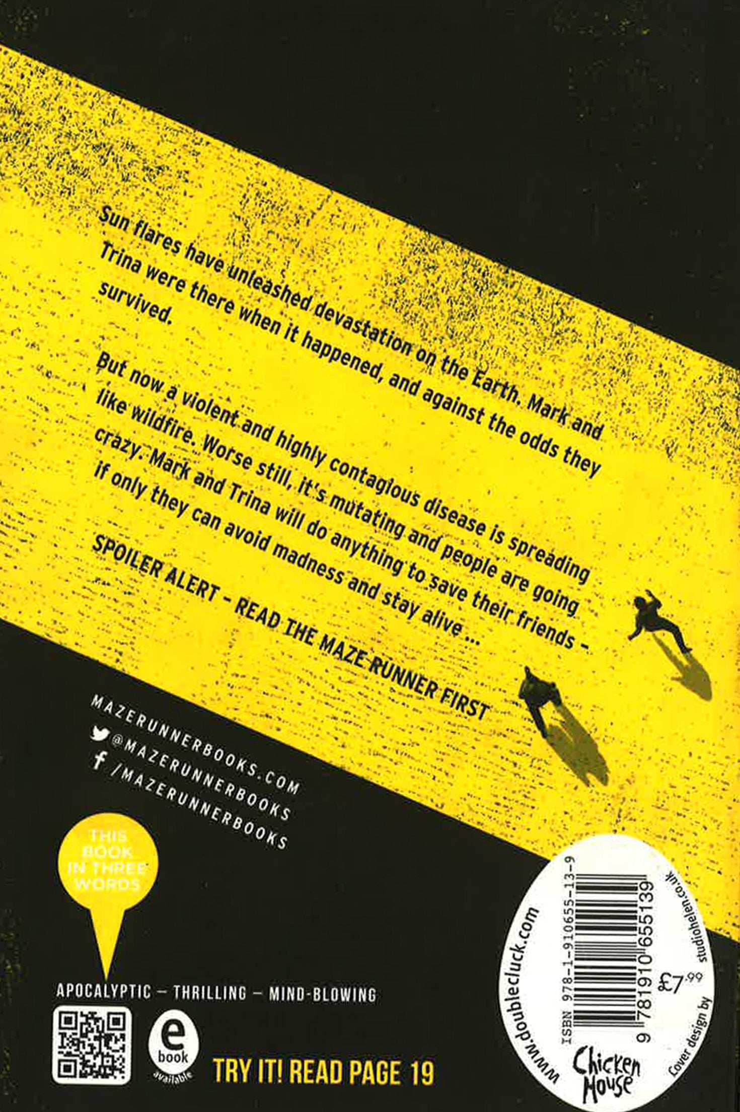 SPOILER ALERT: Read after The Maze Runner, The Scorch Trials and The Death Cure ... When sun flares hit the Earth, intense heat, toxic radiation and flooding followed, wiping out much of the human race. Those who survived live in basic communities in the mountains, hunting for food. For Mark and his friends, surviving is difficult, and then an enemy arrives, infecting people with a highly contagious virus. Thousands die, and the virus is spreading. Worse, it's mutating, and people are going crazy. It's up to Mark and his friends to find the enemy - and a cure - before the Flare infects them all ...