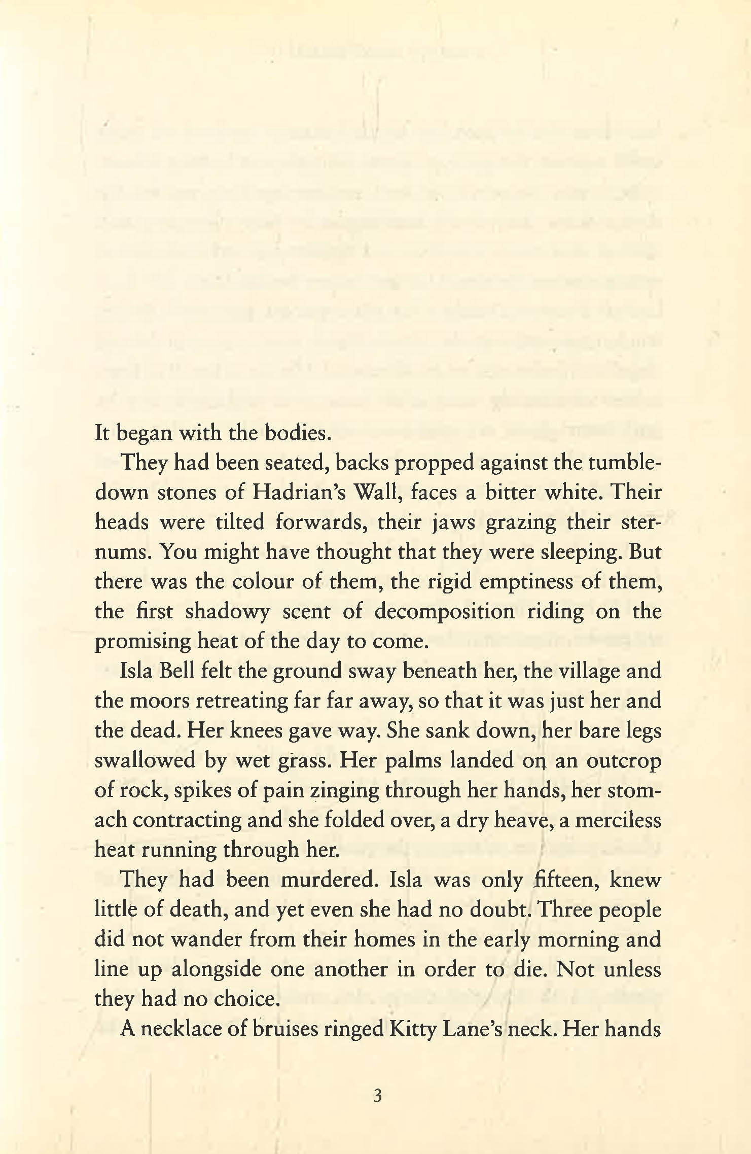 When fifteen-year-old Isla Bell finds three bodies propped against Hadrian’s Wall, her whole world falls apart. In such a close-knit community, everyone knows the victims, and the man who did it.