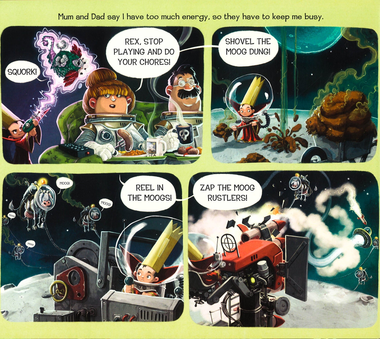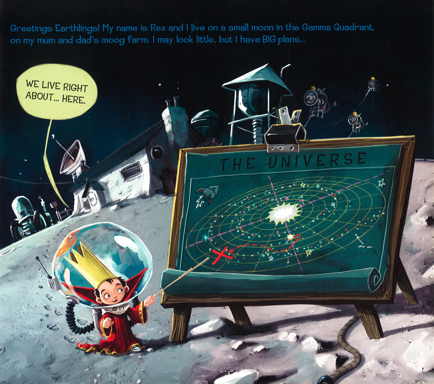 Rex looks like an average 6 year old, living on his parents' moog farm and going to mini galactic citizen school, but he's going to be King of Space! With the help of unsuspecting friends, Rex creates an army of warbots with dung-blasters and begins his conquest of the known worlds. But when he goes too far, only one person can save him from the wrath of the Galactic Alliance - his tough-talking mum!