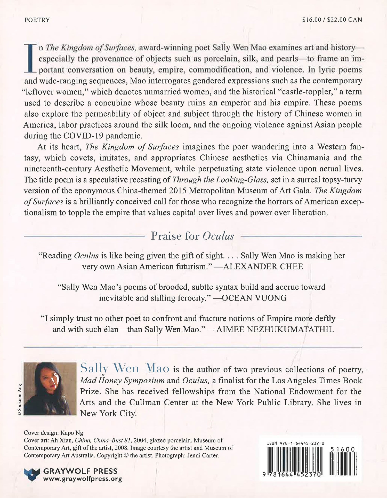 In The Kingdom of Surfaces, award-winning poet Sally Wen Mao examines art and history--especially the provenance of objects such as porcelain, silk, and pearls--to frame an important conversation on beauty, empire, commodification, and violence. In lyric poems and wide-ranging sequences, Mao interrogates gendered expressions such as the contemporary "leftover women," which denotes unmarried women, and the historical "castle-toppler," a term used to describe a concubine whose beauty ruins an emperor and his empire. These poems also explore the permeability of object and subject through the history of Chinese women in America, labor practices around the silk loom, and the ongoing violence against Asian people during the COVID-19 pandemic.