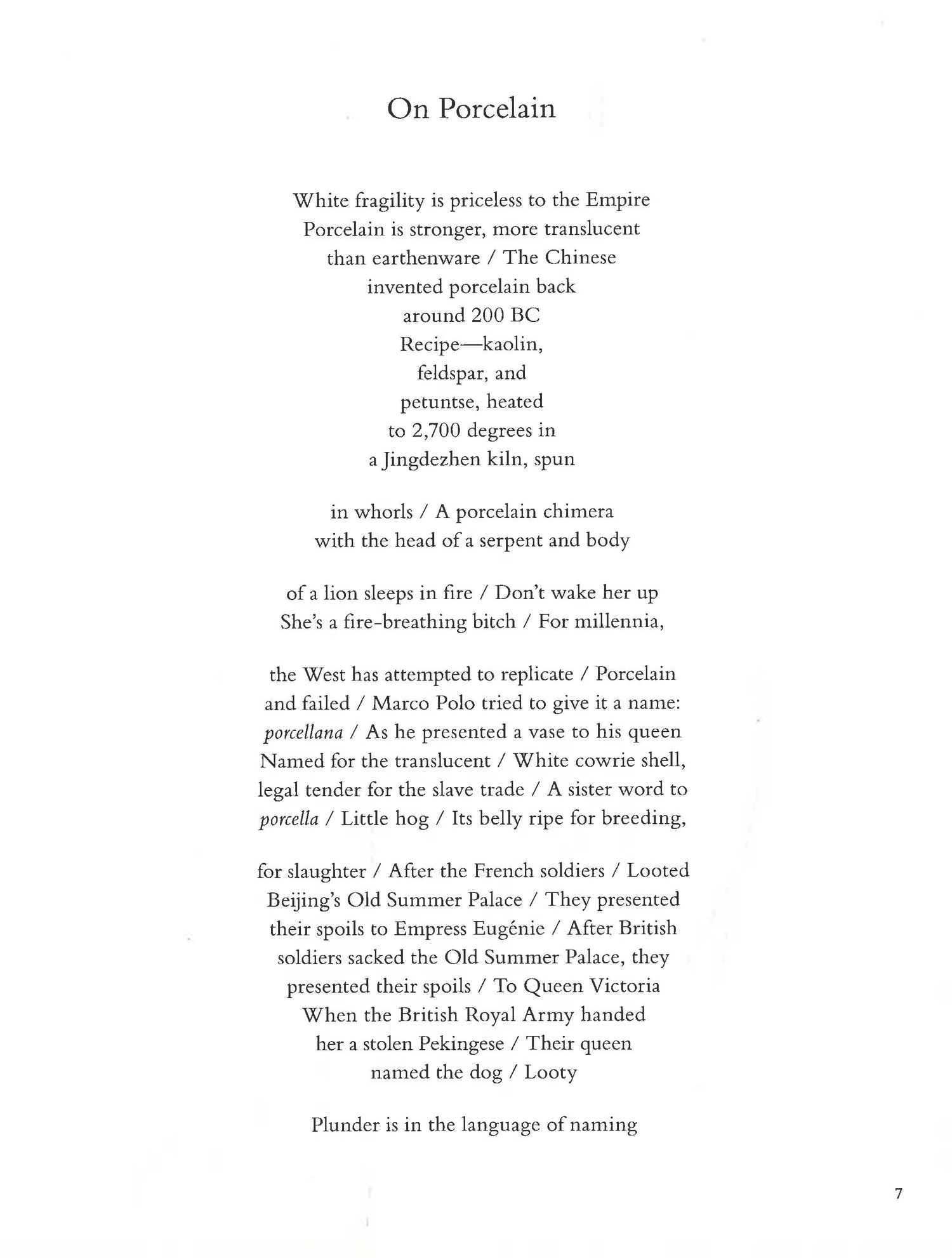 At its heart, The Kingdom of Surfaces imagines the poet wandering into a Western fantasy, which covets, imitates, and appropriates Chinese aesthetics via Chinamania and the nineteenth-century Aesthetic movement, while perpetuating state violence upon actual lives. The title poem is a speculative recasting of "Through the Looking-Glass," set in a surreal topsy-turvy version of the China-themed 2015 Metropolitan Museum of Art Gala. The Kingdom of Surfaces is a brilliantly conceived call for those who recognize the horrors of American exceptionalism to topple the empire that values capital over lives and power over liberation.