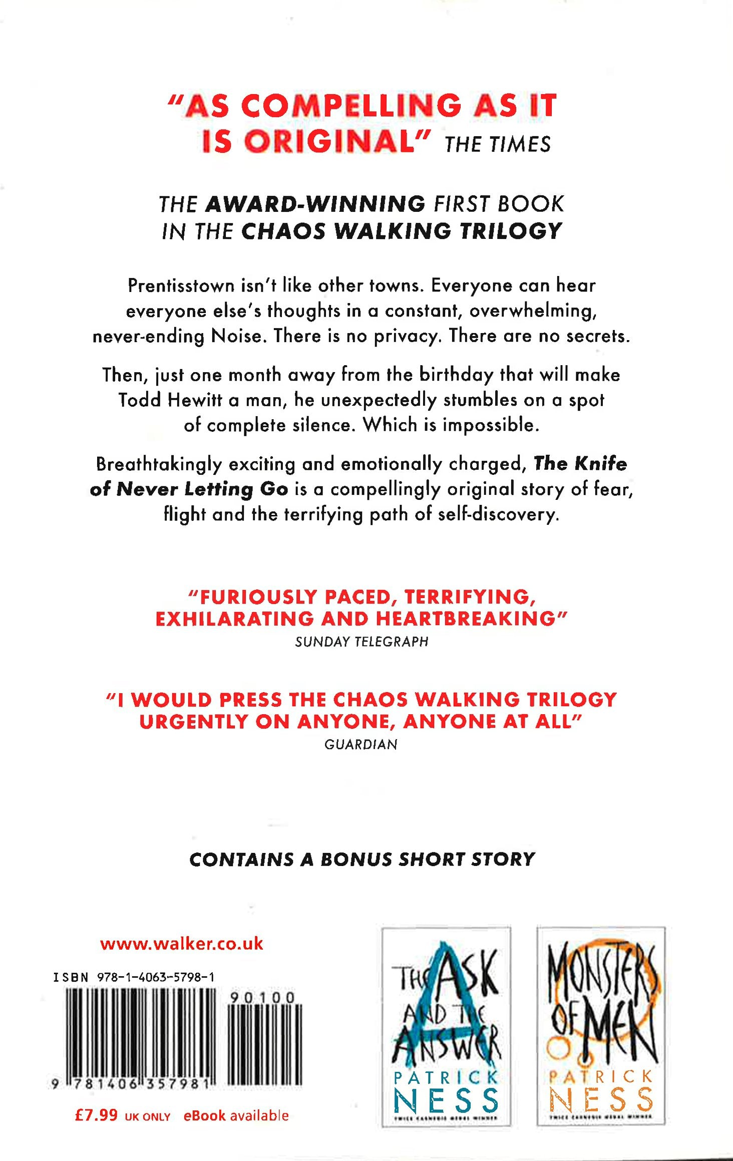 A new edition of the award winning first novel in the Chaos Walking trilogy, with a bonus short story, The New World. Imagine you're the only boy in a town of men. And you can hear everything they think and they can hear everything you think. Imagine you don't fit in with their plans...Todd Hewitt is just one month away from the birthday that will make him a man. But his town has been keeping secrets from him. Secrets that are going to force him to run...The new edition of this unflinching novel about fear, flight and the terrifying path of self-discovery features the short story, The New World. Set before the events of The Knife of Never Letting Go, it is the story of Viola's dramatic journey to the New World.