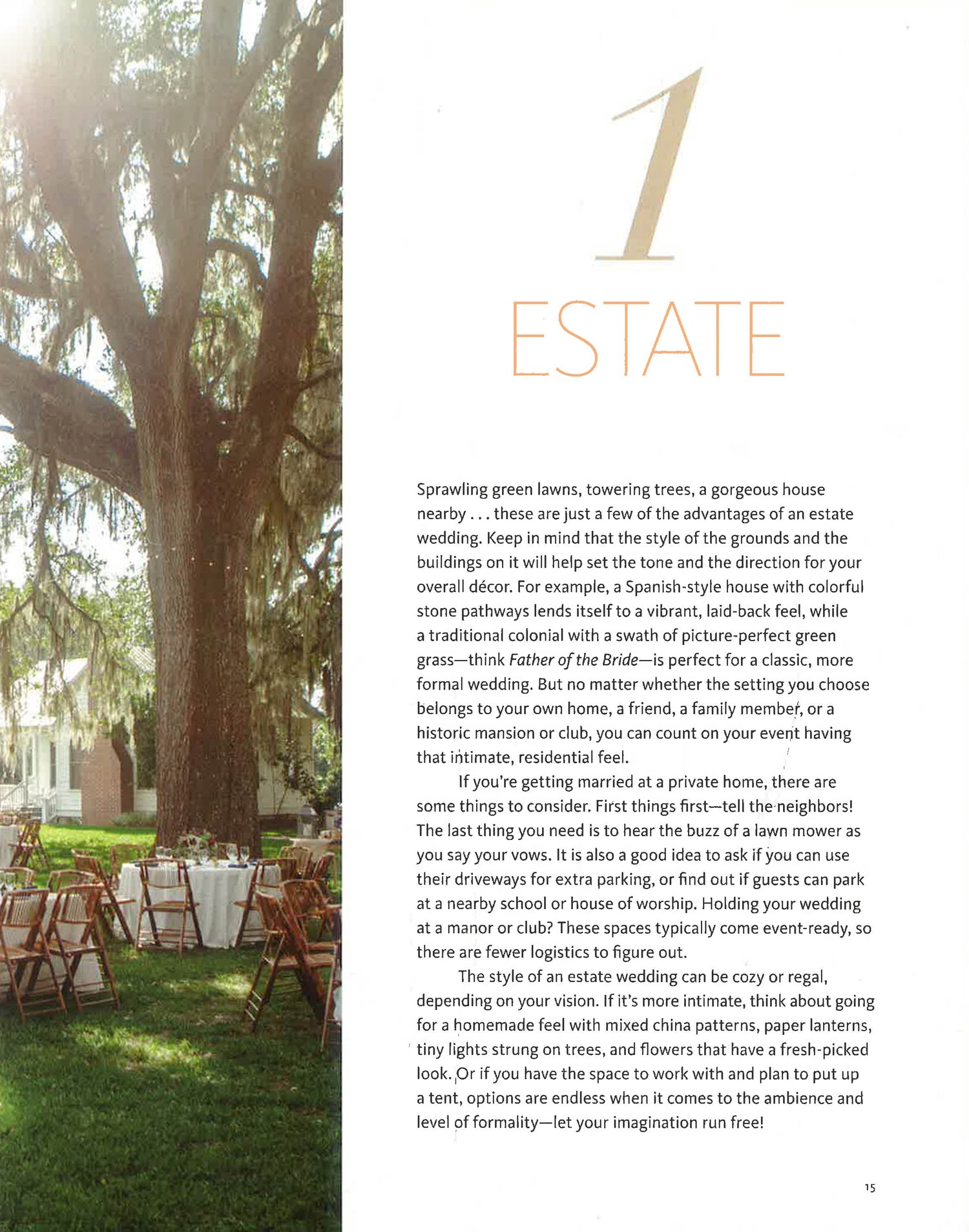 The Knot Outdoor Weddings also includes location-specific planning advice for the details of your event, such as attire, color palettes, stationery, menu, and favors, as well as considerations for perfecting your plan B and keeping guests comfortable in any weather.