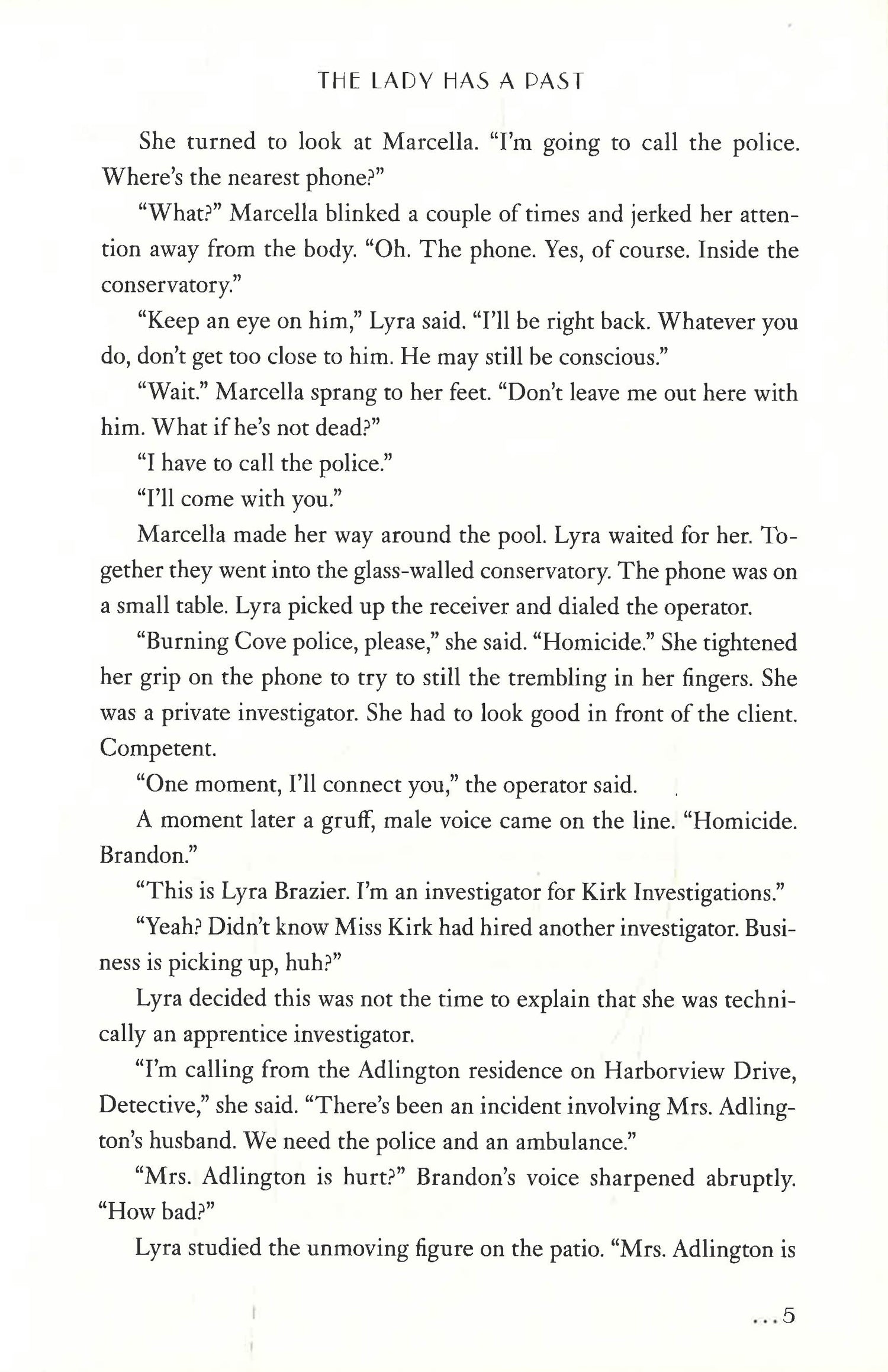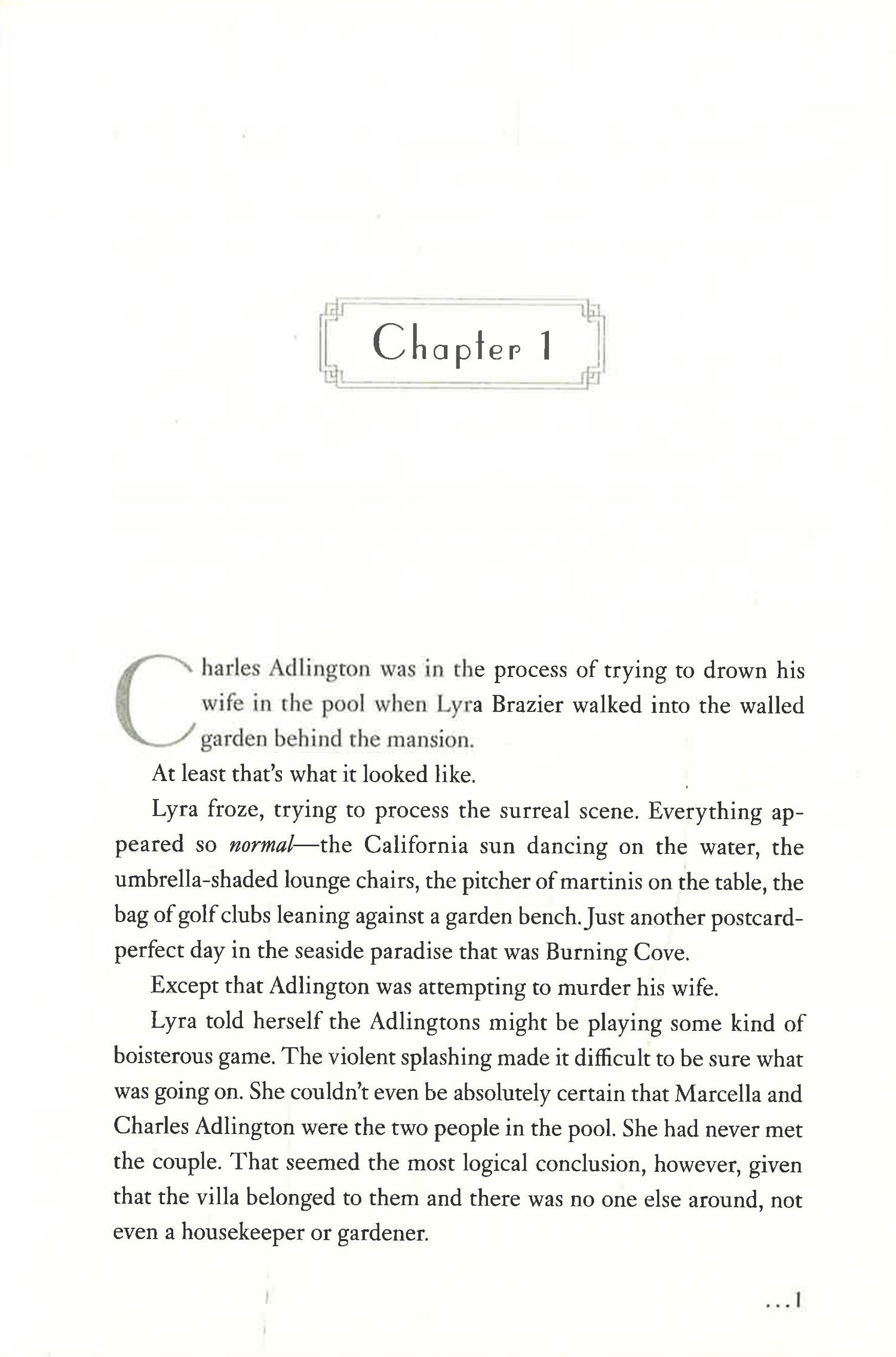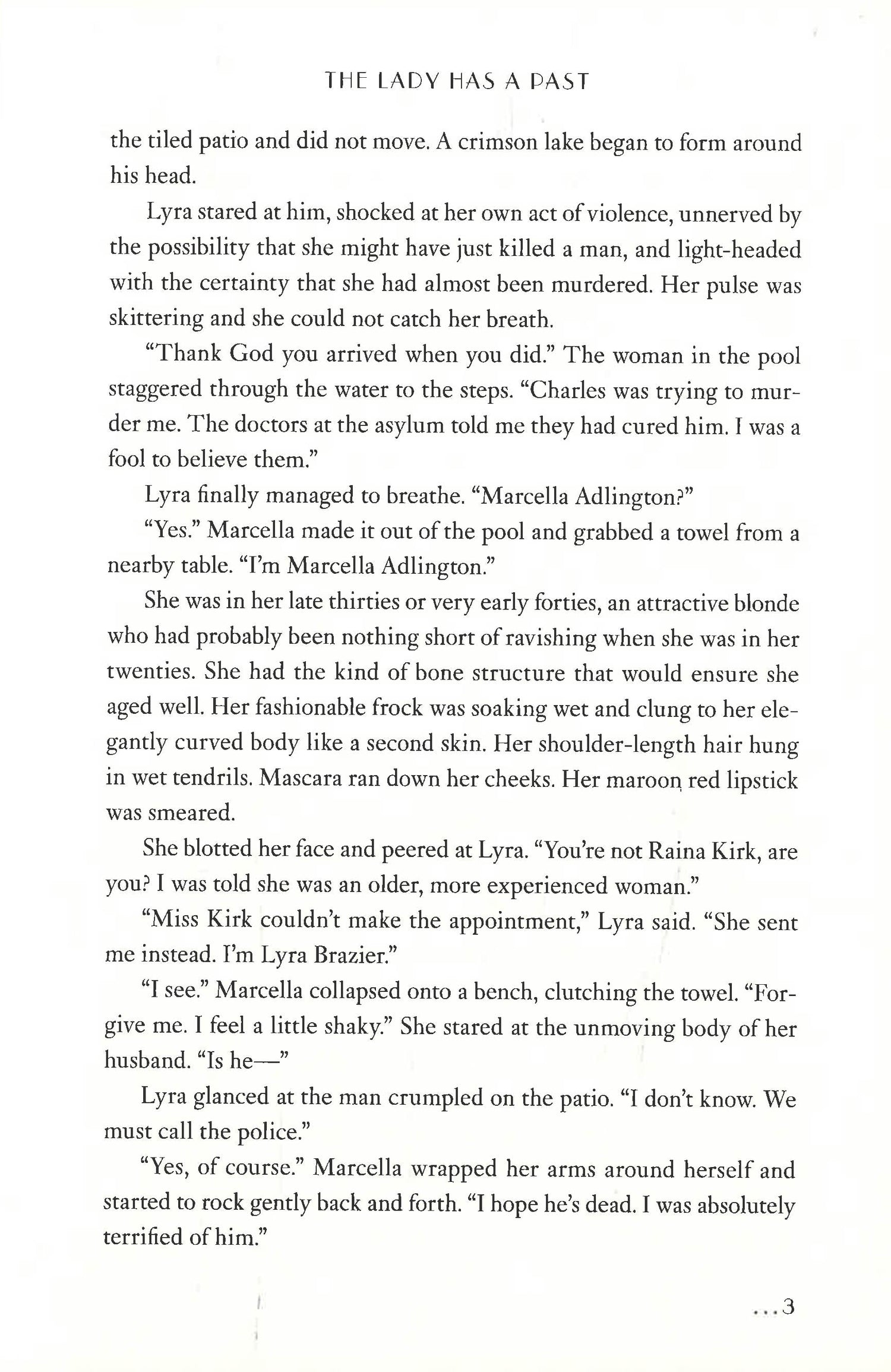 Instead of the suave, pistol-packing private eye she expected, though, Simon Cage is a mild-mannered antiquarian book dealer with a quiet, academic air, and a cool, remote gaze. Lyra suspects that Simon is much more than what he seems, and her instincts are confirmed when they arrive at the spa and pose as a couple: Simon has a unique gift that allows him to detect secrets, a skill that is crucial in finding Raina.