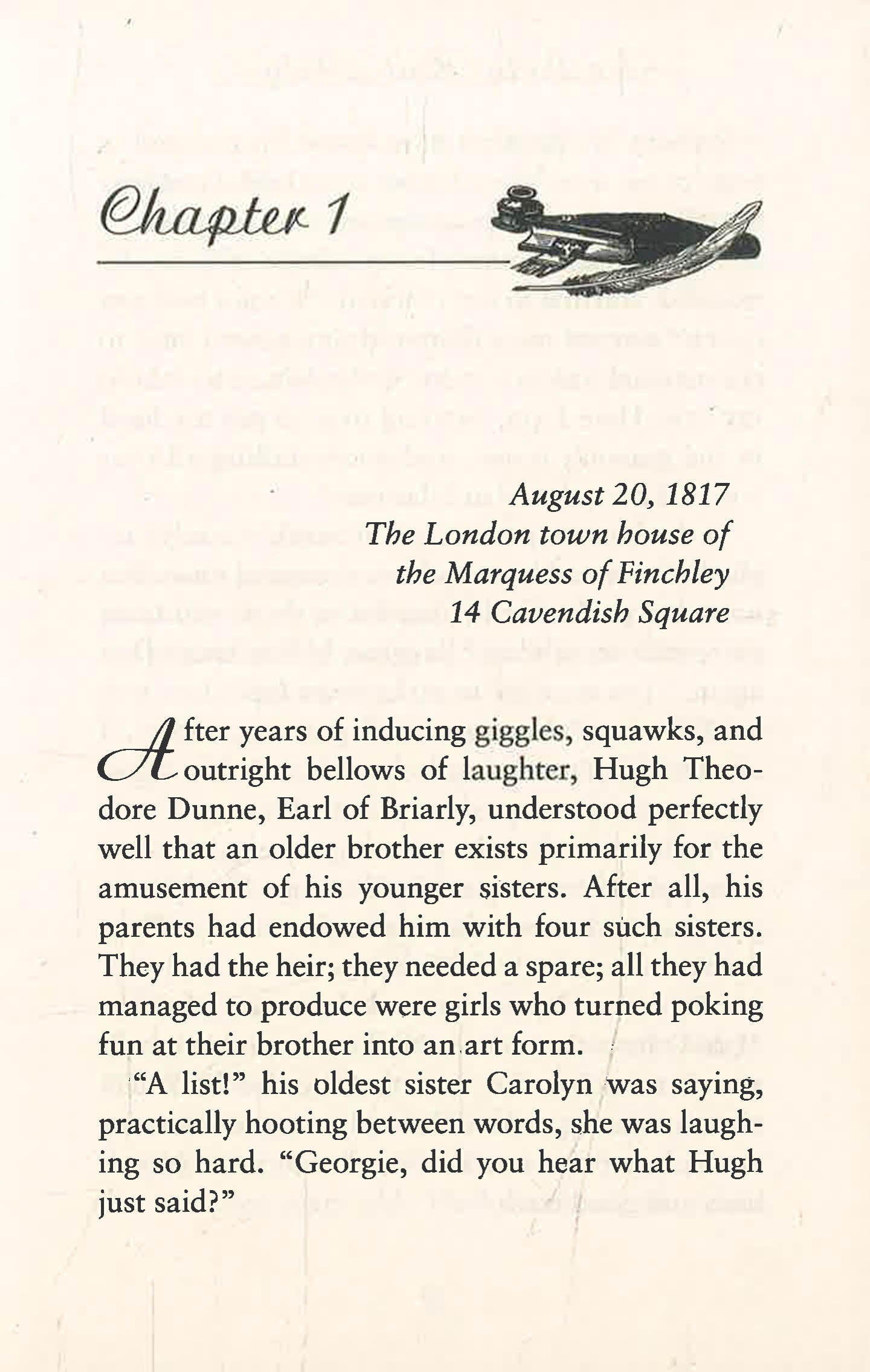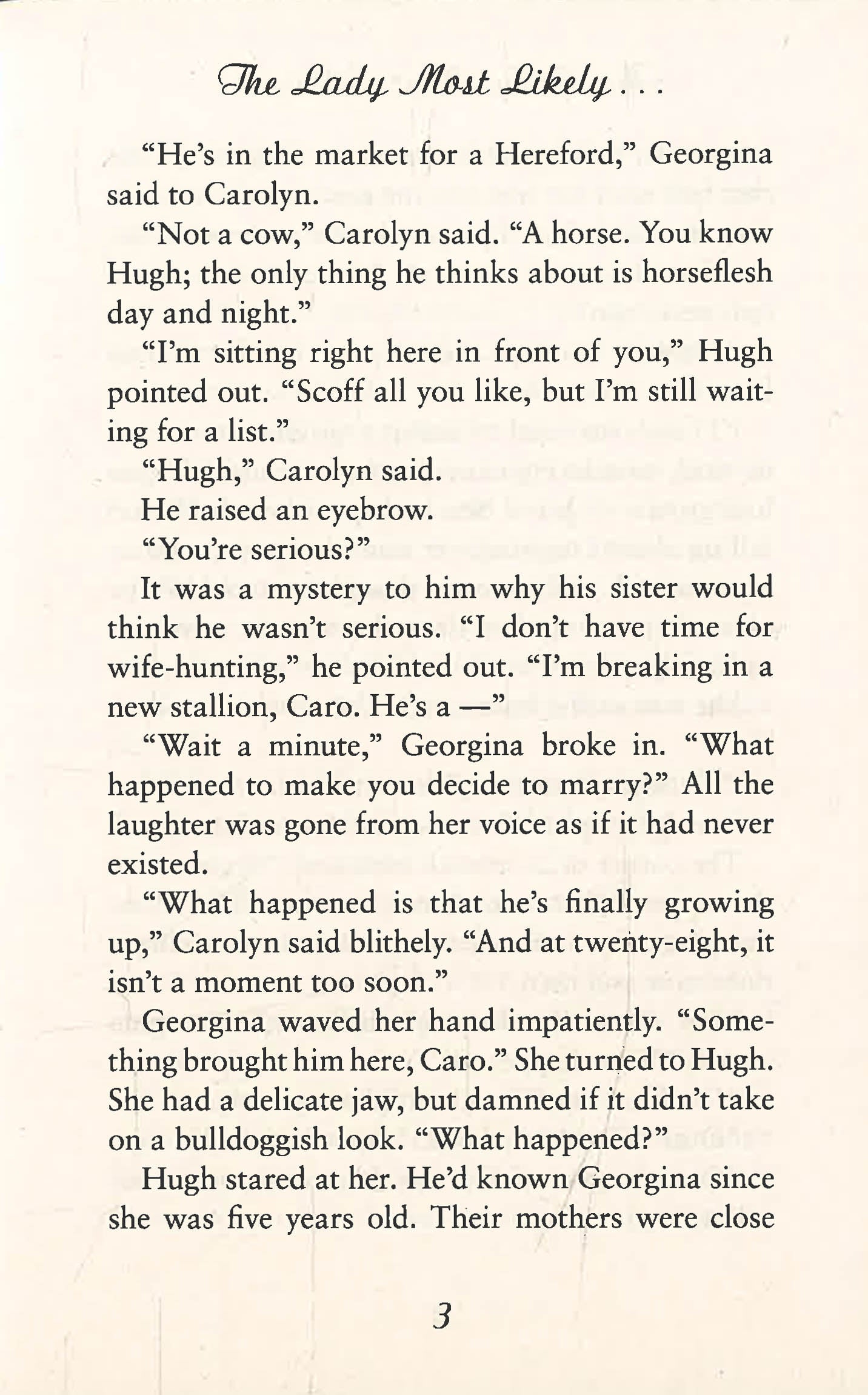 Hugh Dunne, the Earl of Briarly, needs a wife - so his sister hands him a list of the very best young ladies on the market. And then, because he refuses to tear himself away from the stables where he trains Arabian racehorses, she invites all those ladies to a house party, along with some other bachelors, of course.