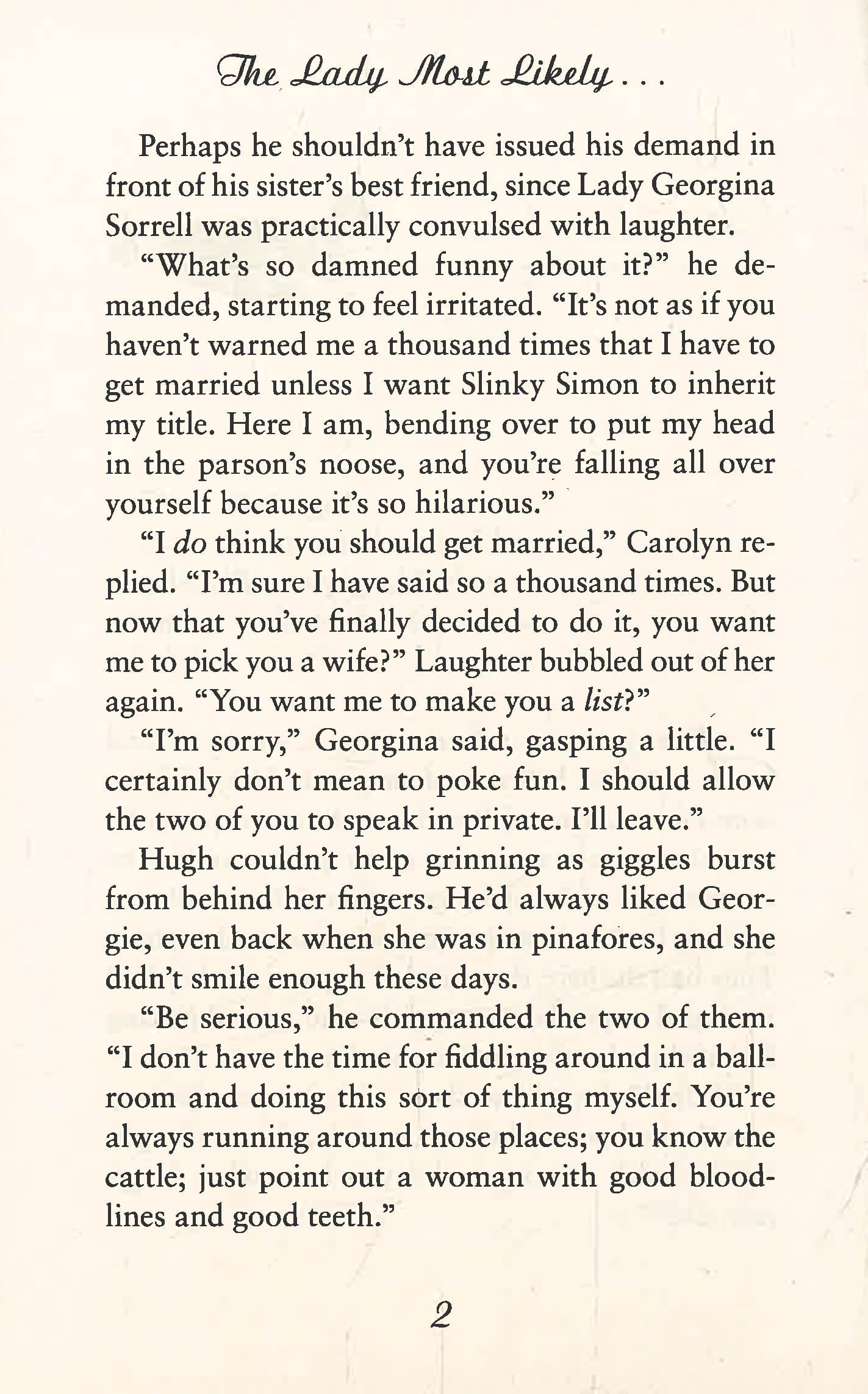 So who will Hugh choose? The Botticelli-esque, enchanting Gwendolyn? The outspoken, delightful Katherine? If he doesn't work fast, he'll lose those ladies to his closest friends, and then where will he look for a wife? Perhaps, just perhaps, toward a lady who's not on a market at all, and would require a great deal of persuading . . .