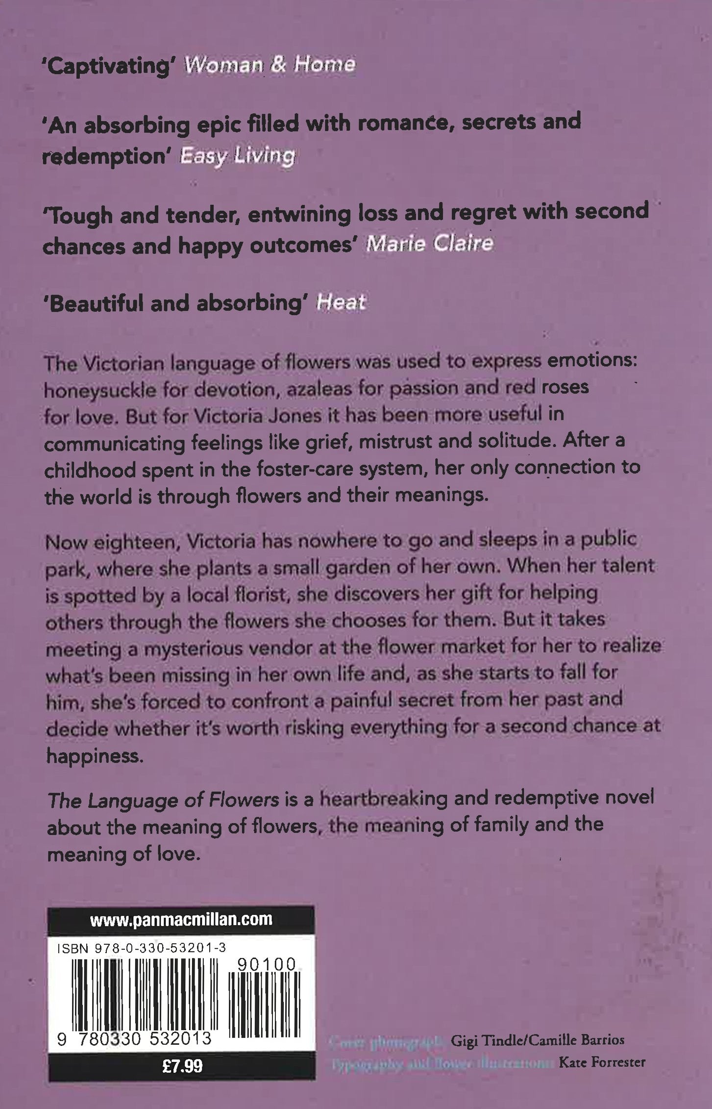 The Victorian language of flowers was used to express emotions: honeysuckle for devotion, azaleas for passion, and red roses for love. But for Victoria Jones, it has been more useful in communicating feelings like grief, mistrust and solitude. After a childhood spent in the foster care system, she is unable to get close to anybody, and her only connection to the world is through flowers and their meanings. Now eighteen, Victoria has nowhere to go, and sleeps in a public park, where she plants a small garden of her own. When her talent is discovered by a local florist, she discovers her gift for helping others through the flowers she chooses for them. But it takes meeting a mysterious vendor at the flower market for her to realise what's been missing in her own life, and as she starts to fall for him, she's forced to confront a painful secret from her past, and decide whether it's worth risking everything for a second chance at happiness. The Language of Flowers is a heartbreaking and redemptive novel about the meaning of flowers, the meaning of family, and the meaning of love.