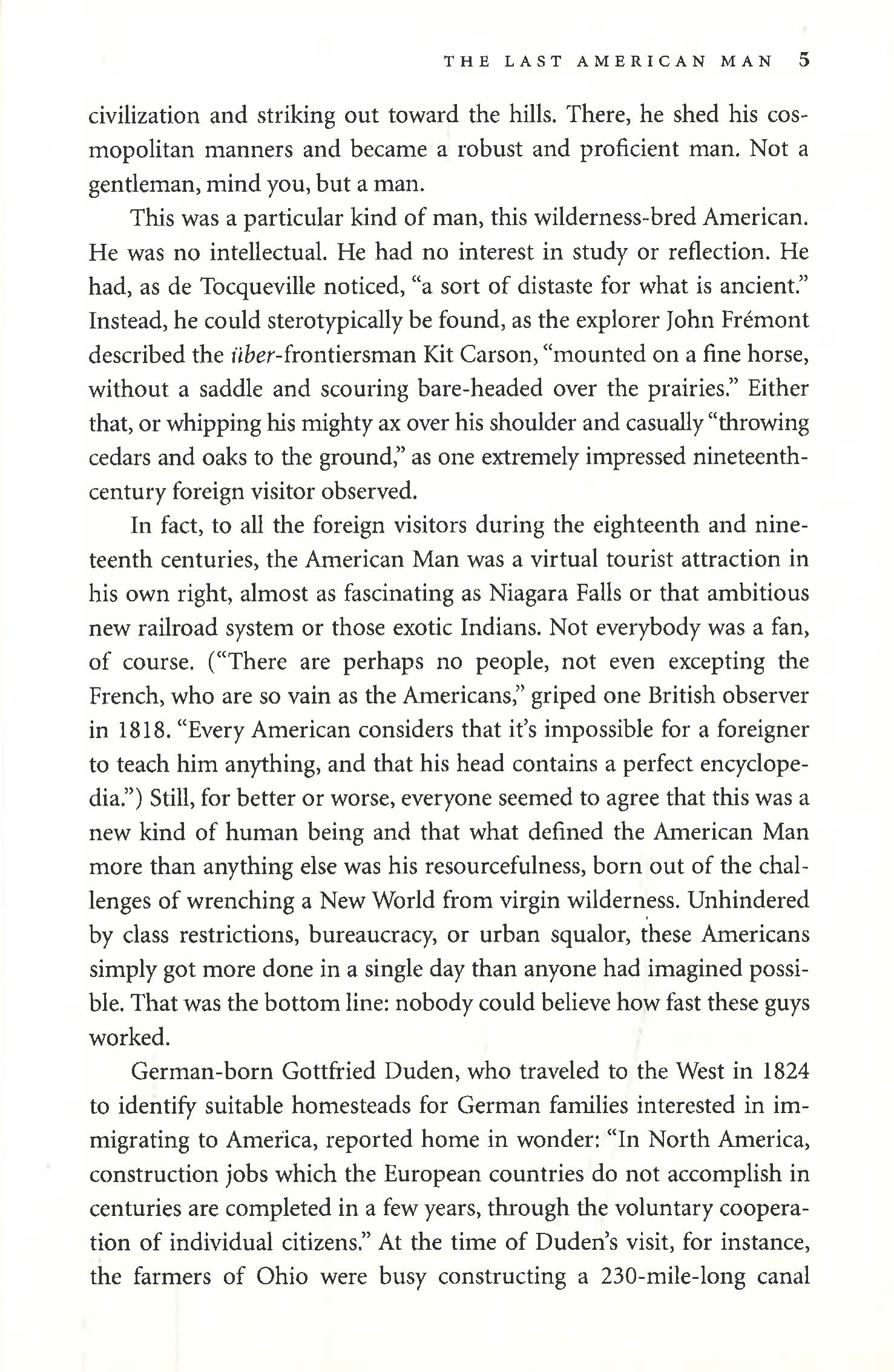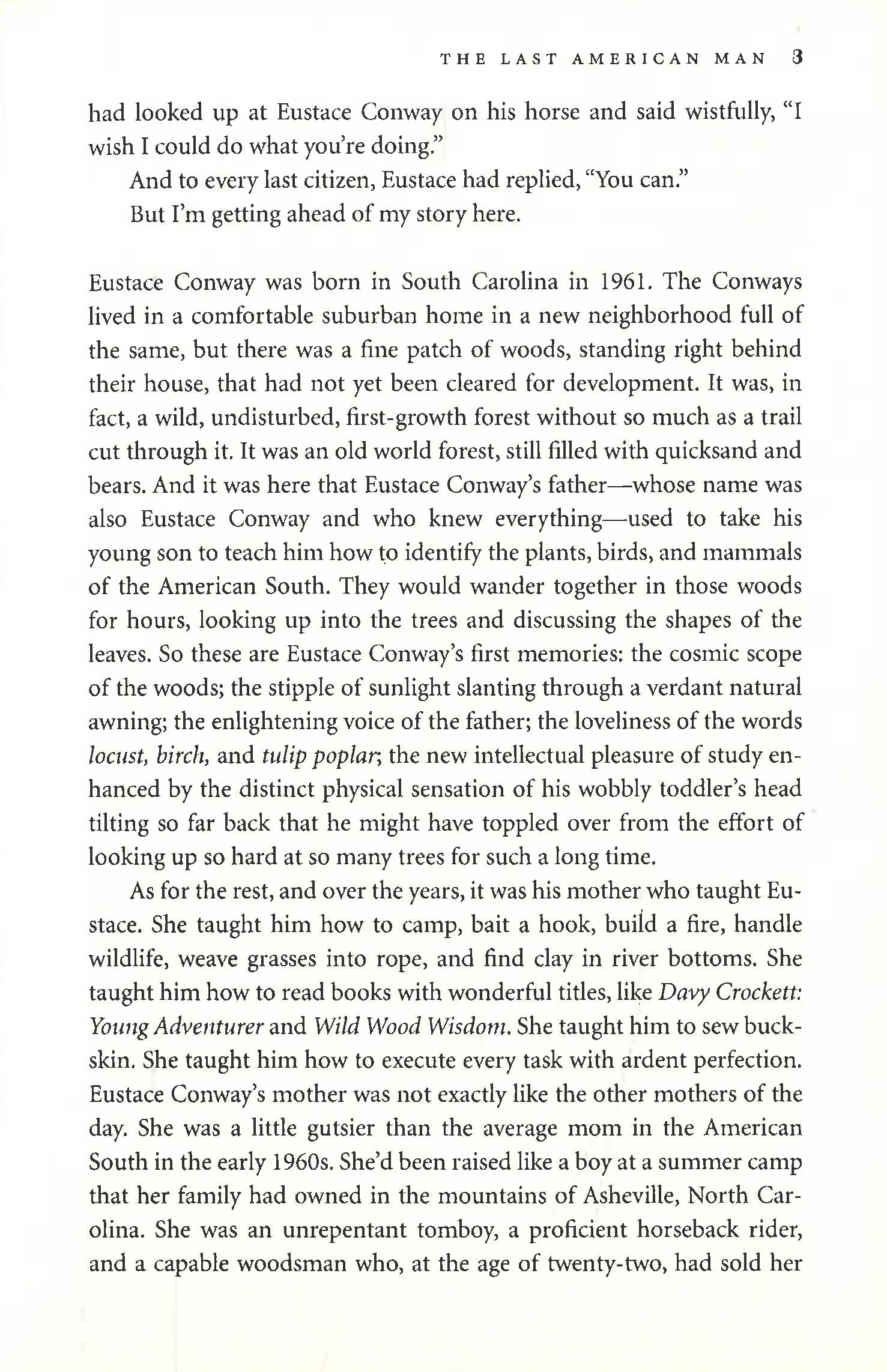 In this rousing examination of contemporary American male identity, acclaimed author and journalist Elizabeth Gilbert explores the fascinating true story of Eustace Conway. In 1977, at the age of seventeen, Conway left his family's comfortable suburban home to move to the Appalachian Mountains. For more than two decades he has lived there, making fire with sticks, wearing skins from animals he has trapped, and trying to convince Americans to give up their materialistic lifestyles and return with him back to nature. To Gilbert, Conway's mythical character challenges all our assumptions about what it is to be a modern man in America; he is a symbol of much we feel how our men should be, but rarely are.