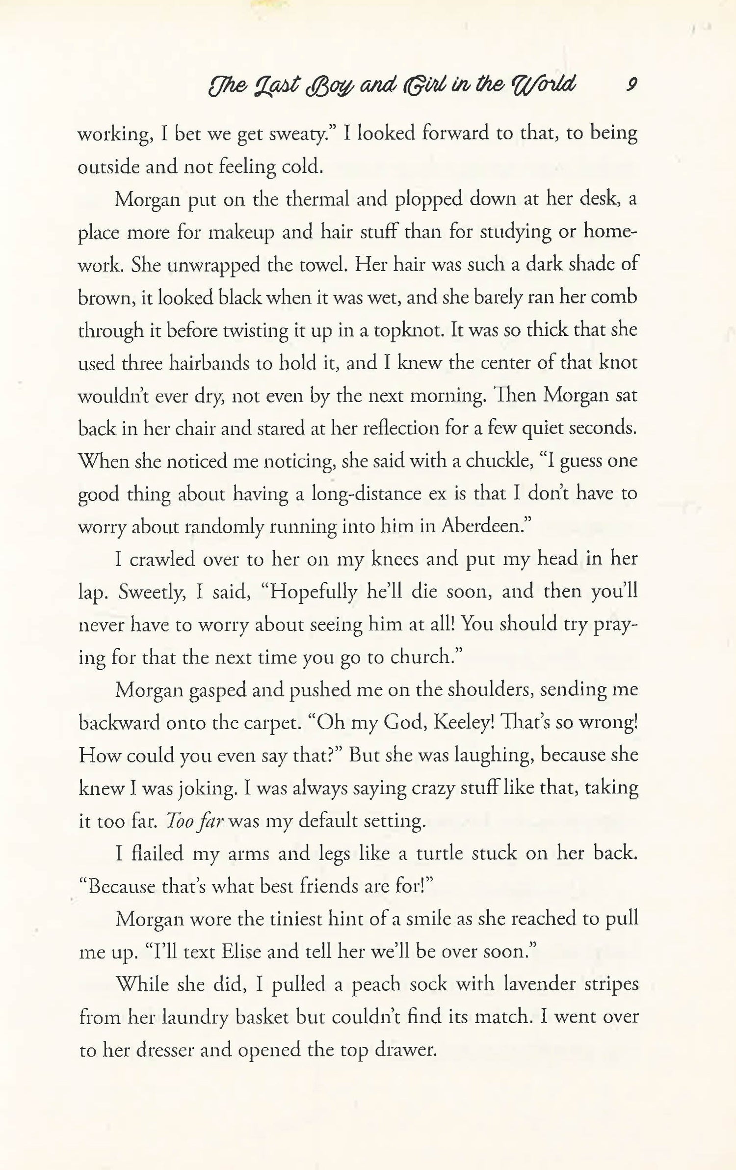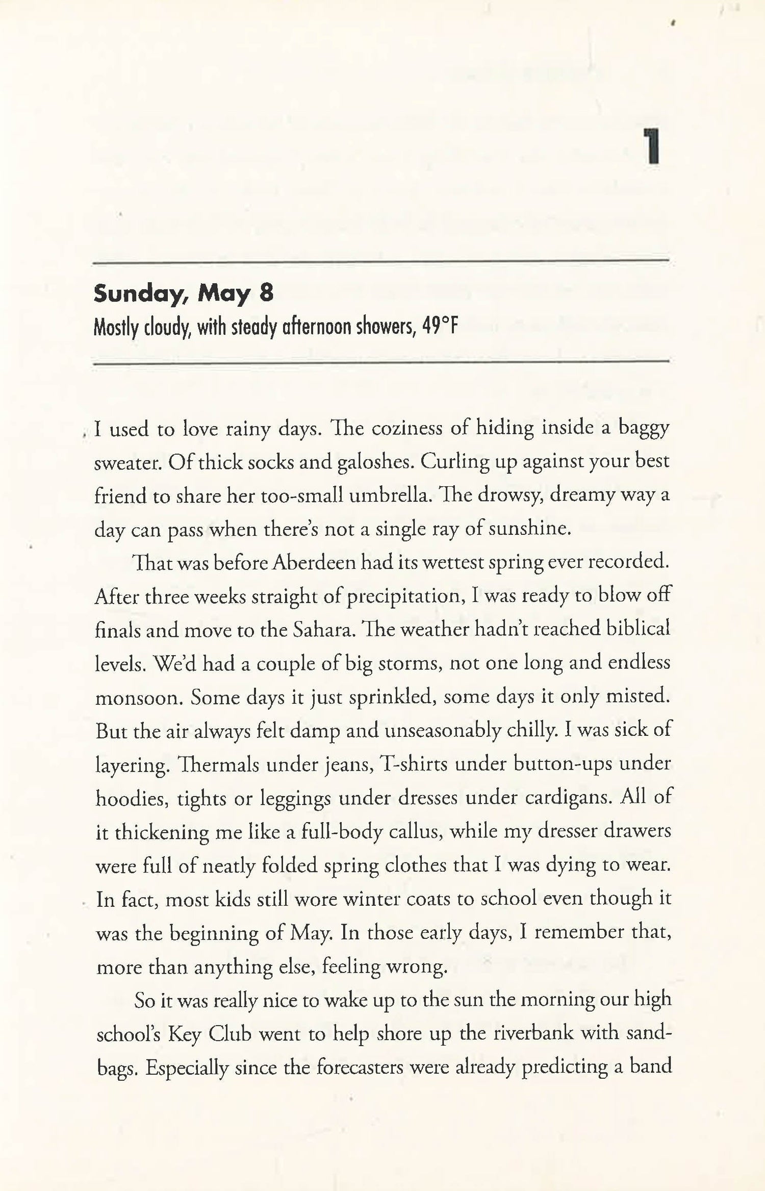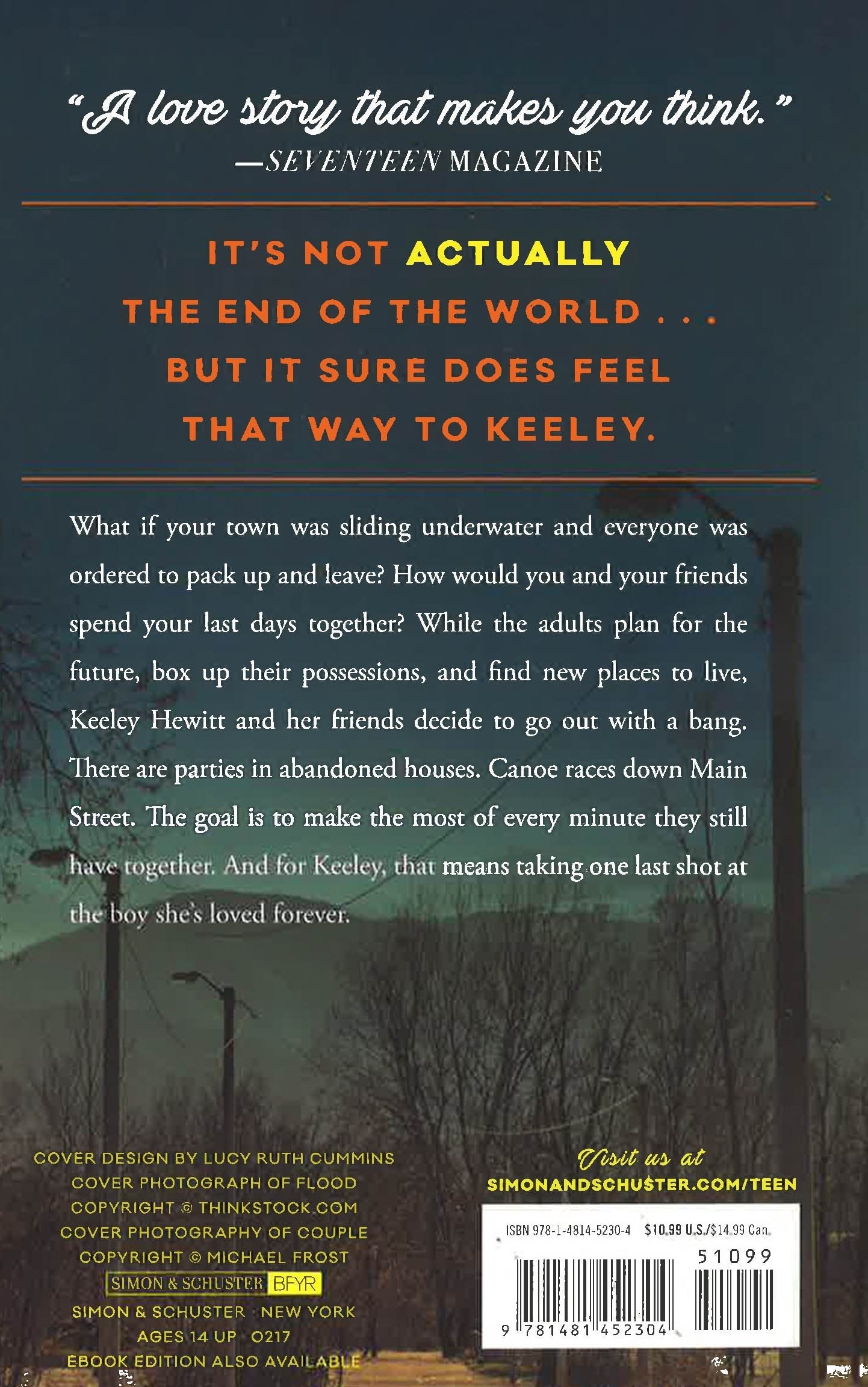 What if your town was sliding underwater and everyone was ordered to pick up and leave? How would you and your friends spend your last days together? While the adults plan for the future, box up their possessions, and find new places to live, Keeley Hewitt and her friends decide to go out with a bang. There are parties in abandoned houses. Canoe races down Main Street. The goal is to make the most of every minute they still have together. And for Keeley, that means taking one last shot at the boy she's loved forever.