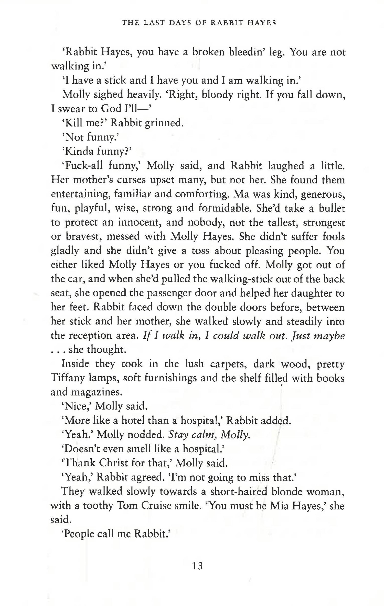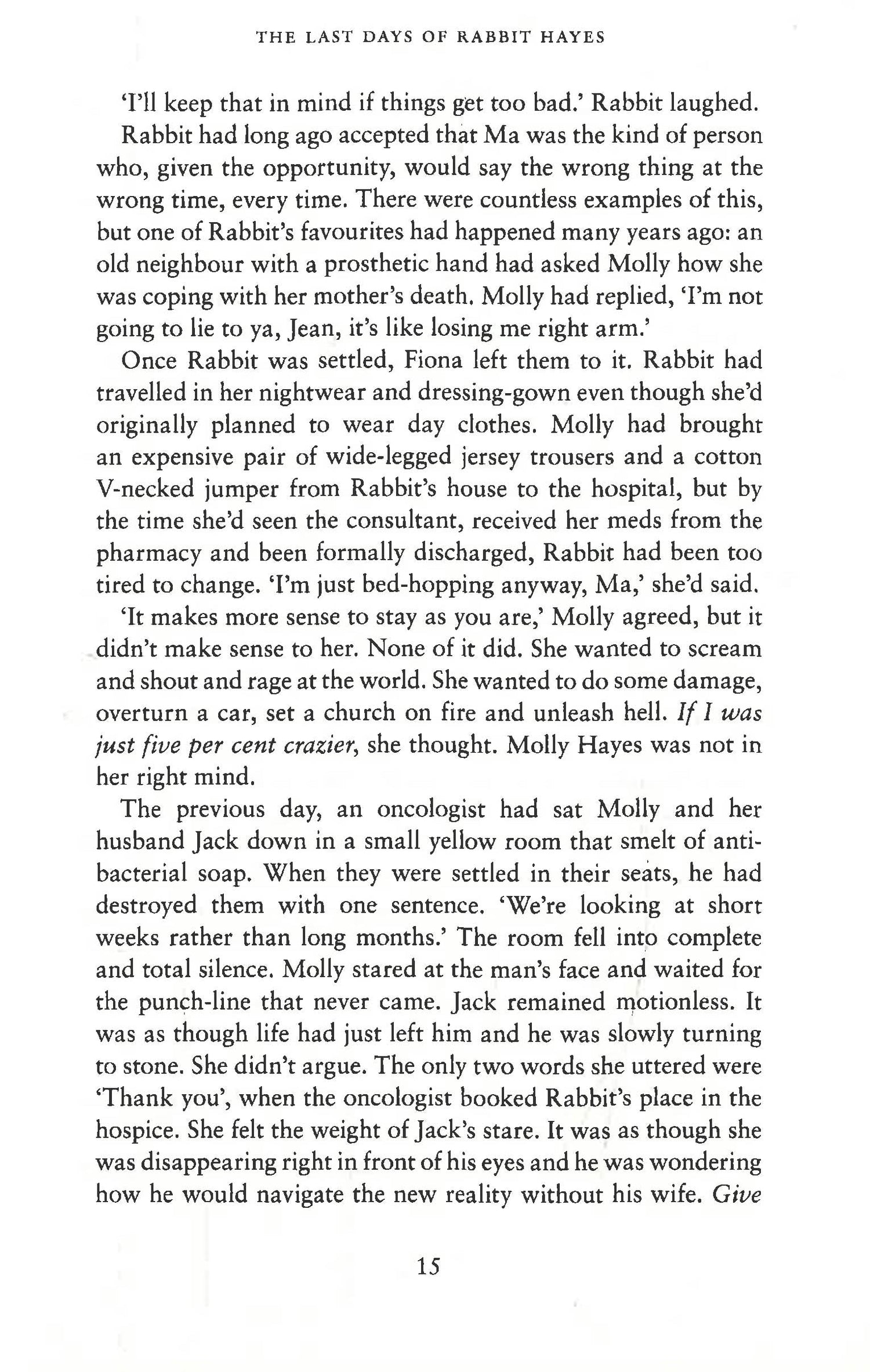 Rabbit is feisty. With every ounce of love and strength in her, she promises that she will overcome. She will fight, fight, fight. She will be with those who love her for as long as she can. As her friends and family rally to celebrate Rabbit's last days, they look to her for strength, support, and her unyielding zest for life - because she is Rabbit Hayes, and she will live until she dies.