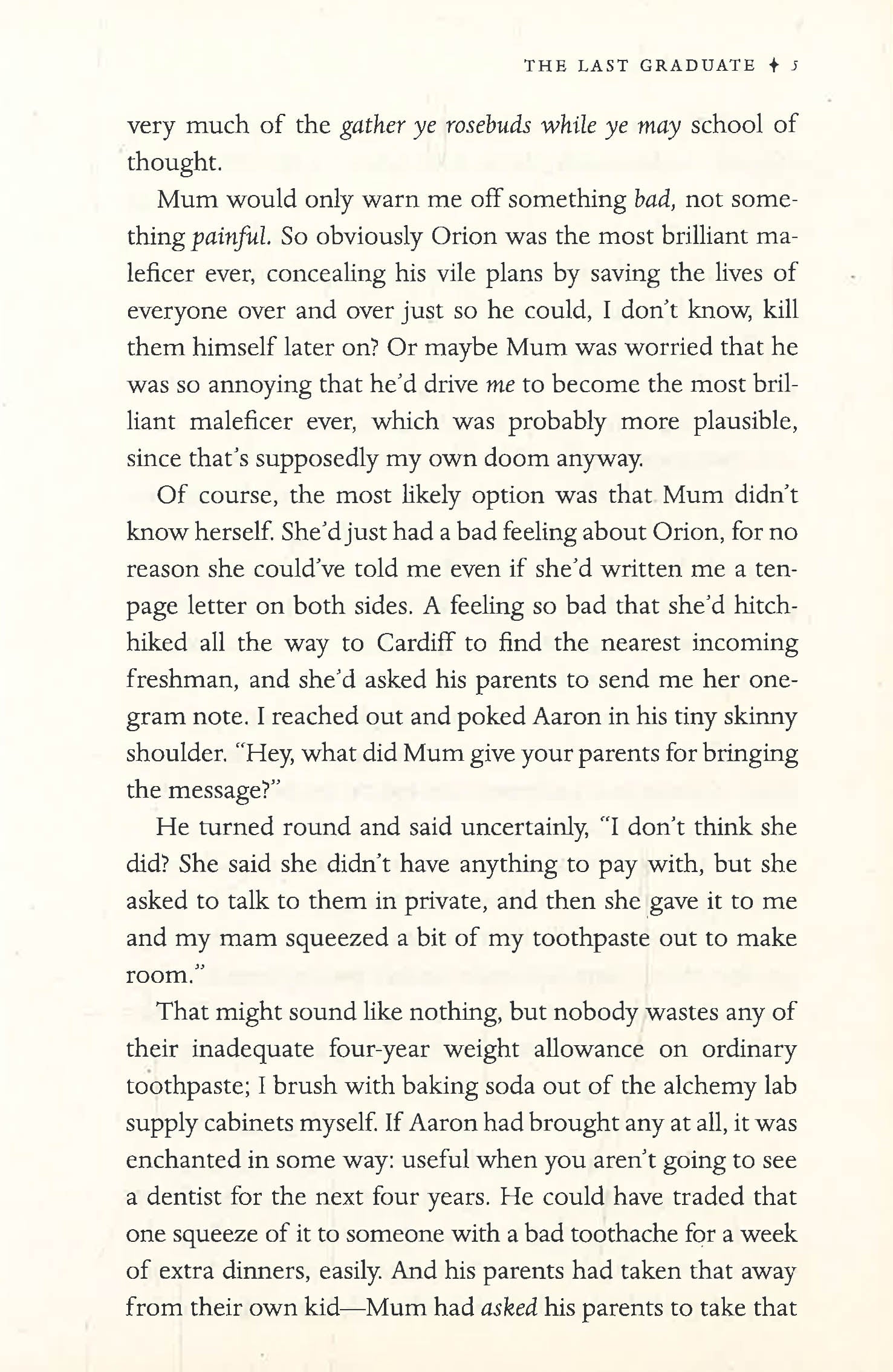 As the savagery of the school ramps up, El is determined that she will not give in; not to the mals, not to fate, and especially not to the Scholomance. But as the spectre of graduation looms -- the deadly final ritual that leaves few students alive -- if she and her allies are to make it out, El will need to realise that sometimes winning the game means throwing out all the rules.