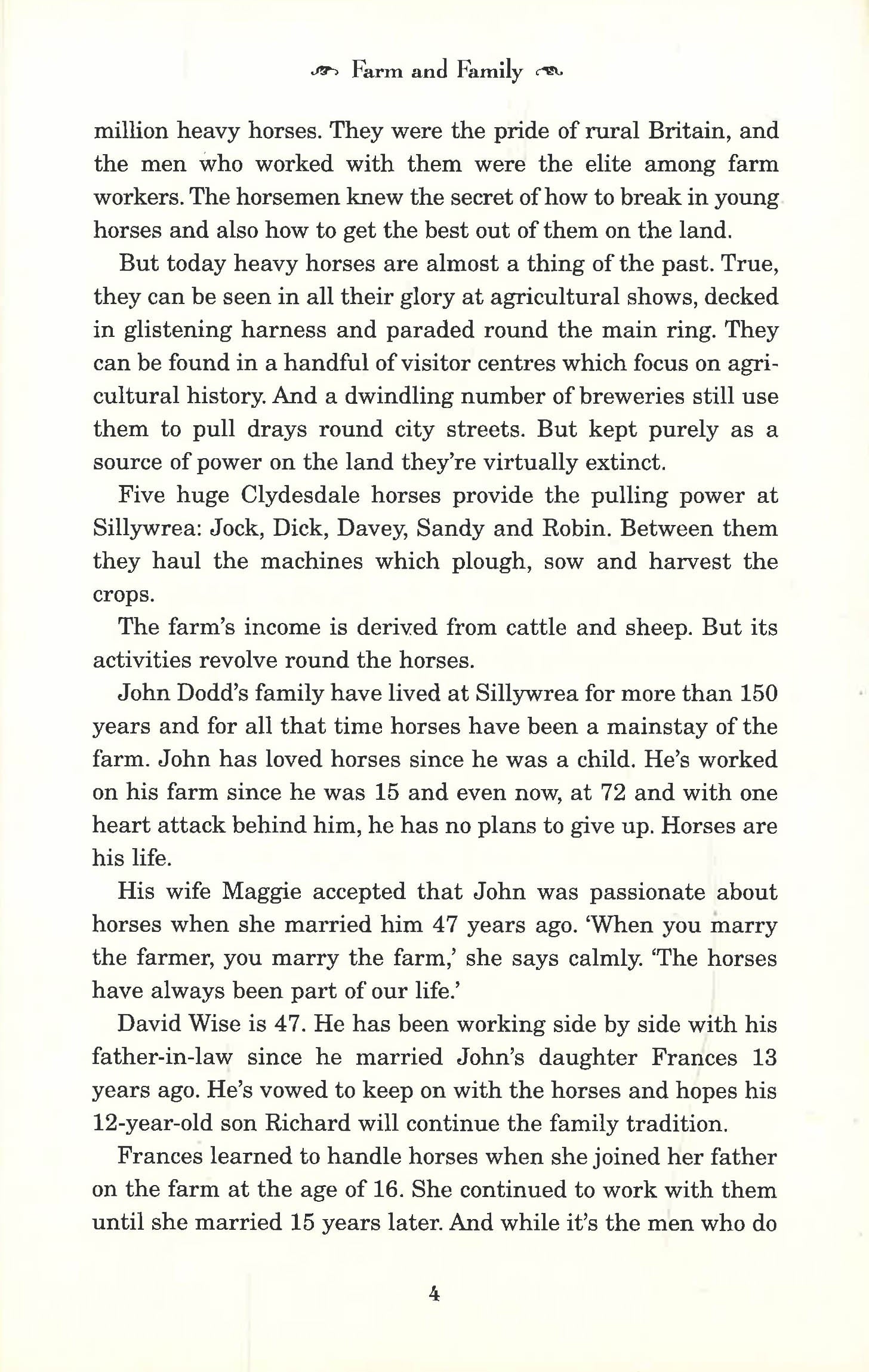 A century ago, power on farms was provided by one and a half million heavy horses, the pride of rural Britain. Today, heavy horses in the countryside are a distant memory, except Sillywrea Farm in Northumberland. It is the last farm in the country where all the jobs requiring the strength and power usually provided by machinery are still done by horses. John Dodd's family have lived at Sillywrea farm for more than 150 years and horses have always been the source of power. The work is hard, but John, his son-in-law David Wise and their five huge Clydesdales run the farm to the rhythms of the seasons, allowing nature to lead the way. The Last Horsemen provides a glimpse of a unique way of life and, in today's world of intensive farming and mass-produced food, is a reminder that we can still learn from the past.