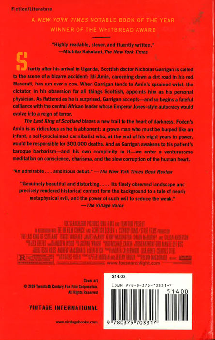 Shortly after his arrival in Uganda, Scottish doctor Nicholas Garrigan is called to the scene of a bizarre accident: Idi Amin, careening down a dirt road in his red Maserati, has run over a cow. When Garrigan tends to Amin, the dictator, in his obsession for all things Scottish, appoints him as his personal physician. And so begins a fateful dalliance with the central African leader whose Emperor Jones-style autocracy would transform into a reign of terror. In The Last King of Scotland Foden's Amin is as ridiculous as he is abhorrent: a grown man who must be burped like an infant, a self-proclaimed cannibalist who, at the end of his 8 years in power, would be responsible for 300,000 deaths. And as Garrigan awakens to his patient's baroque barbarism--and his own complicity in it--we enter a venturesome meditation on conscience, charisma, and the slow corruption of the human heart. Brilliantly written, comic and profound, The Last King of Scotland announces a major new talent.