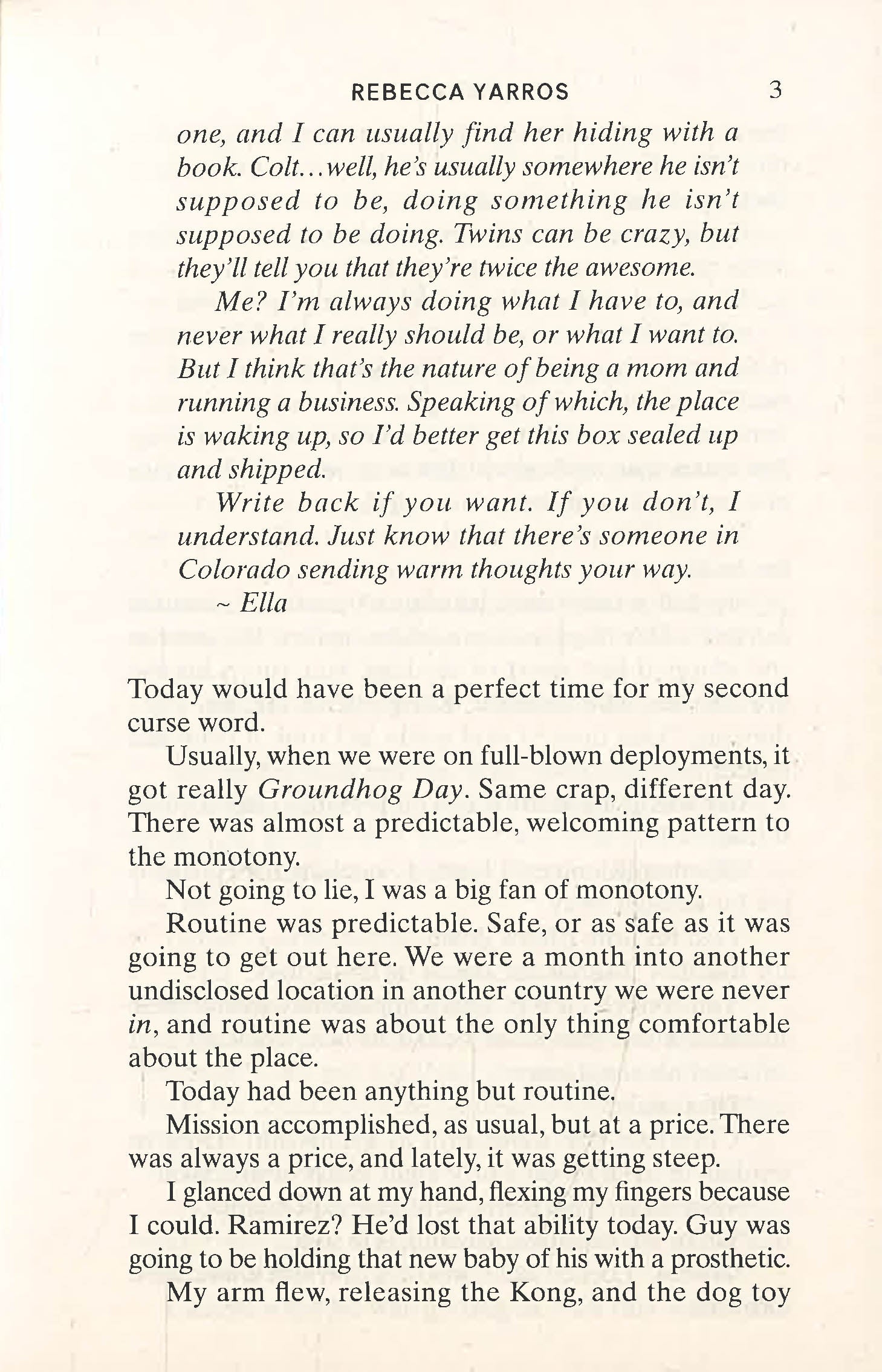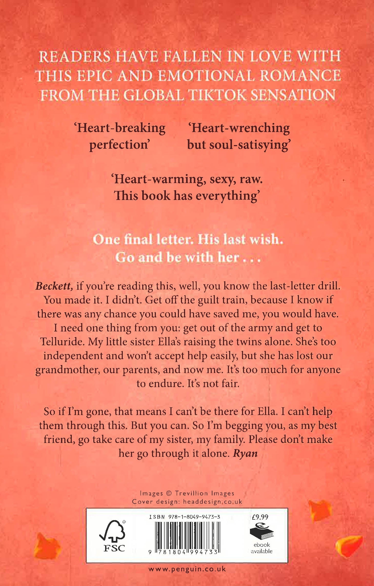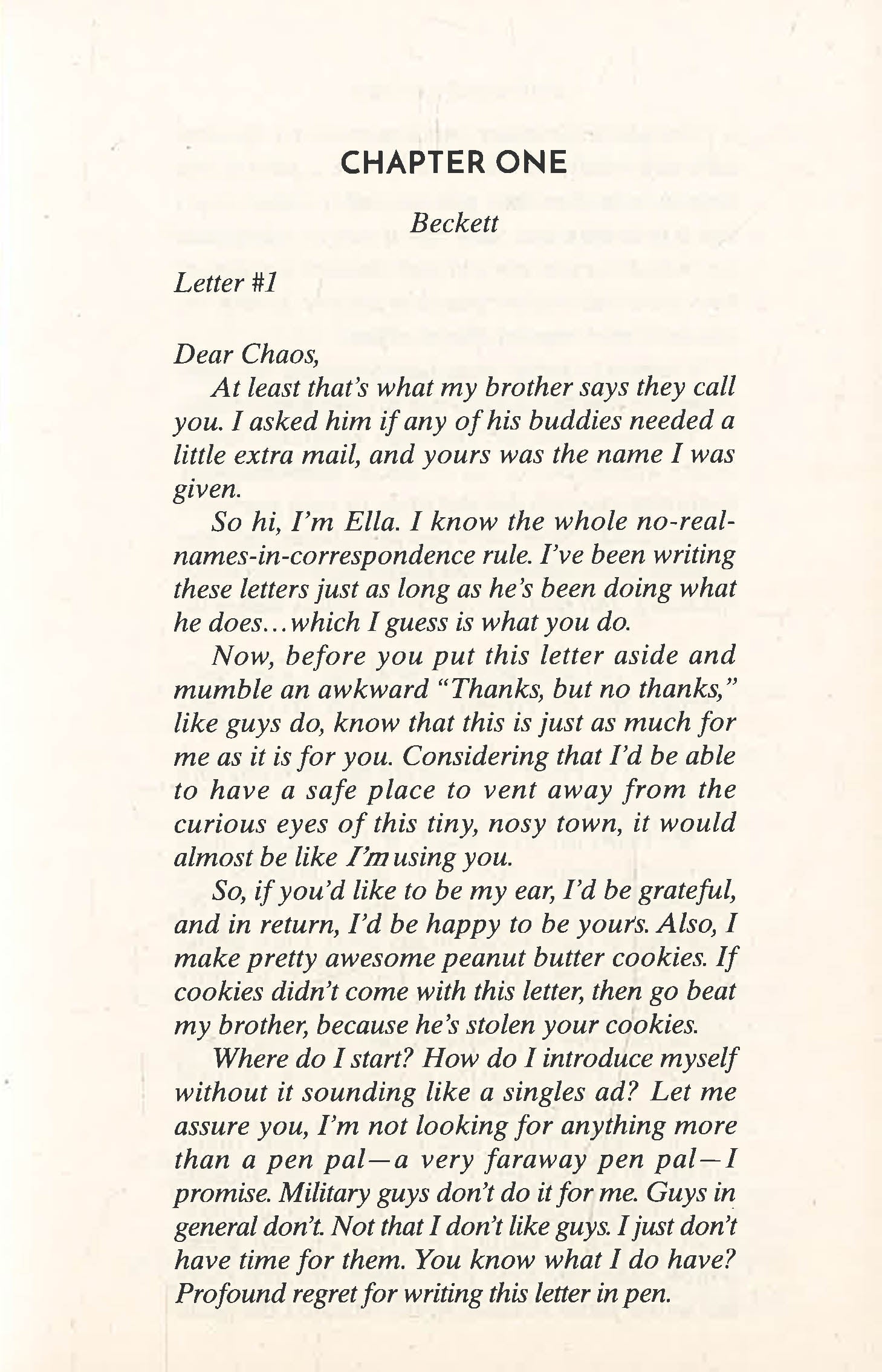 One letter. That was all it took for Beckett Gentry to fall for Ella MacKenzie, his buddy Ryan’s sister. Through her letters, Ella spoke to his heart, fueled his dreams, and made his days in Afghanistan bearable. Until Ryan’s life ends and so do the letters. Leaving the military, Beckett heads to Colorado with one destination in mind - Ella. Despite the guilt Beckett feels over his friend’s death, he’s determined to carry out his promise to watch over Ryan’s sister and never tell Ella he’s the one she’d been writing to. At twenty-six, Ella has lost almost everyone she loves - and now one of her precious twins is battling cancer. When Beckett walks into her tiny town - all six-feet-plus of dark, brooding, gorgeous man - Ella barely takes notice. Okay, fine, of course she takes notice. He’s come with the last of Ryan’s letters and the promise that he’d made to watch over her, but he’s insanely tight-lipped about everything else. Now Beckett is everywhere - and the most irritating part is that she likes him, despite his tough-as-nails exterior.