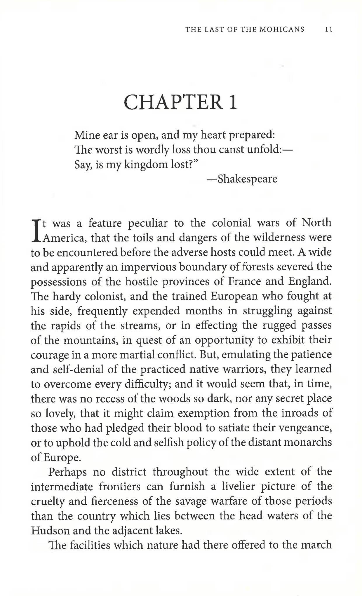 The Last of the Mohicans is a historical novel, it is the second book of the Leatherstocking Tales pentalogy. The story takes place in 1757, during the French and Indian War, when France and Great Britain battled for control of the North American colonies and the French called on allied Native American tribes to fight against the British soldiers.