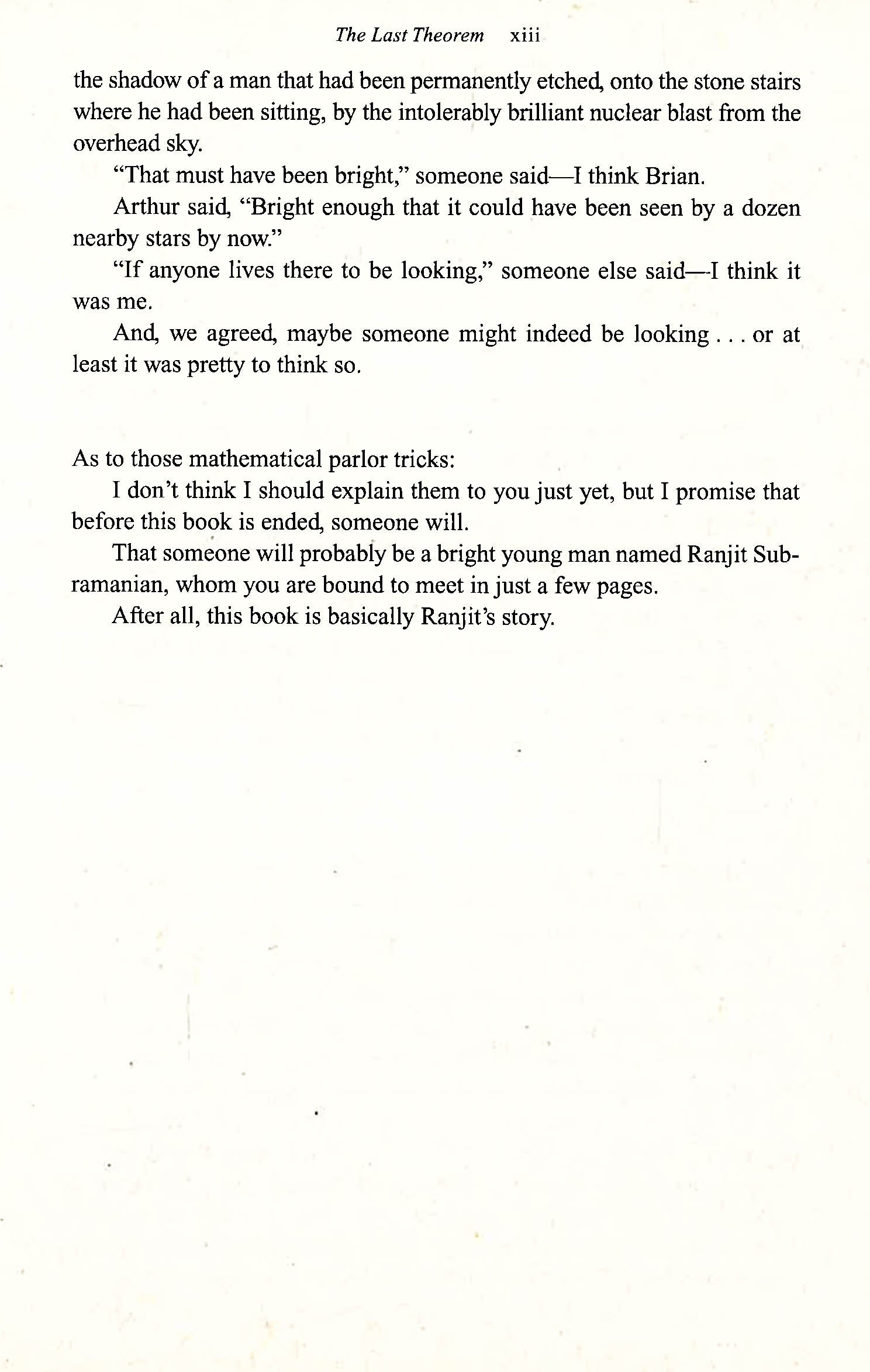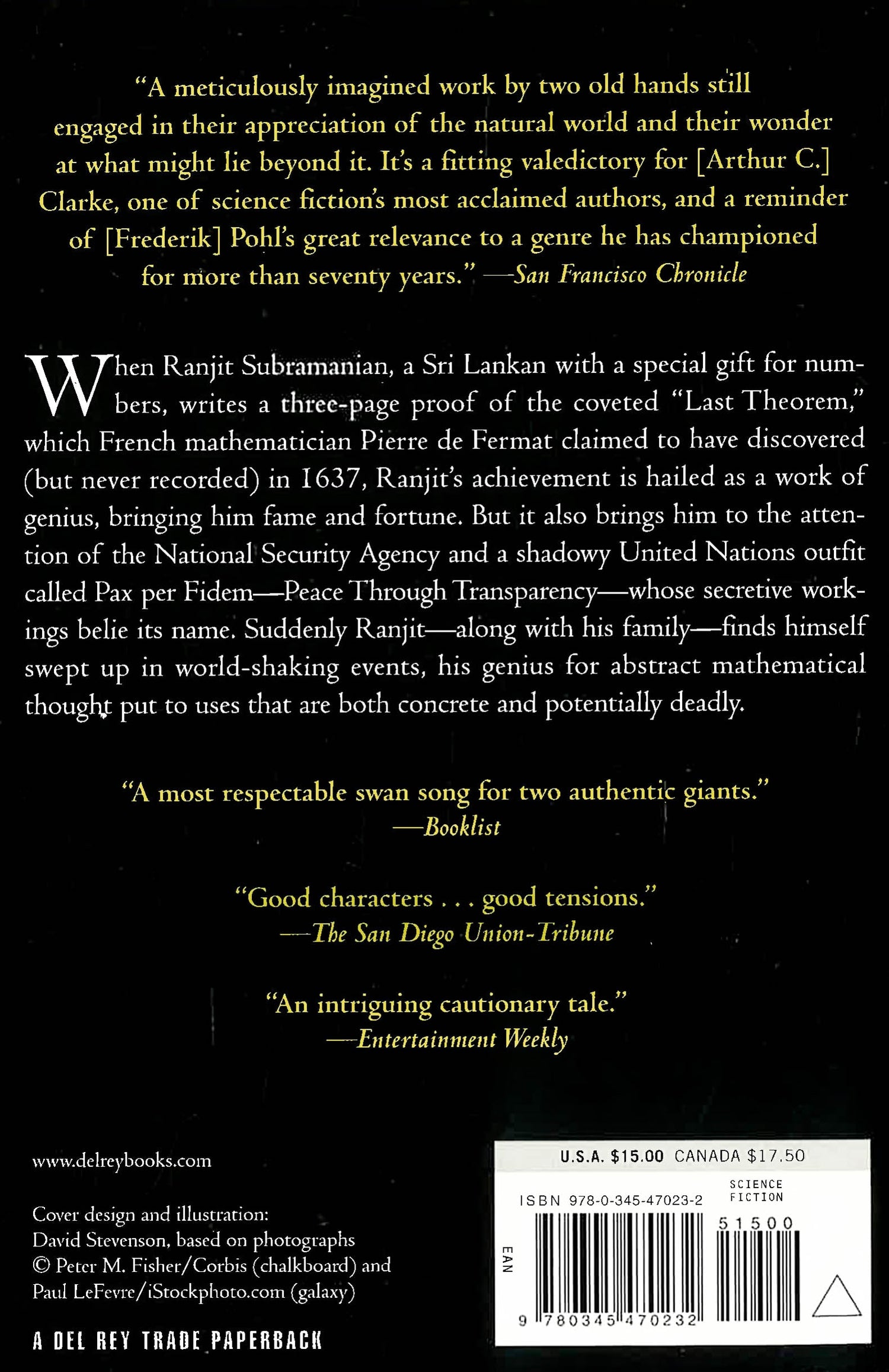 When Ranjit Subramanian, a Sri Lankan with a special gift for numbers, writes a three-page proof of the coveted "Last Theorem," which French mathematician Pierre de Fermat claimed to have discovered (but never recorded) in 1637, Ranjit's achievement is hailed as a work of genius, bringing him fame and fortune. But it also brings him to the attention of the National Security Agency and a shadowy United Nations outfit called Pax per Fidem-or Peace Through Transparency-whose secretive workings belie its name. Suddenly Ranjit-along with his family-finds himself swept up in world-shaking events, his genius for abstract mathematical thought put to uses that are both concrete and potentially deadly.