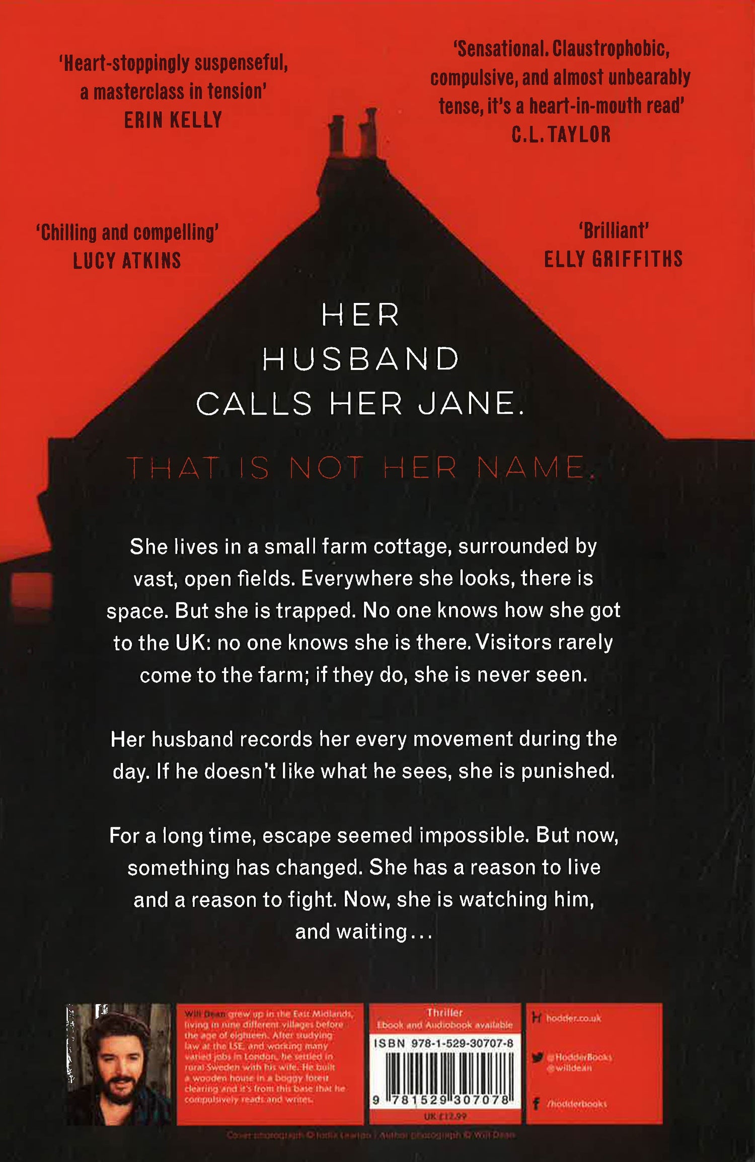 'I couldn't put it down. A visceral nightmare of a book with one of the most evil villains I've come across in a long time. Powerful writing' STEVE CAVANAGH 'Ratchets up the tension to the point where I had to check my pulse' LIZ NUGENT 'Heart-stoppingly suspenseful, a masterclass in tension' ERIN KELLY 'A heart-racing exploration about human survival. An addictive and insightful thriller' MAXINE MEI-FUNG CHUNG He is her husband. She is his captive. Her husband calls her Jane. That is not her name. She lives in a small farm cottage, surrounded by vast, open fields. Everywhere she looks, there is space. But she is trapped. No one knows how she got to the UK: no one knows she is there. Visitors rarely come to the farm; if they do, she is never seen. Her husband records her every movement during the day. If he doesn't like what he sees, she is punished. For a long time, escape seemed impossible. But now, something has changed. She has a reason to live and a reason to fight. Now, she is watching him, and waiting . . . 'Brilliant' ELLY GRIFFITHS 'Sensational. Claustrophobic, compulsive, and almost unbearably tense it's a heart-in-mouth read that's packed with suspense. Readers will be saying 'just one more page' all the way from the gripping beginning to the heart-stopping end' C.L. TAYLOR 'Seriously nail-biting stuff! I raced through it, my heart in my mouth' EMMA CURTIS 'Tremendously powerful and fantastically written, heart-stopping from page one. Expect to see it on all the award lists' SARAH HILARY ************************************** Praise for Will Dean's storytelling: 'Loaded with atmosphere, brilliant on setting' Mark Billingham 'The best thriller I've read in ages' Marian Keyes 'Atmospheric, creepy and tense' C.J. Tudor 'Memorably atmospheric' Guardian 'Impressive' The Times 'Crackles along at a roaring pace' Observer