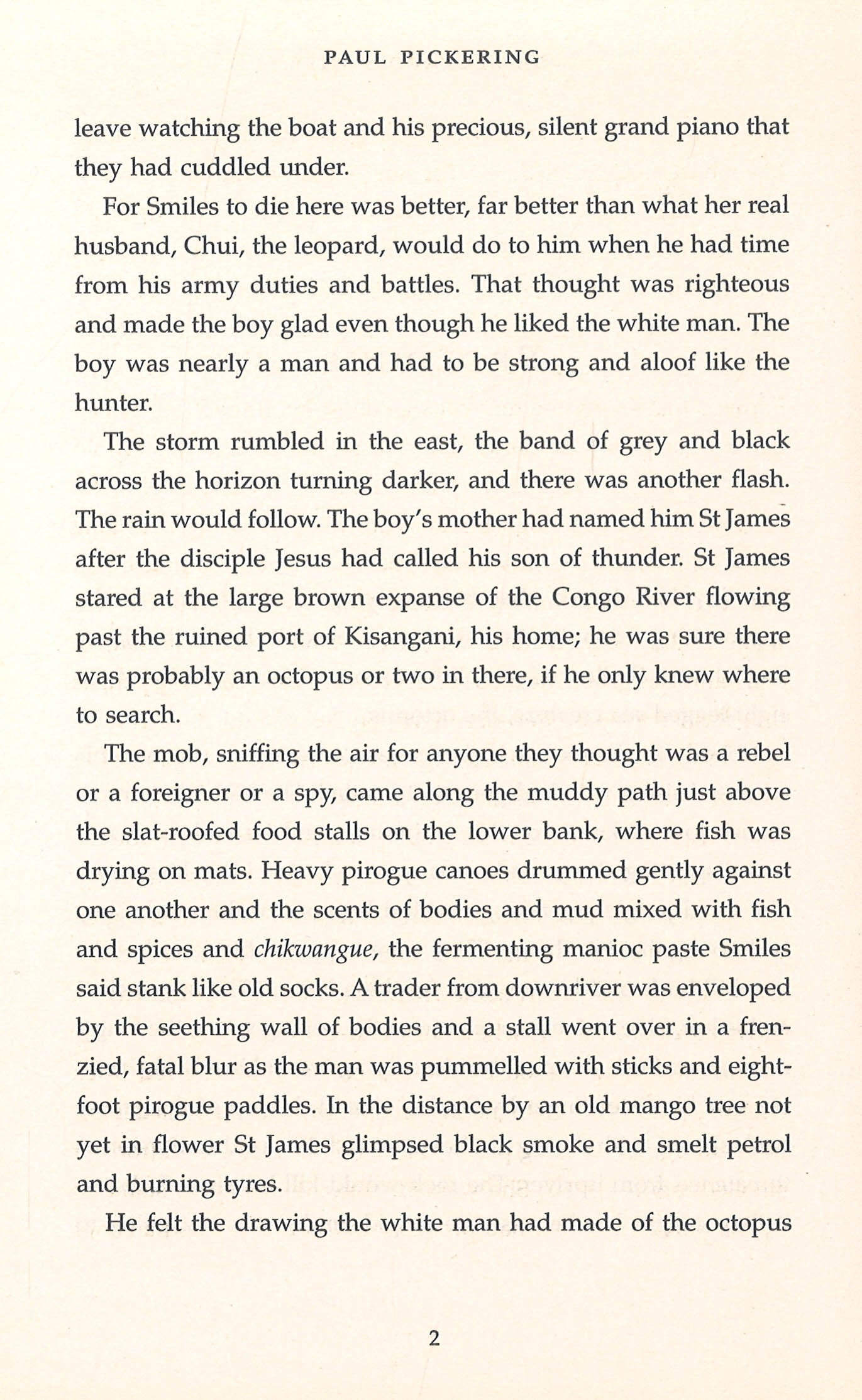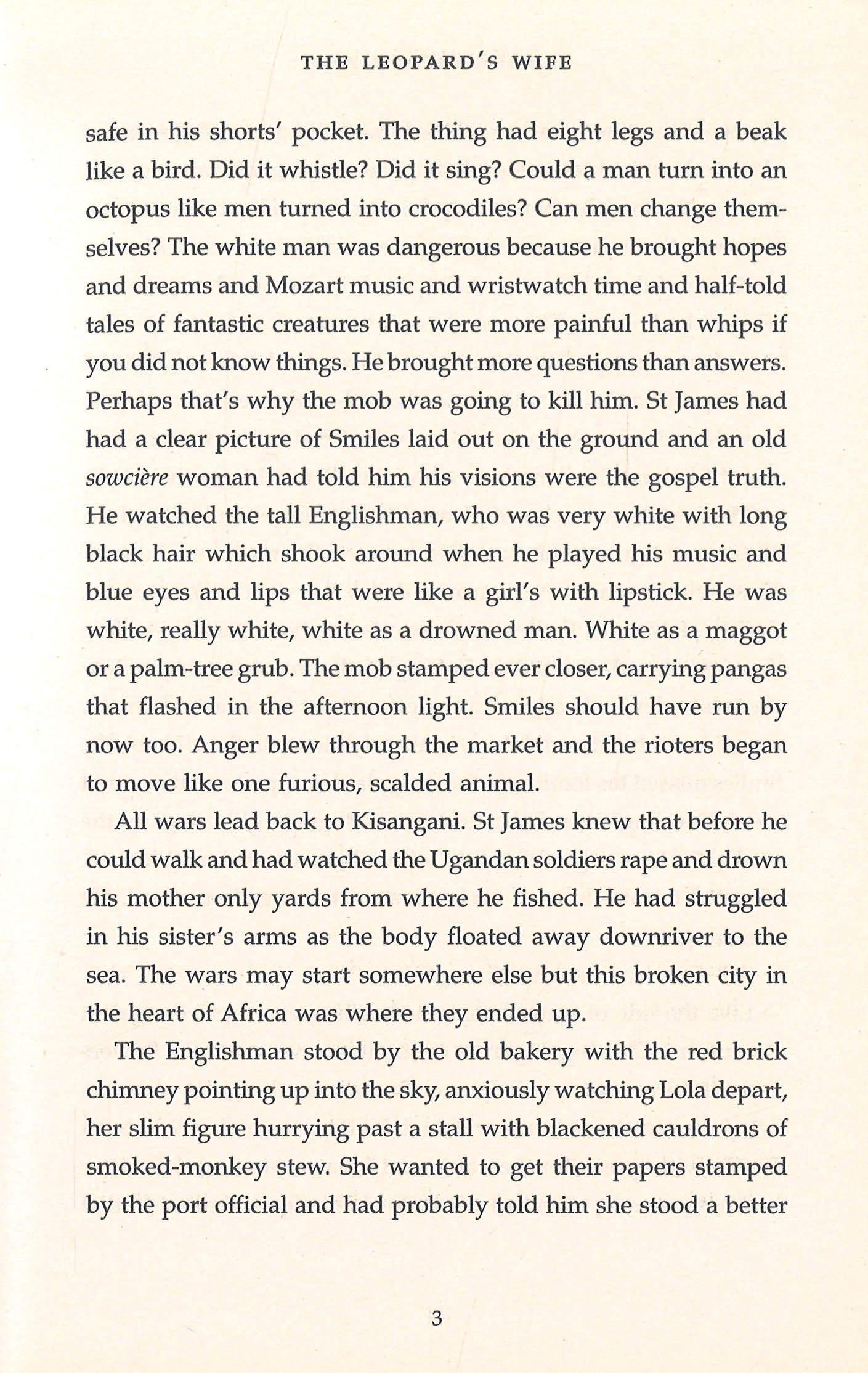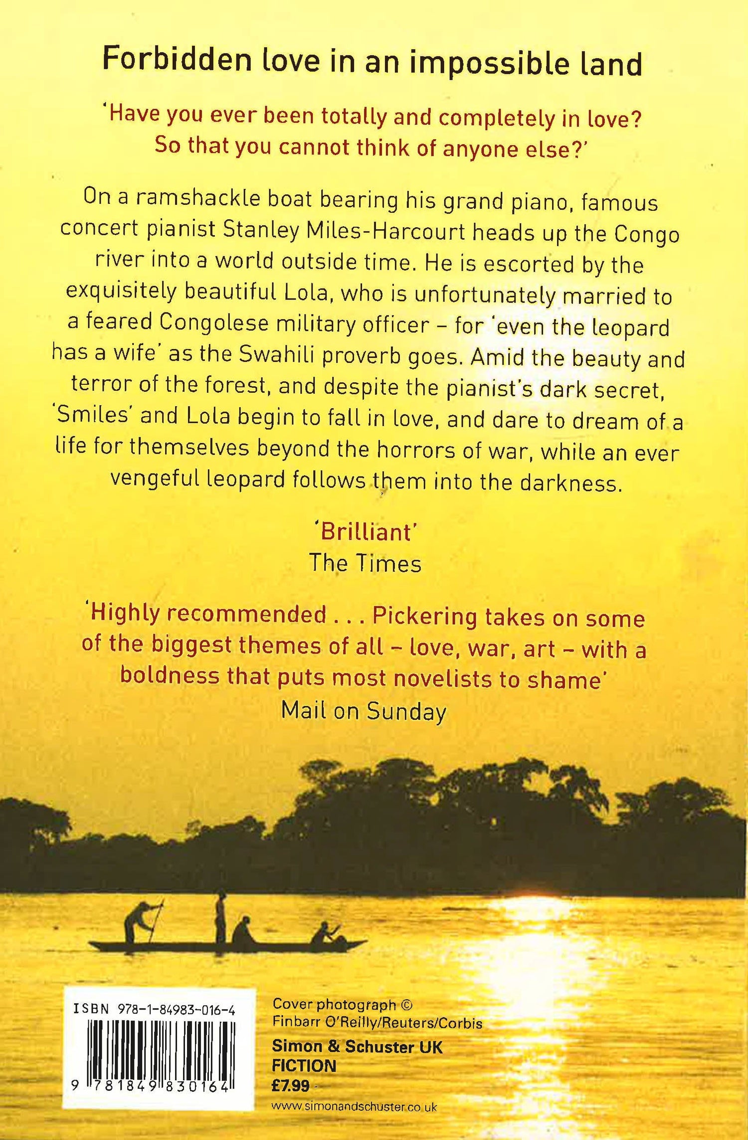 The Leopard's Wifeis a novel of love in an impossible land. Smiles, a famous English concert pianist, wants to make amends with his African-American schoolmaster, Lyman Andrew, who has buried himself in the war-torn jungle of the Congo. Smiles owes his success to the man he helped ruin and harbors a dark secret from the past and his brutal public school. But a bomb has exploded at a hotel in Kinshasa where Smiles was due to play at a peace and reconciliation concert and he is accidentally invited to his own funeral. Coffins are broken open by the Presidential Guard and when he is not in his, Smiles is suspected of being one of the rebels. He escapes on a ramshackle boat with the grand piano meant for his recital, which is now destined for his old schoolmaster more than a thousand miles upriver, where the rebel forces are gathering and exiles are fleeing the war in the east. On the way he falls in love with Lola, the beautiful wife of Xavier, the head of the Presidential Guard and the Leopard of the title, and Smiles begins to appreciate anew the majesty of creation and the Congo as he brings Beethoven into the atrocity haunted forest. But all the time the Leopard is following . . .
